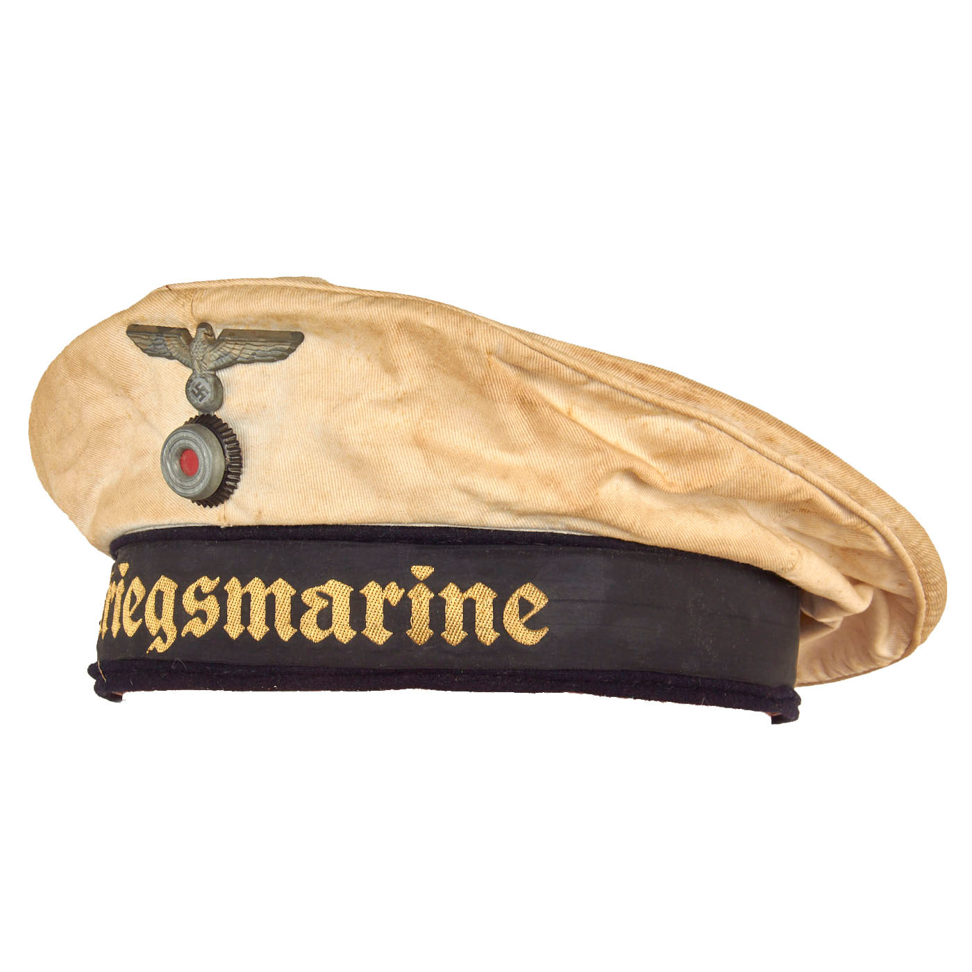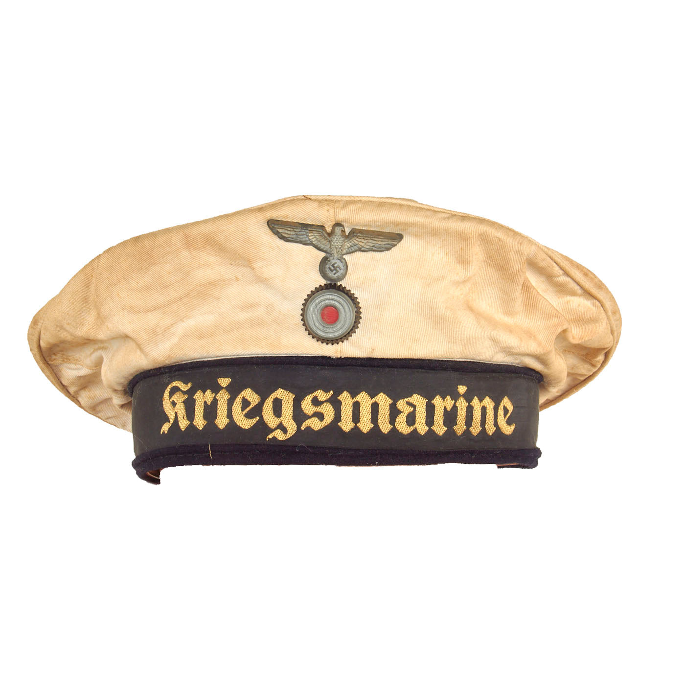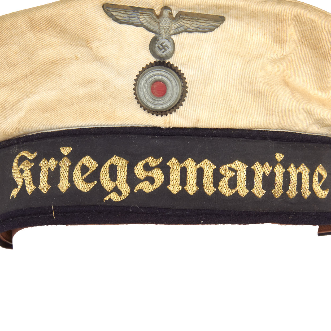 This basic design of the "Donald Duck" cap was popular worldwide, and used by many countries. These caps were worn by all Junior NCO's and enlisted men. It is made of white cotton body, with a dark blue wool band and is fitted with a black silk cap tally machine embroidered with the title Kriegsmarine in yellow thread. The tally is affixed by braided thread in two places at the rear, as is standard. The front of the cap bears a stickpin-style national eagle composed of brass over a metal tri-color cockade with a felt insert under the cockade. The eagle is of a grey alloy material.
