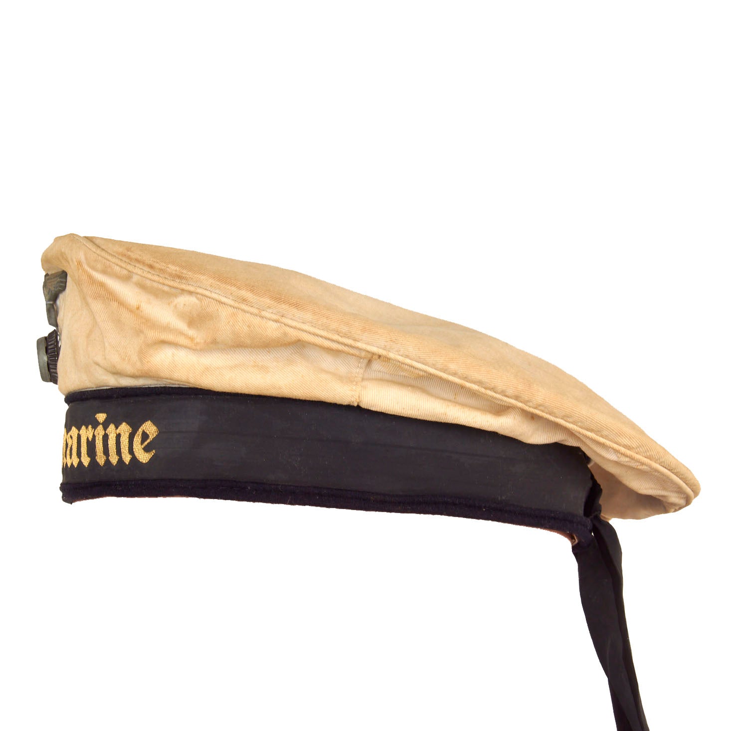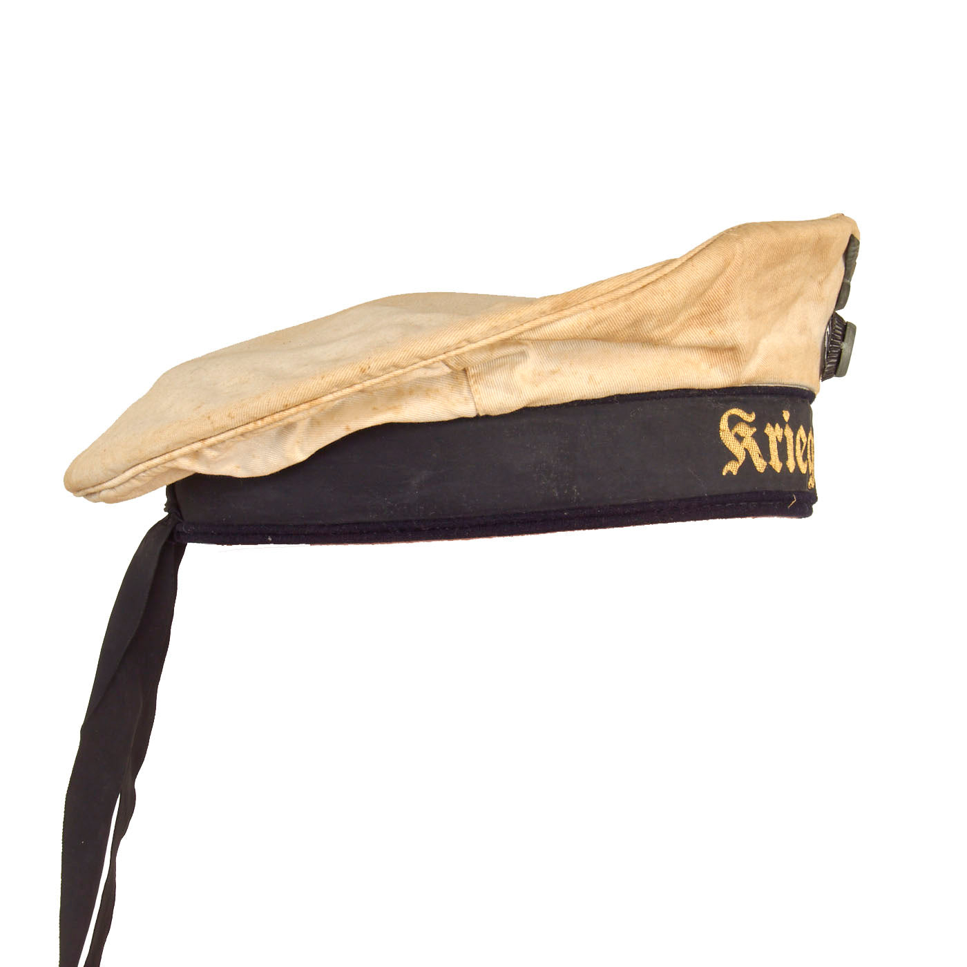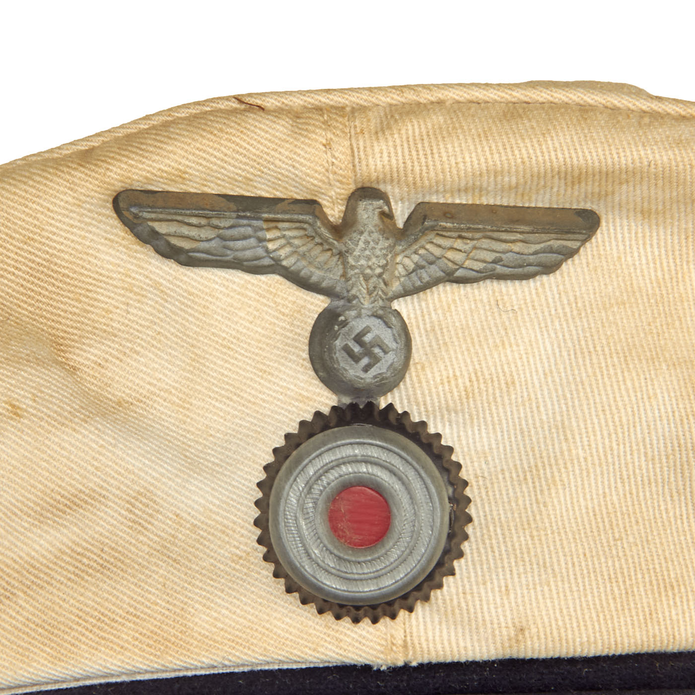 This basic design of the "Donald Duck" cap was popular worldwide, and used by many countries. These caps were worn by all Junior NCO's and enlisted men. It is made of white cotton body, with a dark blue wool band and is fitted with a black silk cap tally machine embroidered with the title Kriegsmarine in yellow thread. The tally is affixed by braided thread in two places at the rear, as is standard. The front of the cap bears a stickpin-style national eagle composed of brass over a metal tri-color cockade with a felt insert under the cockade. The eagle is of a grey alloy material.