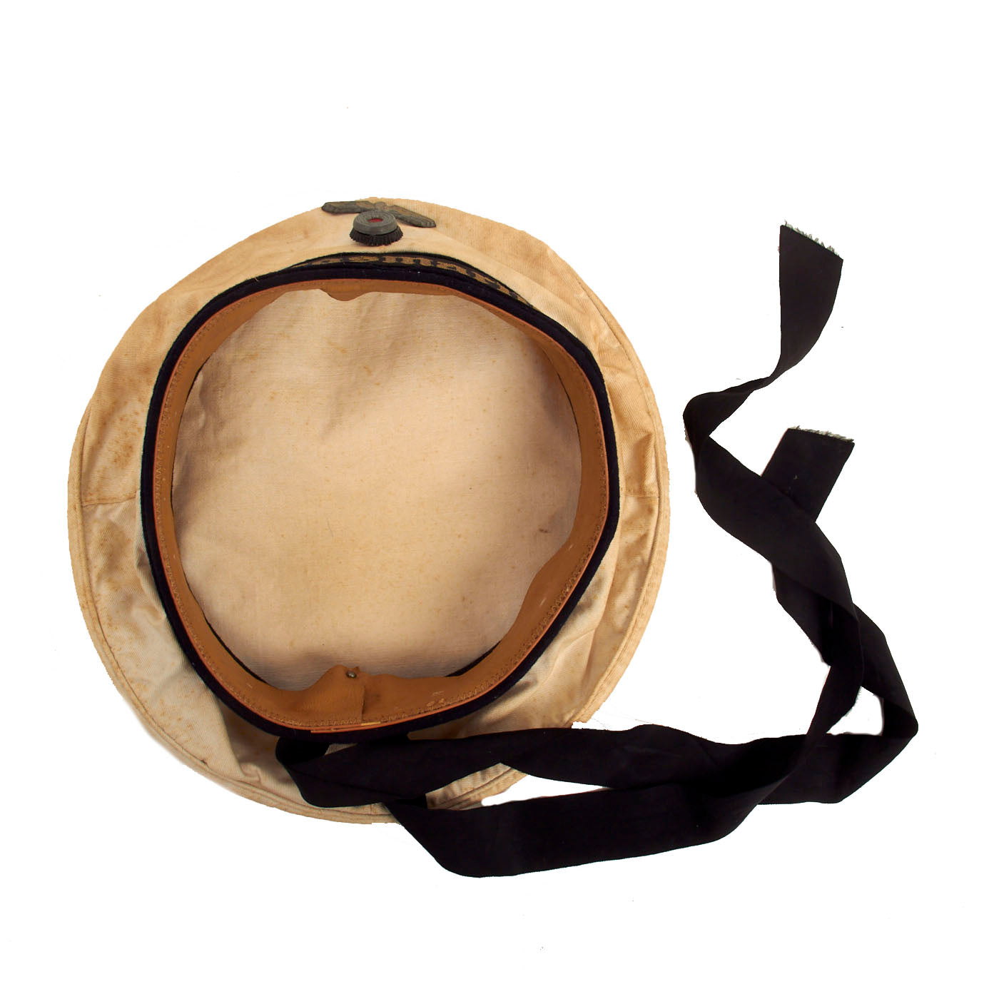 Overall the cap is in very good condition, with a great service worn look. This was not a cap that spent the war in a depot. There are some stitched repairs on the side of the crown, as well as some light discoloration/staining to the white top.