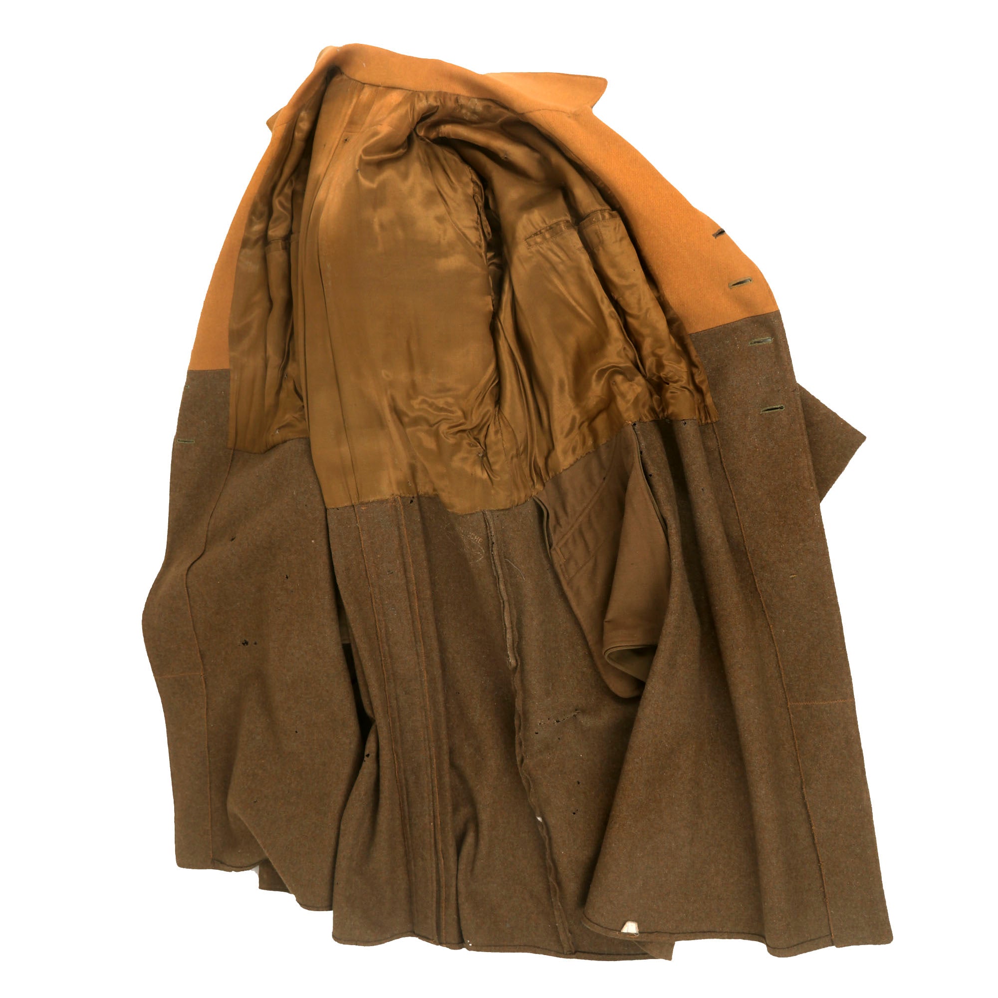 This is an excellent condition German WWII Brown Wool Mantel, usually called a greatcoat or overcoat, as used by the NSDAP. It is constructed with an outer shell of heavy brown wool, and is definitely intended for the colder time of year. The interior is lined on the top with brown twill fabric, with what looks to be black brushed cotton in the sleeves. The collar is of a much brighter near-orange color. The double breasted front closure features 5 pebbled NSDAP buttons on each side, all of which look to have RZM maker codes on the back. These are sewn directly to the fabric, and do show some pulling and deterioration of the stitching holding them in place. There is one spare button sitting in the interior pocket.