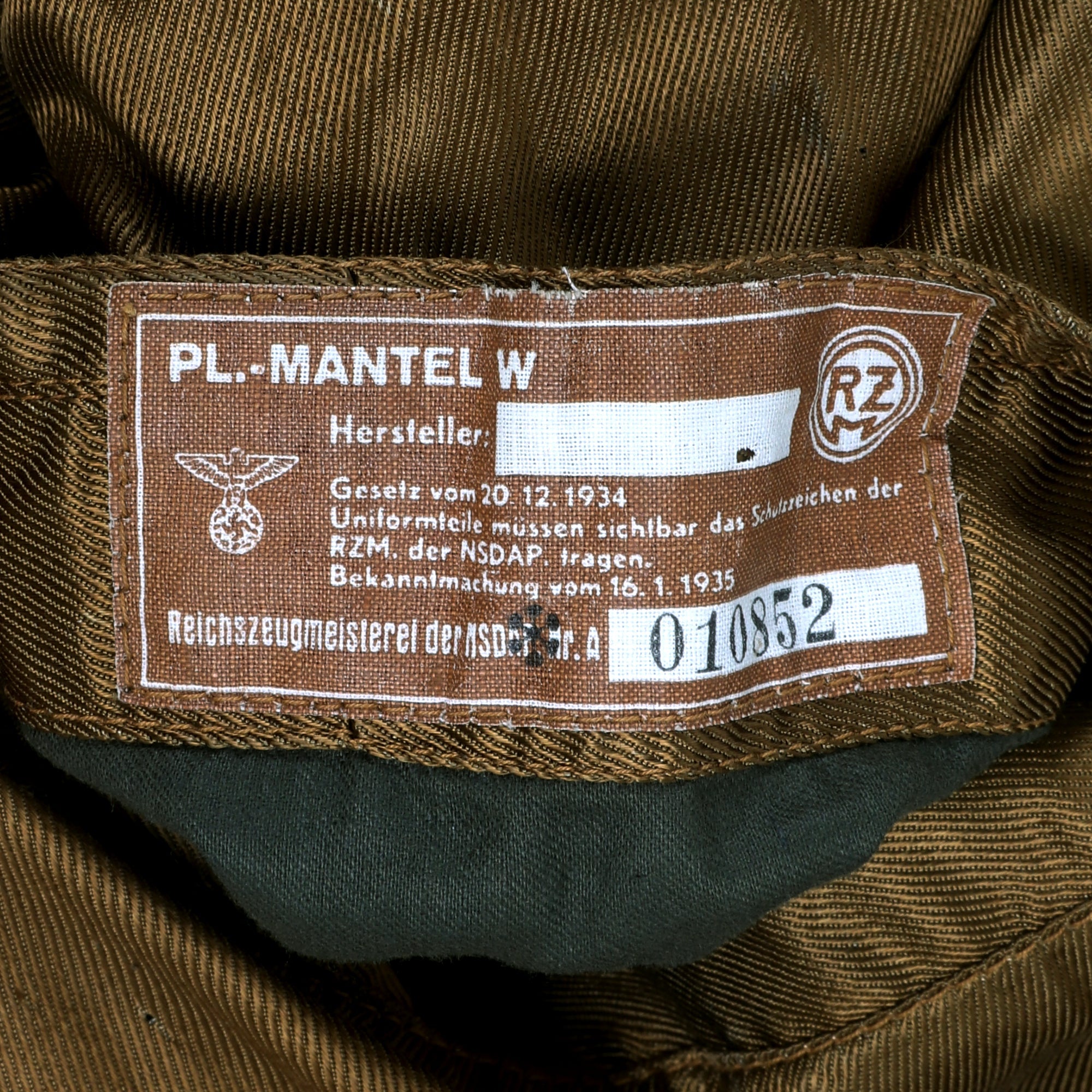 The inner left breast pocket still bears its original fabric RZM tag, which is also in great shape. The tag identifies the overcoat as an PL.-MANTEL W, and features the NSDAP logo on the left as well as the RZM logo on the right. The tag is not marked with an ink stamped numerical designation of the Hersteller (manufacturer), but there is a lot number, 010852. This example appears to have been intended for wear by members of the NSDAP, instead of both the NSDAP and SA.