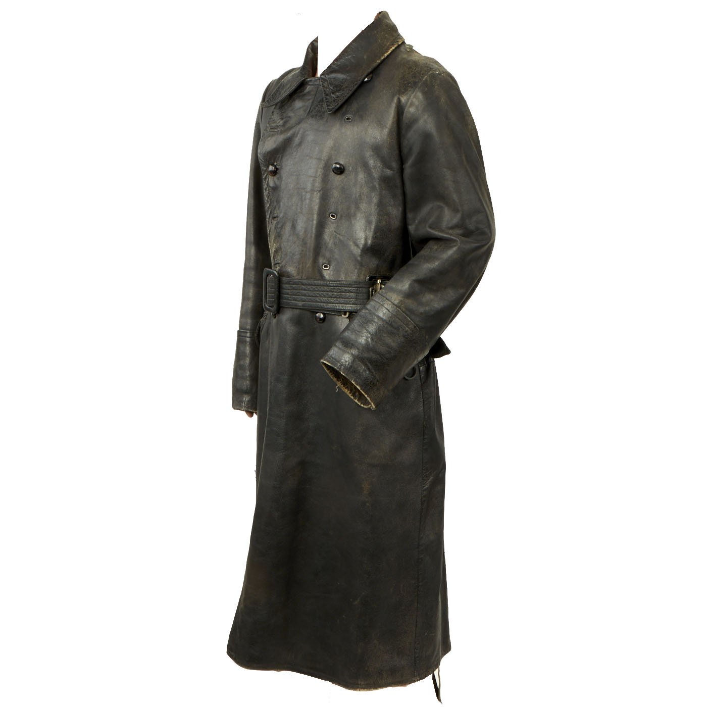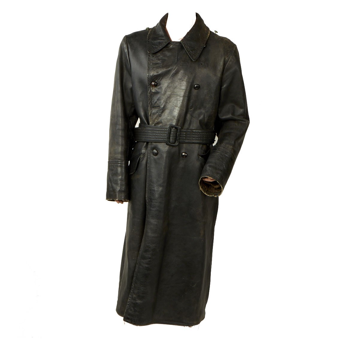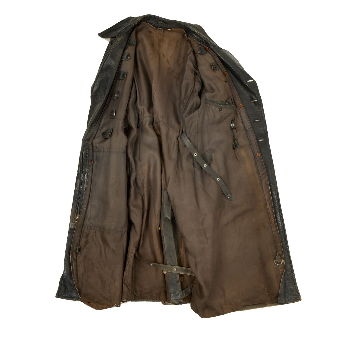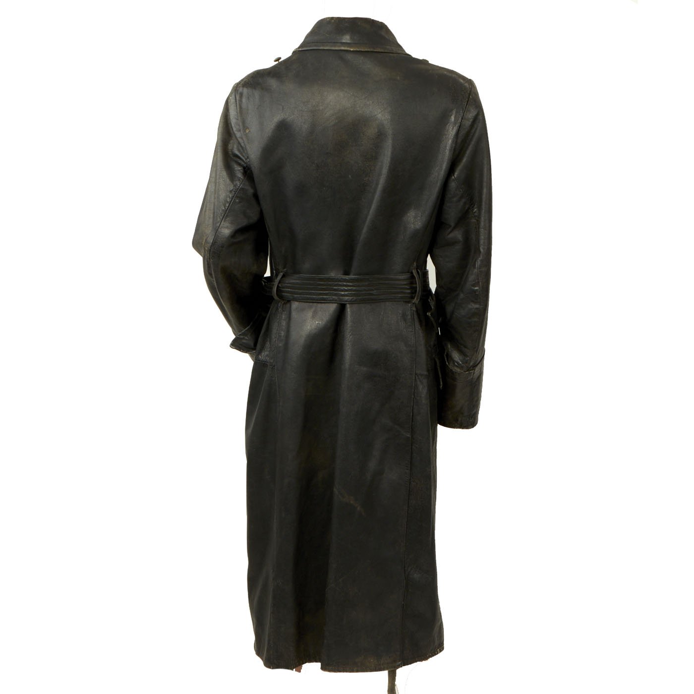 Original Item: Only One Available. This is a classic example of a WWII German Officer’s black leather great coat with military features. It is nicely broken in, showing a good amount of period wear.The coat had a removable liner which would have attached using integral snaps which are still present with the interior. The coat is secured with a belt at the waist, secured with a GRUTOS brand buckle. The Coat has eyelets for where to secure buttons on the front, allowing the wearer to alternate between button styles if need be. Several of the leather braided buttons, that are currently the stye on the coat, are missing.