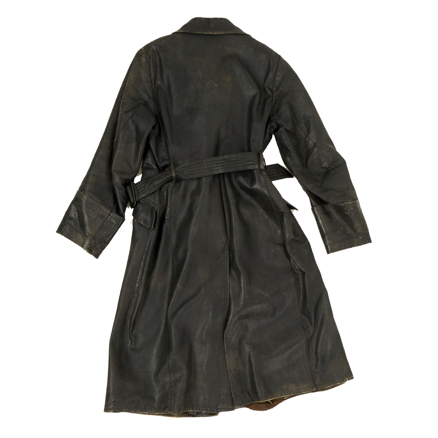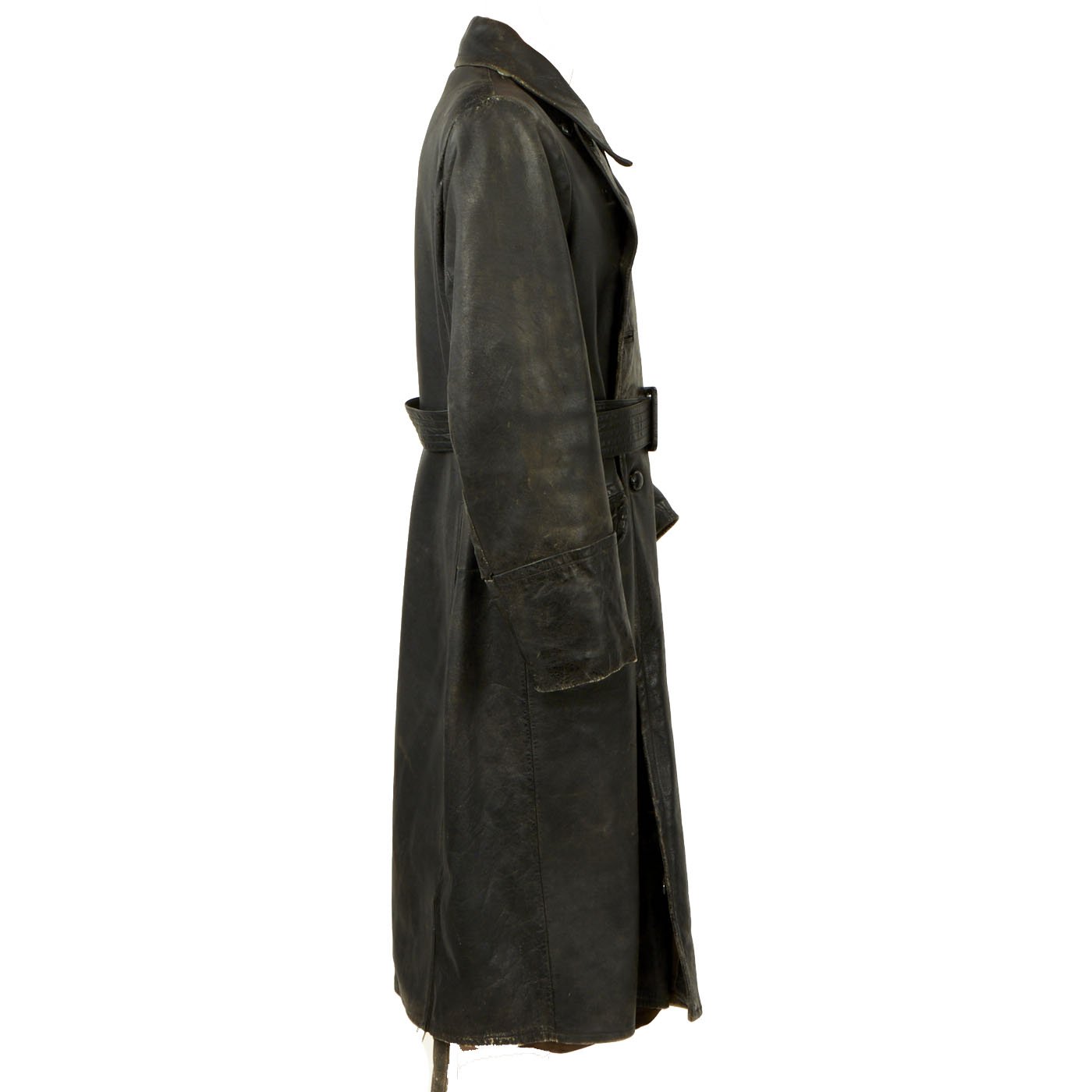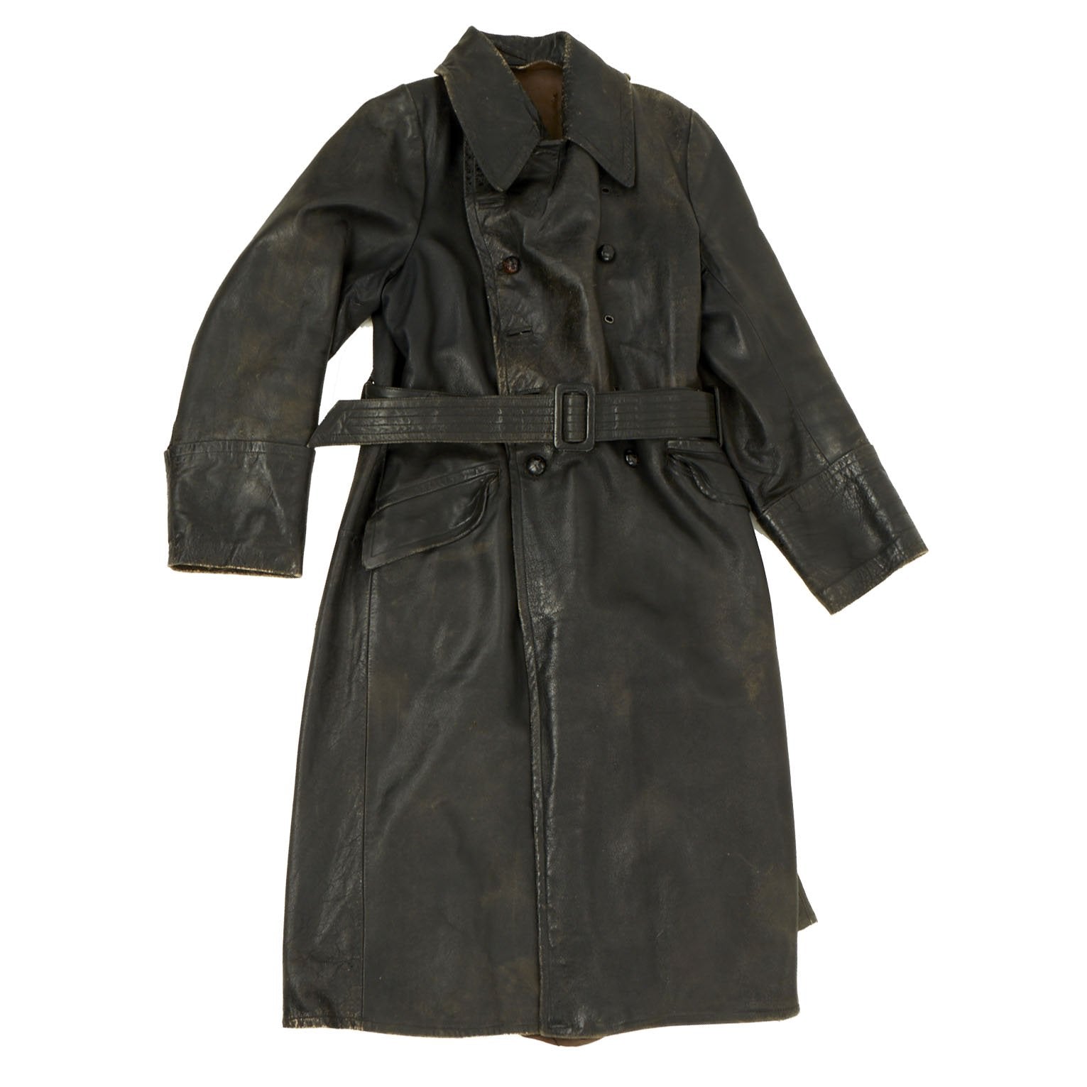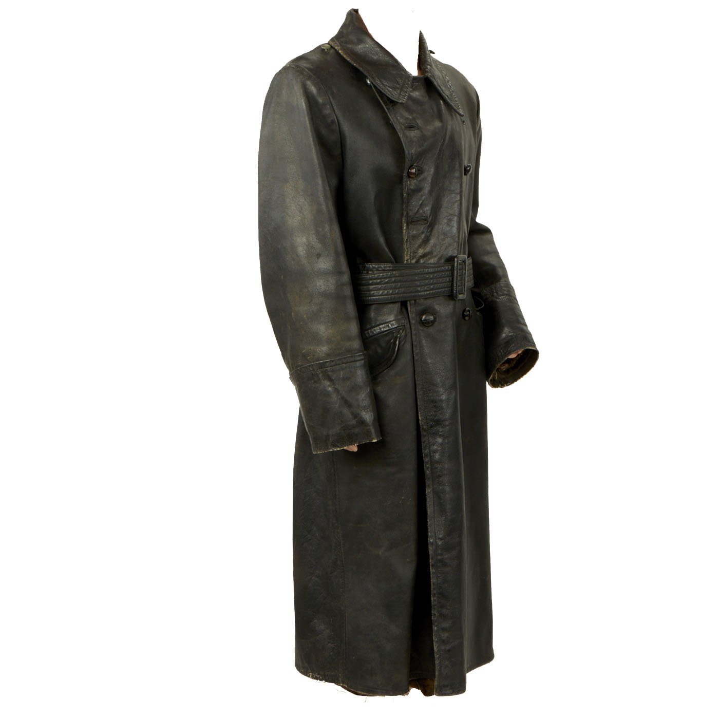 Original Item: Only One Available. This is a classic example of a WWII German Officer’s black leather great coat with military features. It is nicely broken in, showing a good amount of period wear.The coat had a removable liner which would have attached using integral snaps which are still present with the interior. The coat is secured with a belt at the waist, secured with a GRUTOS brand buckle. The Coat has eyelets for where to secure buttons on the front, allowing the wearer to alternate between button styles if need be. Several of the leather braided buttons, that are currently the stye on the coat, are missing.