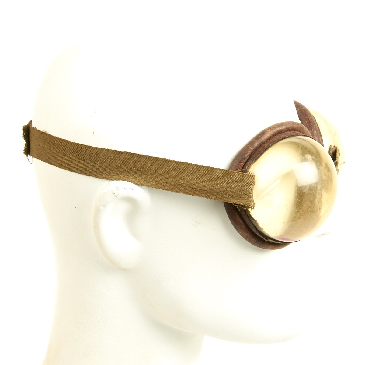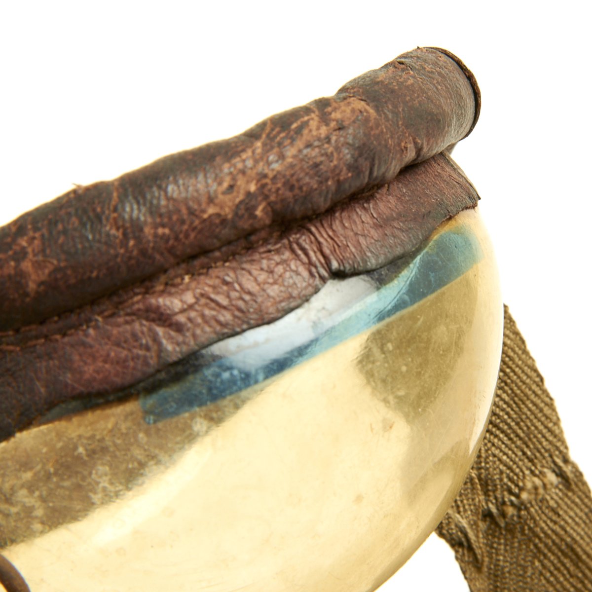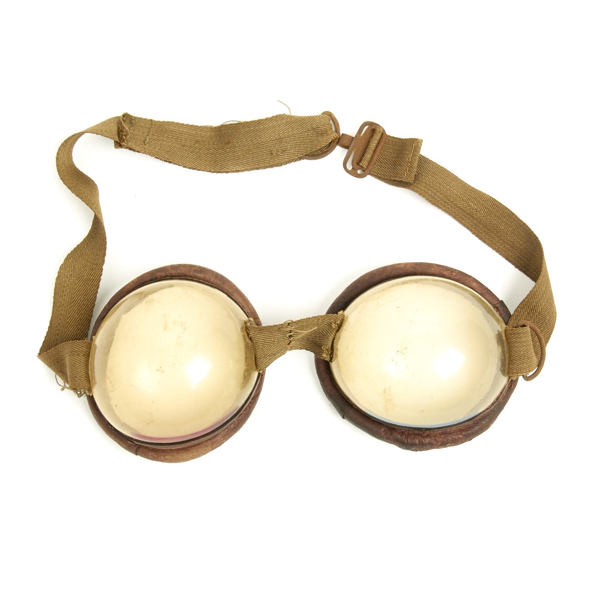 These goggles have large convex yellow tinted celluloid lenses. The strap is manufactured using a ribbed grey-green silken headbands to each side and for the nose piece. Features a classic German D-ring and hook closure. The lenses are lined with padded leather trim which are finely stitched.