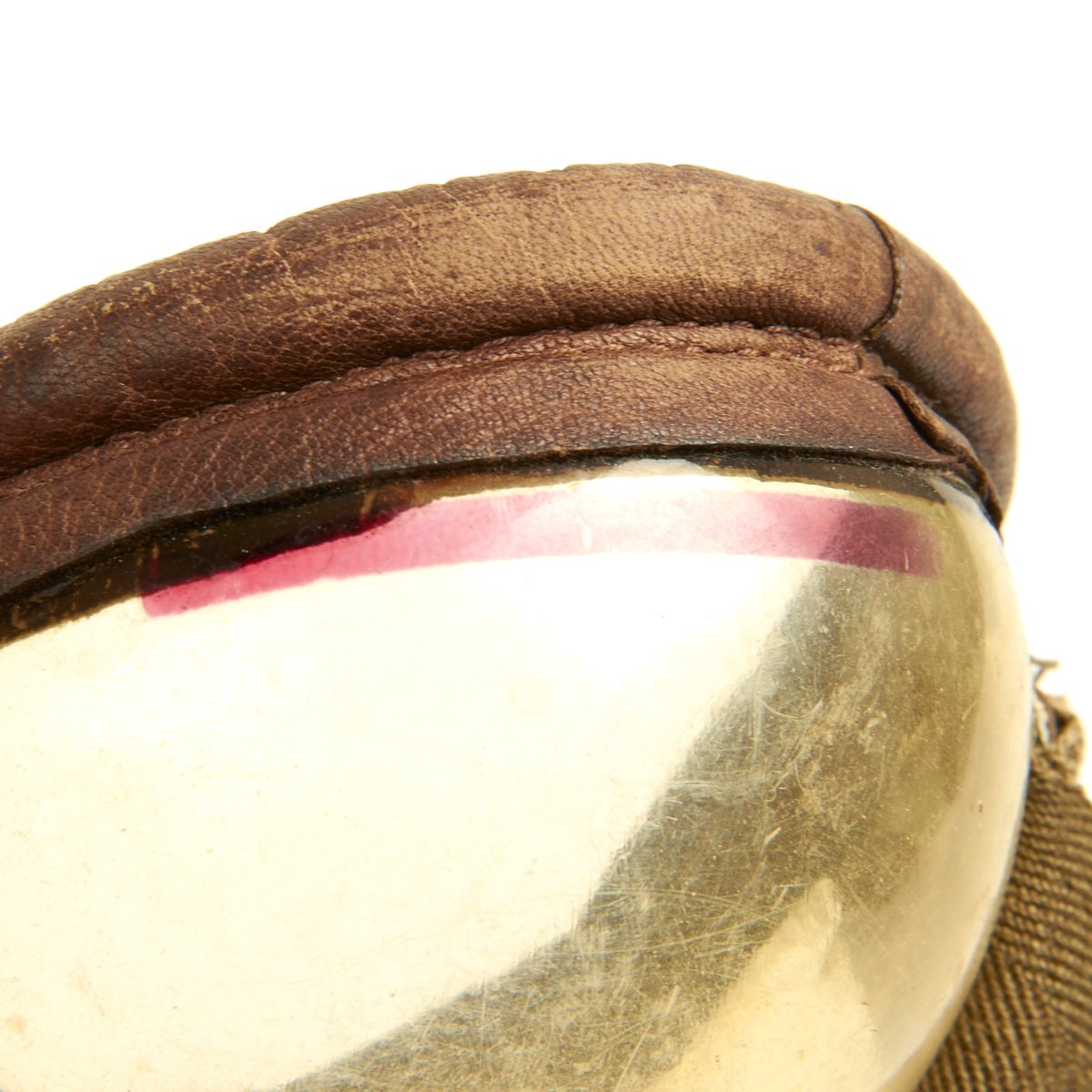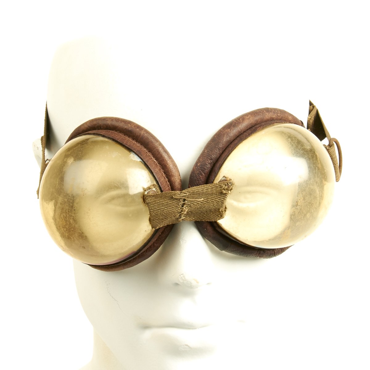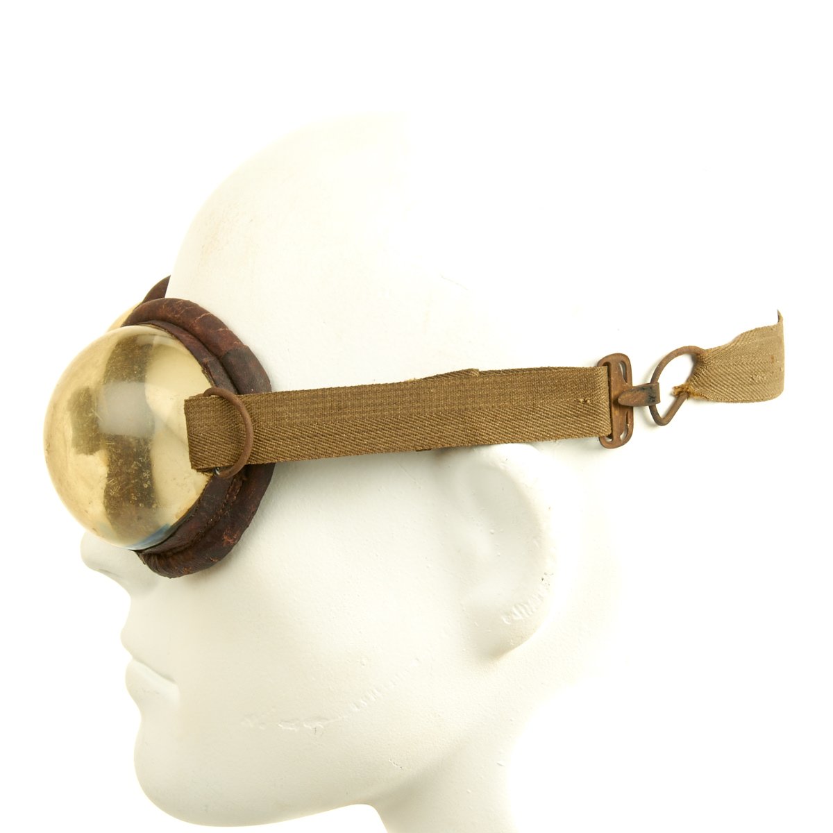 These goggles have large convex yellow tinted celluloid lenses. The strap is manufactured using a ribbed grey-green silken headbands to each side and for the nose piece. Features a classic German D-ring and hook closure. The lenses are lined with padded leather trim which are finely stitched.