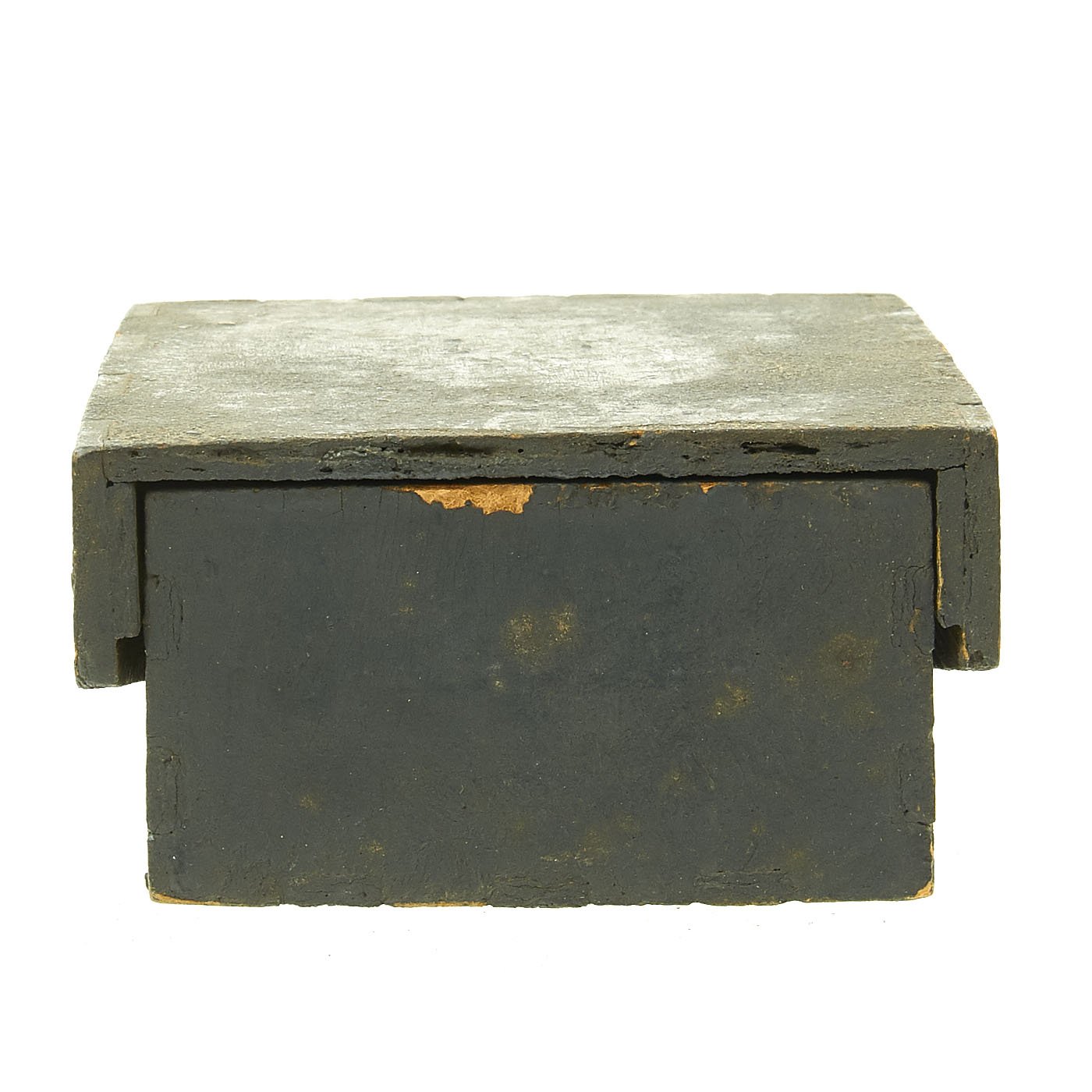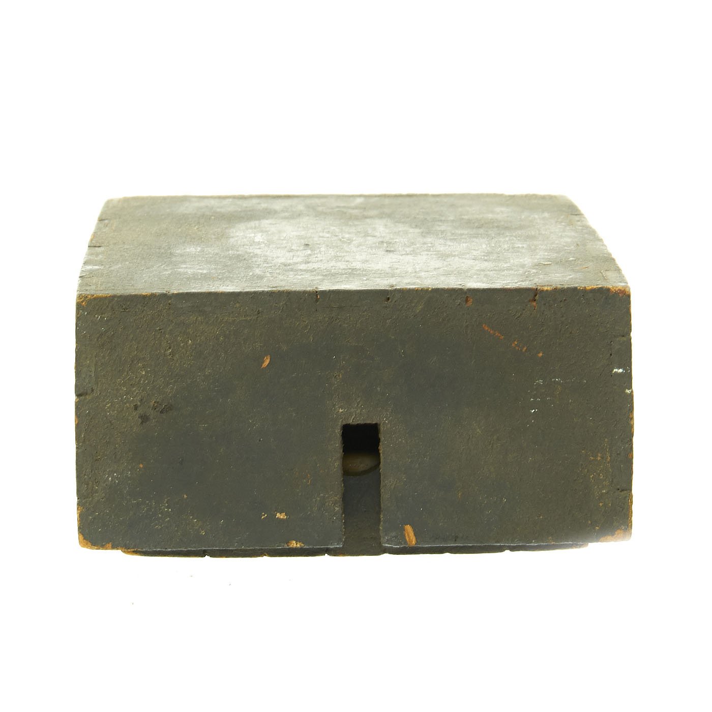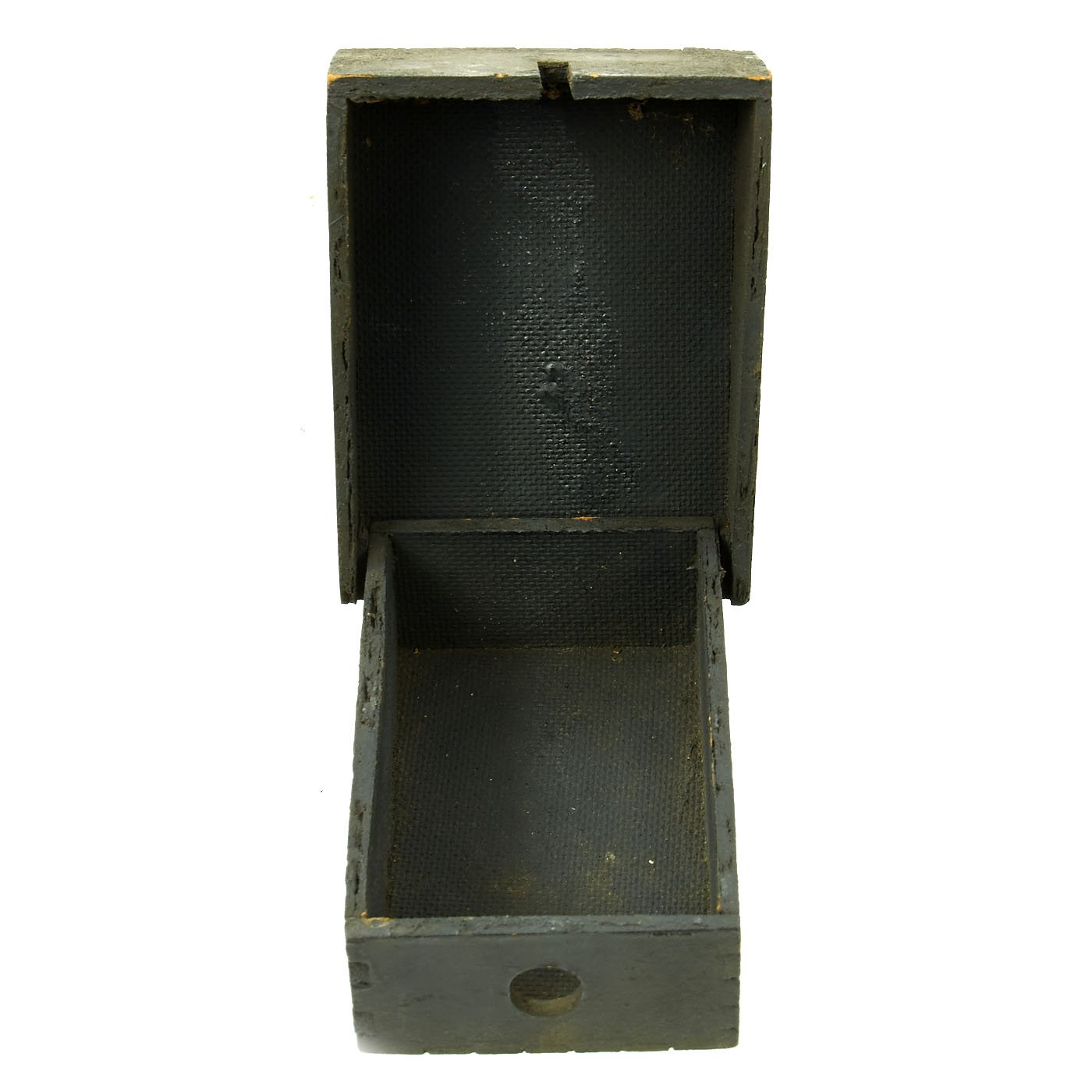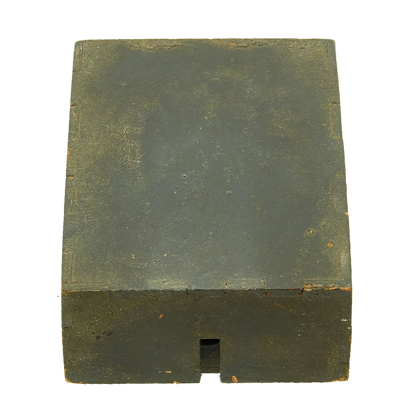 Original Item: Only One Available. This is a totally original WWII German produced inert Schützenmine 42. It measures approximately 5" x 4" x 3". What makes it particualry interesting is what is found inside the mine. A glass bottle which has a paper label taped to the screw cap that reads: Dirt From Mt. Veus Italy. Also inside the box are four smooth ocean stones and a note reads: Shoemine box Italy and a name. Clearly this was a USGI bring back, a memento of his time fighting the Germans during the U.S. invasion of Italy during Wolrd War Two.