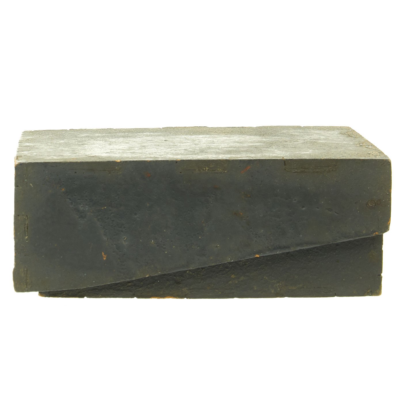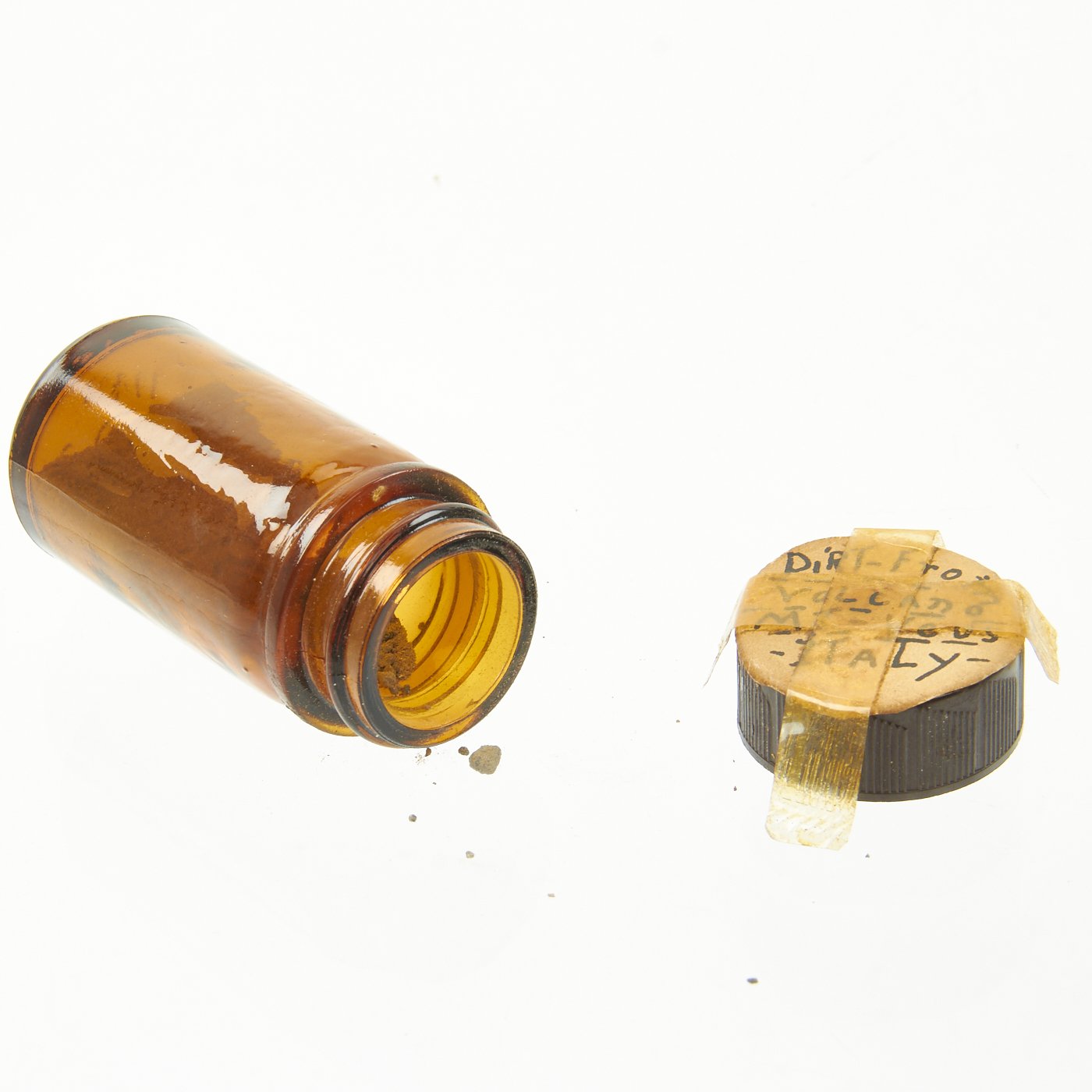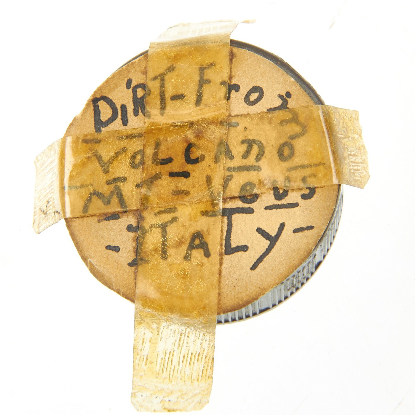 Original Item: Only One Available. This is a totally original WWII German produced inert Schützenmine 42. It measures approximately 5" x 4" x 3". What makes it particualry interesting is what is found inside the mine. A glass bottle which has a paper label taped to the screw cap that reads: Dirt From Mt. Veus Italy. Also inside the box are four smooth ocean stones and a note reads: Shoemine box Italy and a name. Clearly this was a USGI bring back, a memento of his time fighting the Germans during the U.S. invasion of Italy during Wolrd War Two.