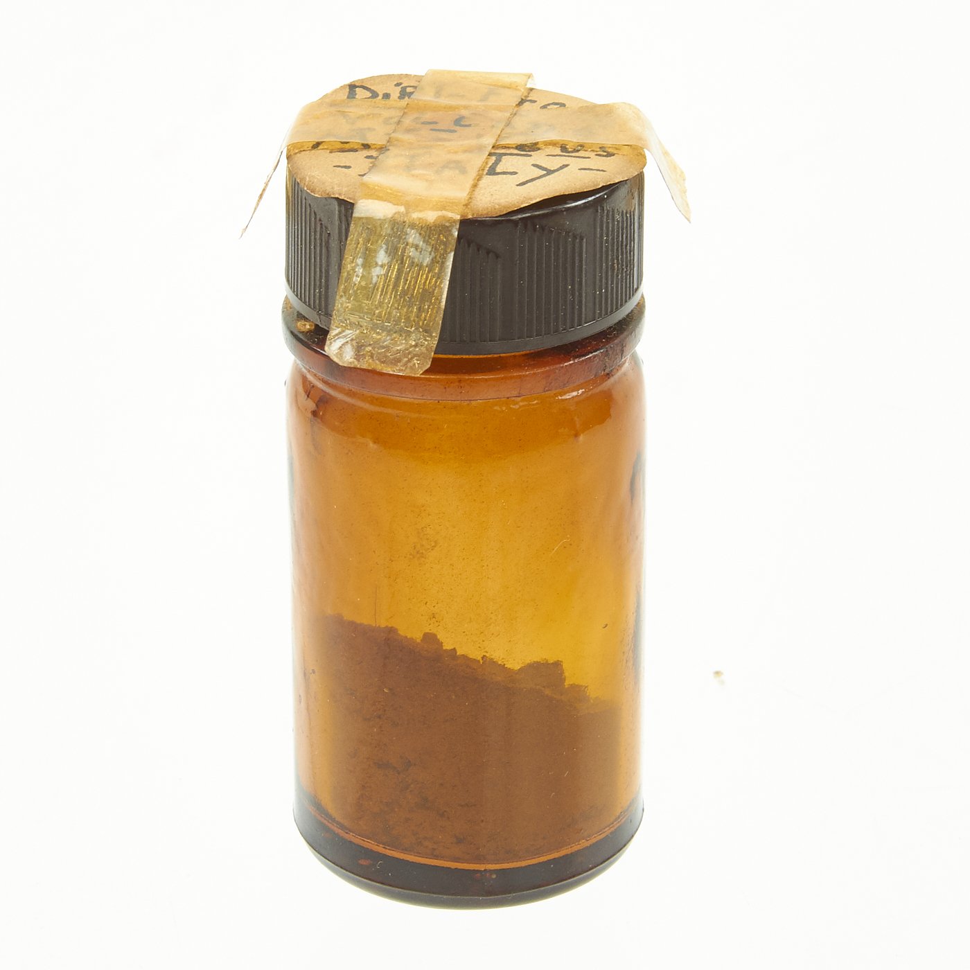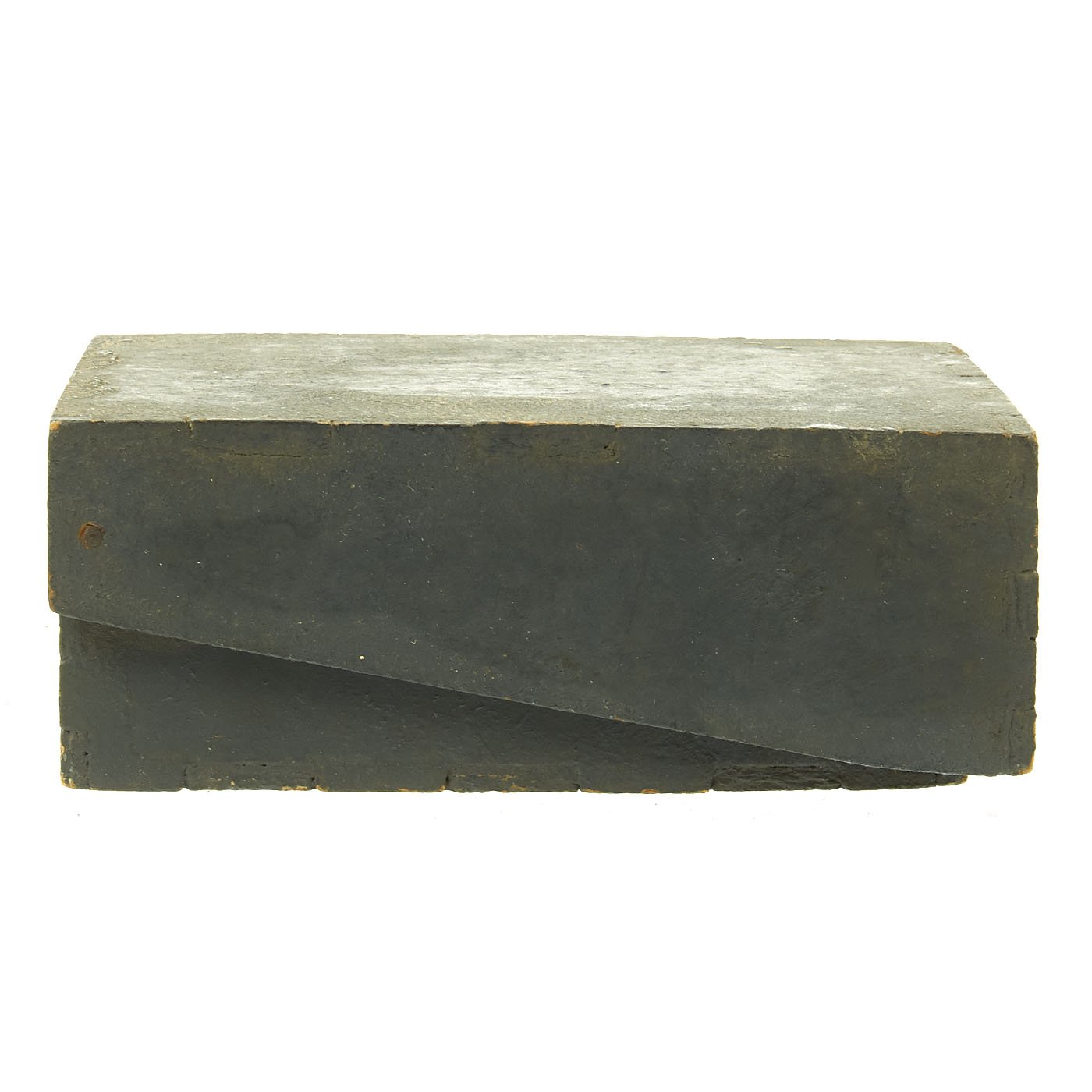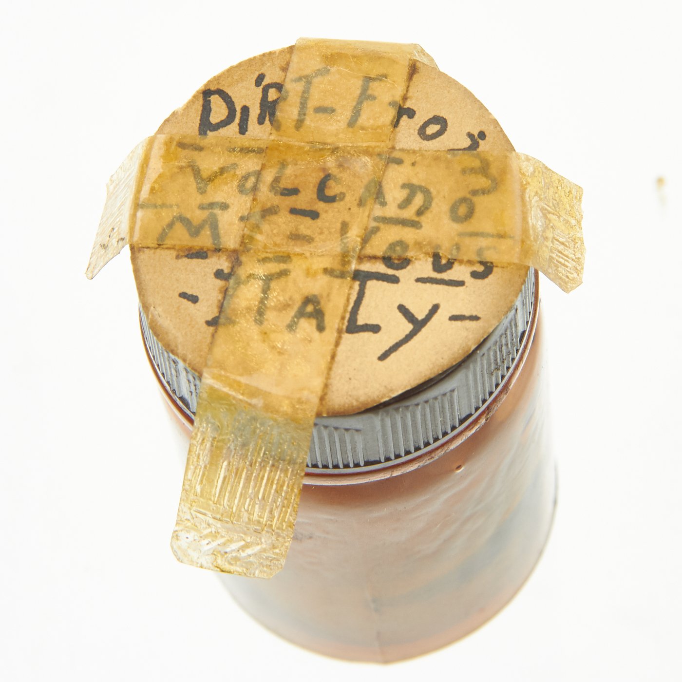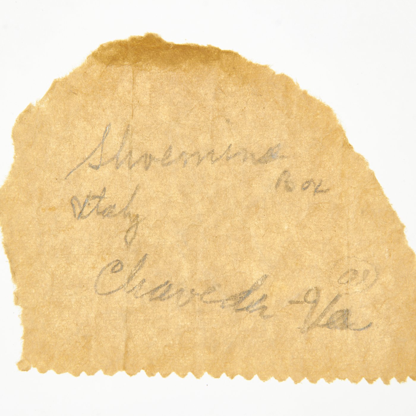 Original Item: Only One Available. This is a totally original WWII German produced inert Schützenmine 42. It measures approximately 5" x 4" x 3". What makes it particualry interesting is what is found inside the mine. A glass bottle which has a paper label taped to the screw cap that reads: Dirt From Mt. Veus Italy. Also inside the box are four smooth ocean stones and a note reads: Shoemine box Italy and a name. Clearly this was a USGI bring back, a memento of his time fighting the Germans during the U.S. invasion of Italy during Wolrd War Two.
