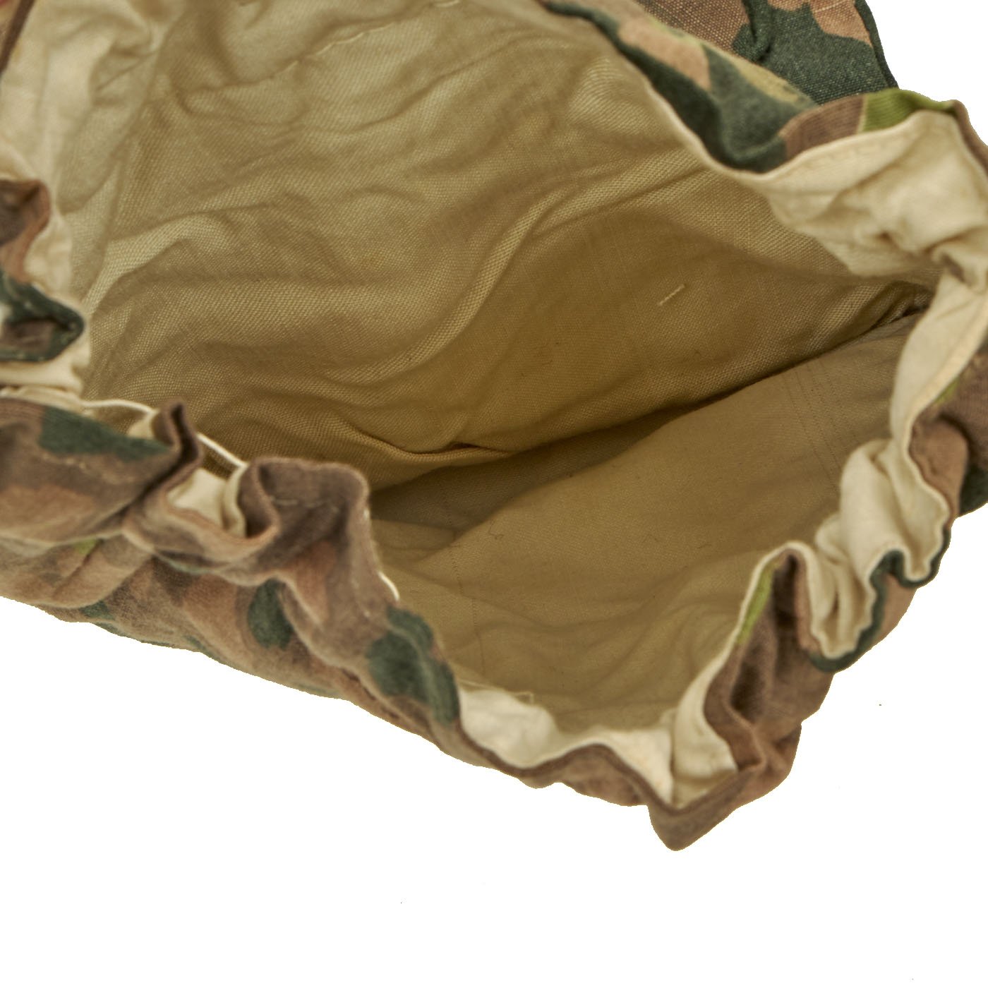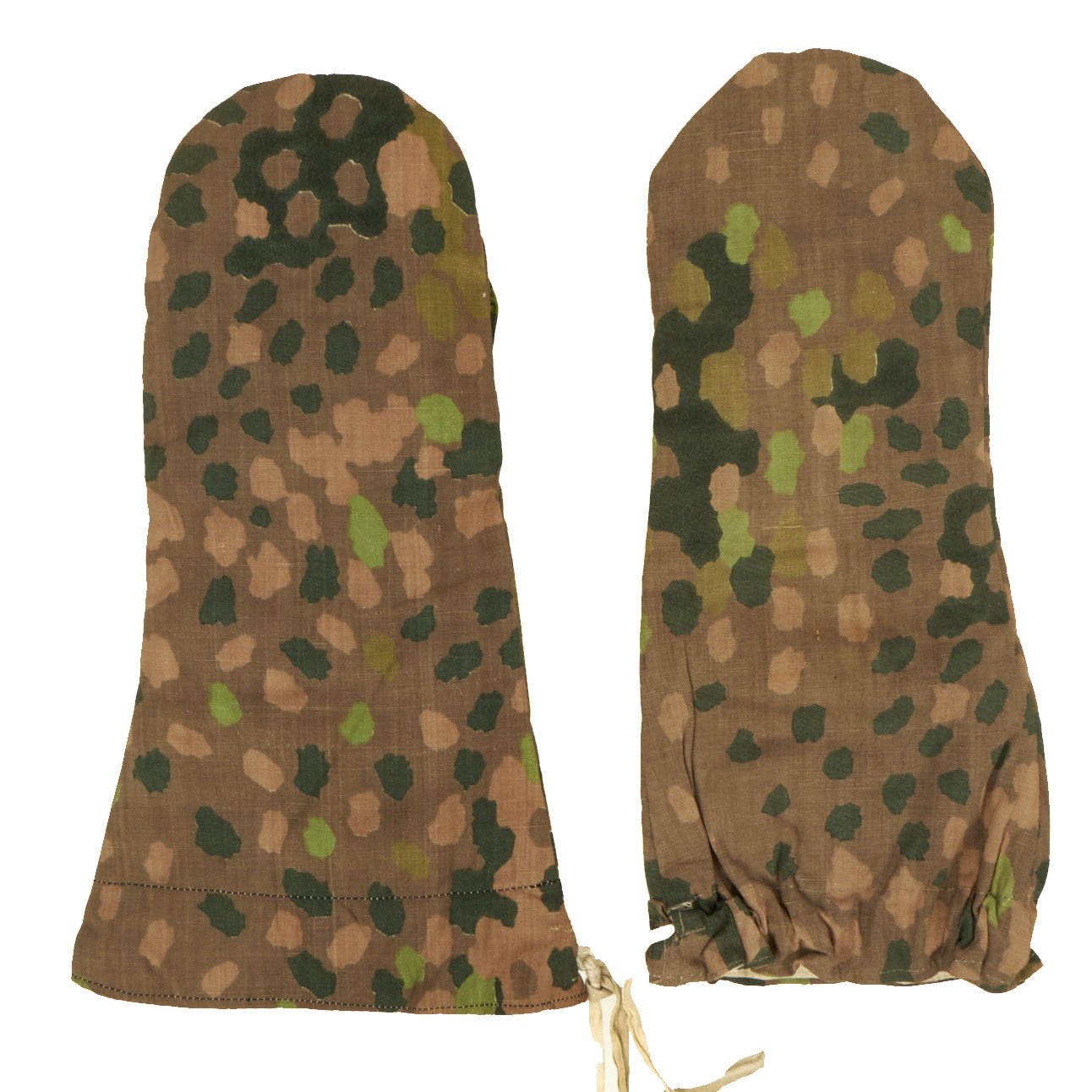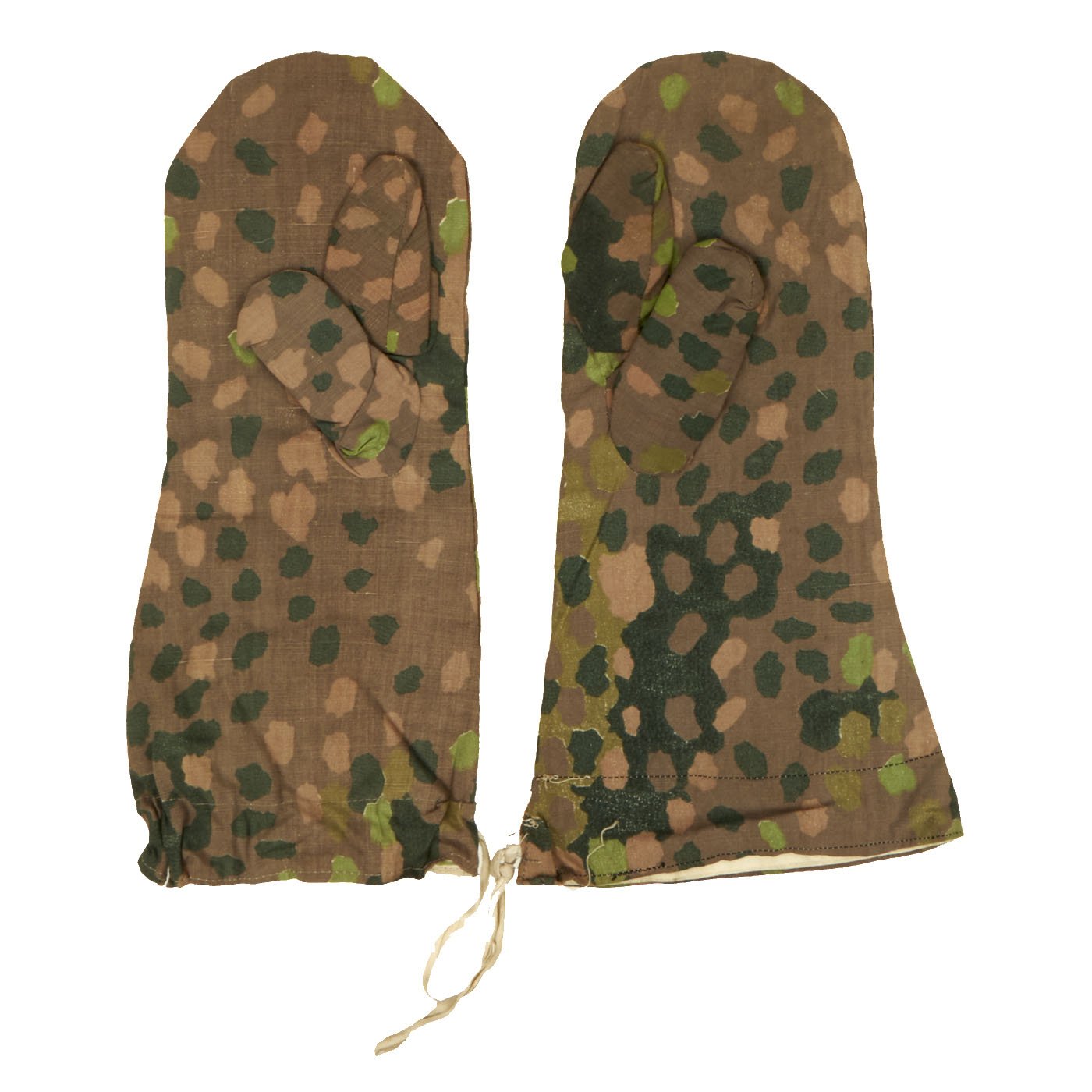 This is a lovely set of genuine unissued WWII German SS later war (1944-1945) Erbsenmuster (Pea Pattern) Camouflage Reversible Winter Uniform Parka Mittens. These gloves were produced in various camouflage and solid color exteriors and were made to match the various German Army winter parkas, trousers and hood garments. These parka mittens feature trigger finger, neck cord and are reversible from camouflage side to white. Offered in mint unissued condition. 100% genuine WWII German manufacture.