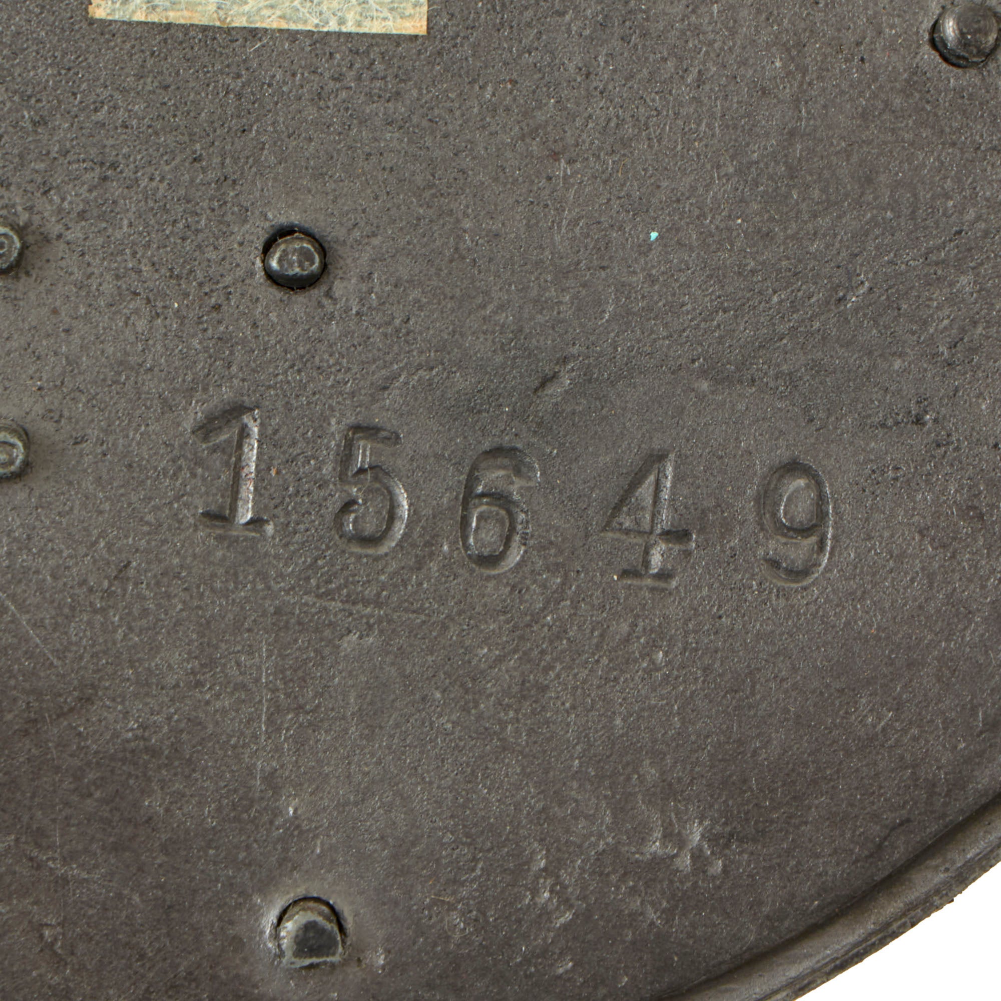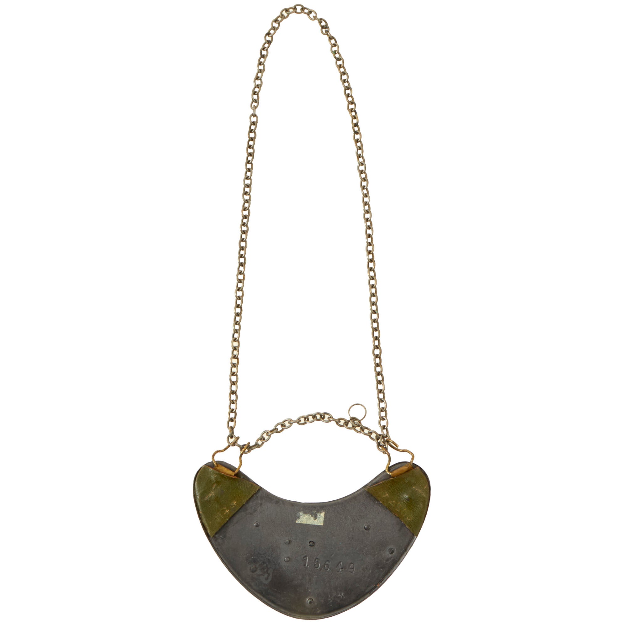 As made, these had three flat hooks on the back that would have a steel chain attached, very similar to the German Third Reich era gorgets. This allowed the gorget to be worn several different ways. This example however had all three of these flat hooks removed, and then new brass plated steel hooks installed on the top right and left. These have a non-magnetic chain installed, which is also a replacement, as it does not match the typical style used on these Hungarian gorgets, which was very similar to the German style. These were usually issued without any type of backing cloth, but some green leather was attached on the back to cover the rivets for the hooks. There is also the serial number 15649 deeply stamped into the back, as well as remnants of an adhesive label.
