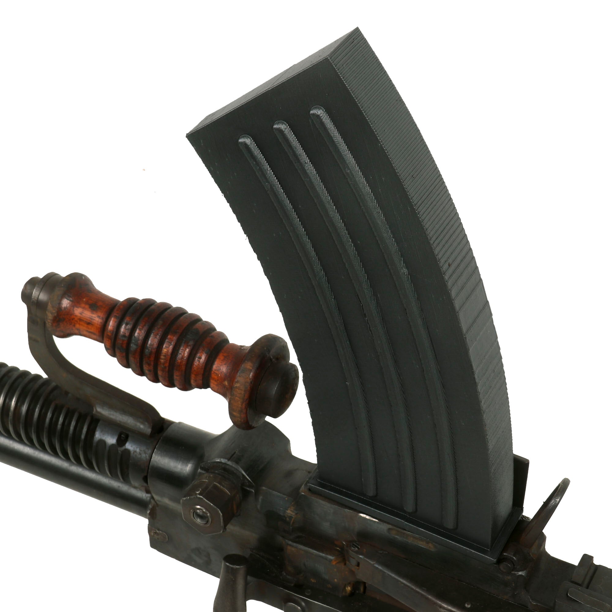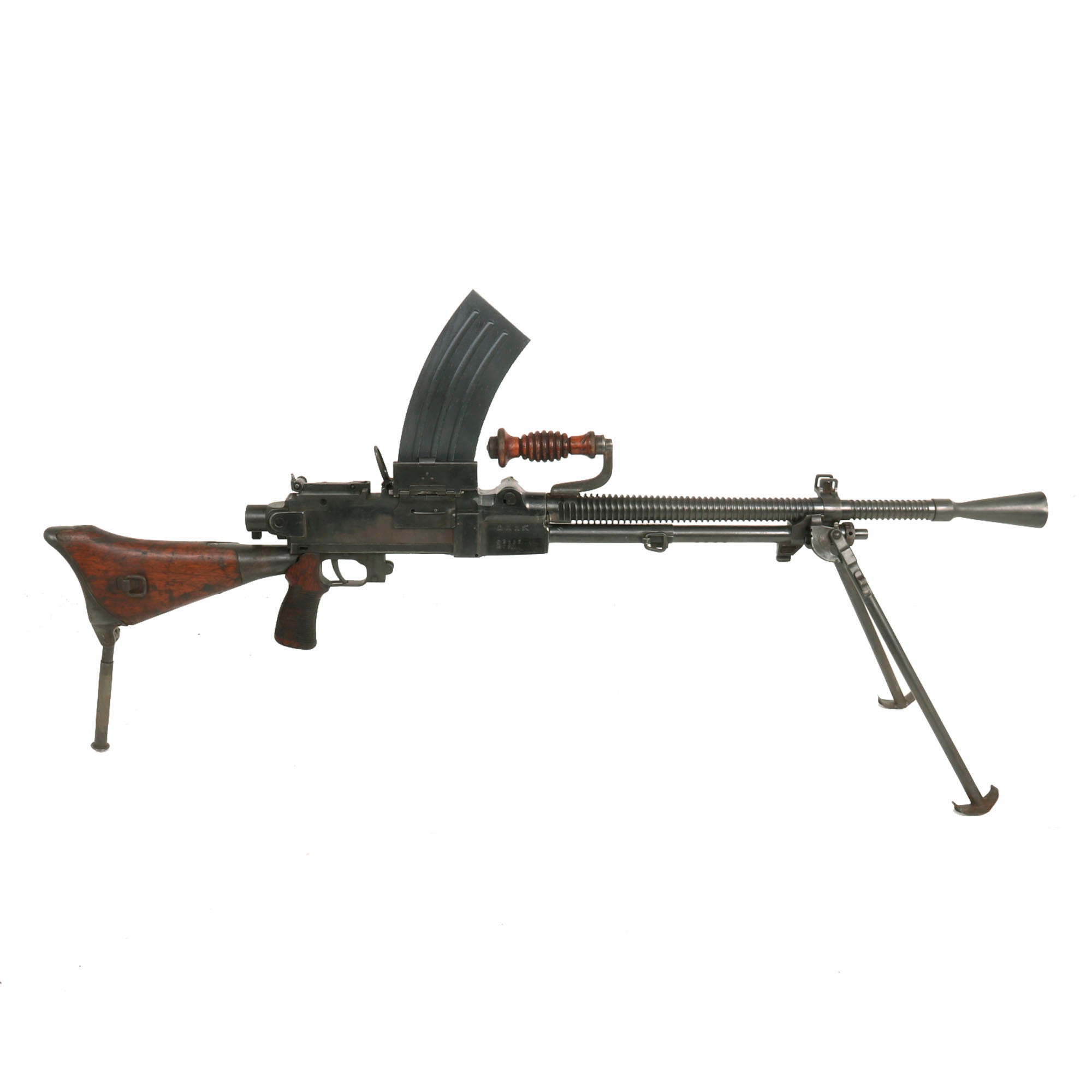 The Type 99 was developed in 1939 as a replacement for the Type 96 LMG and fired the new, heavier 7.7mm Japanese cartridge. These weapons proved to be very successful throughout the war by all the Japanese forces and were used on all the Japanese held islands and mainland China. They are very similar in appearance to the British Bren gun in that they have a top mounted curved box magazine, a forward mounted folding bipod, and a new quick change, finned barrel that featured a top mounted carrying handle. These were a well made machine gun that featured all machined parts with a hard wood buttstock and pistol grip.