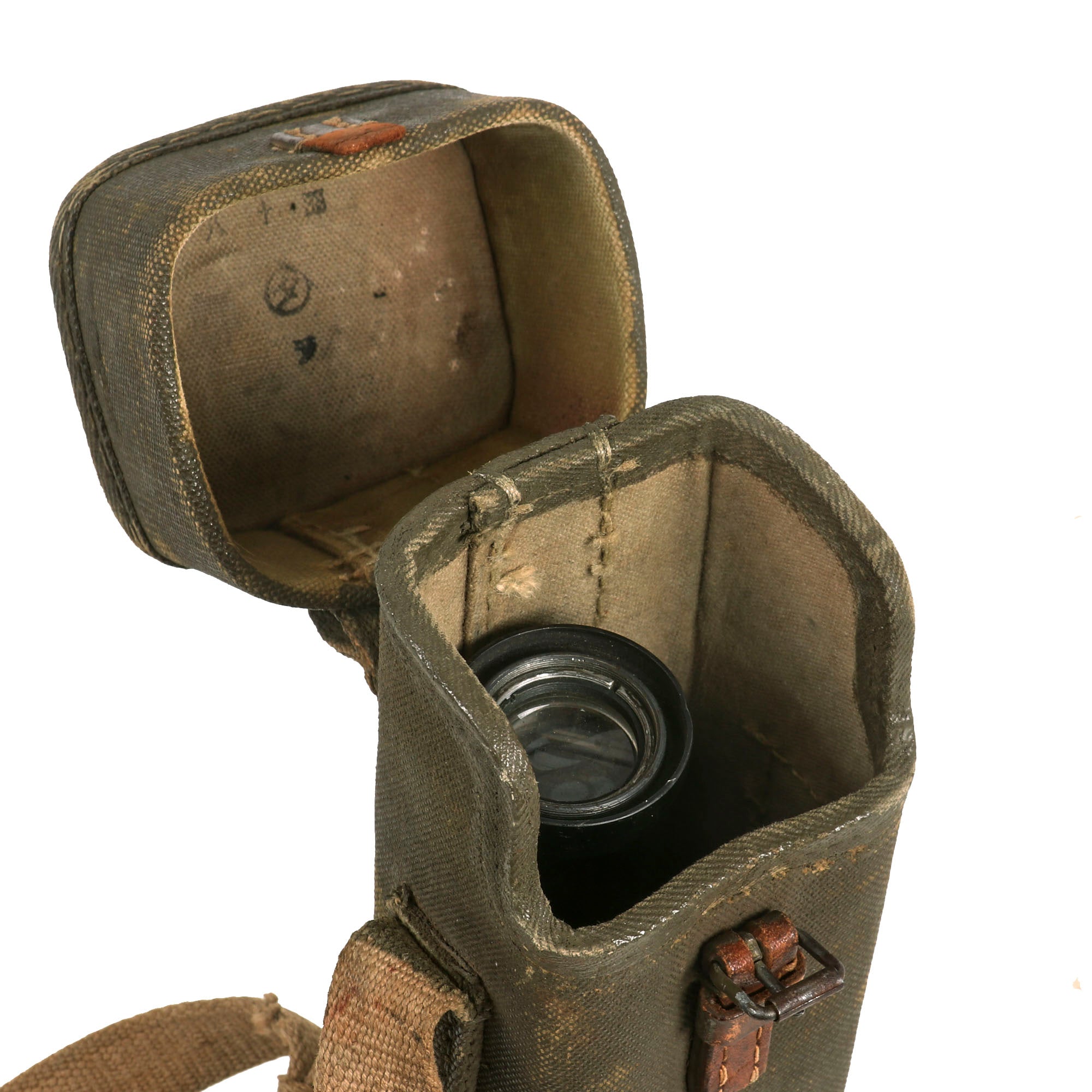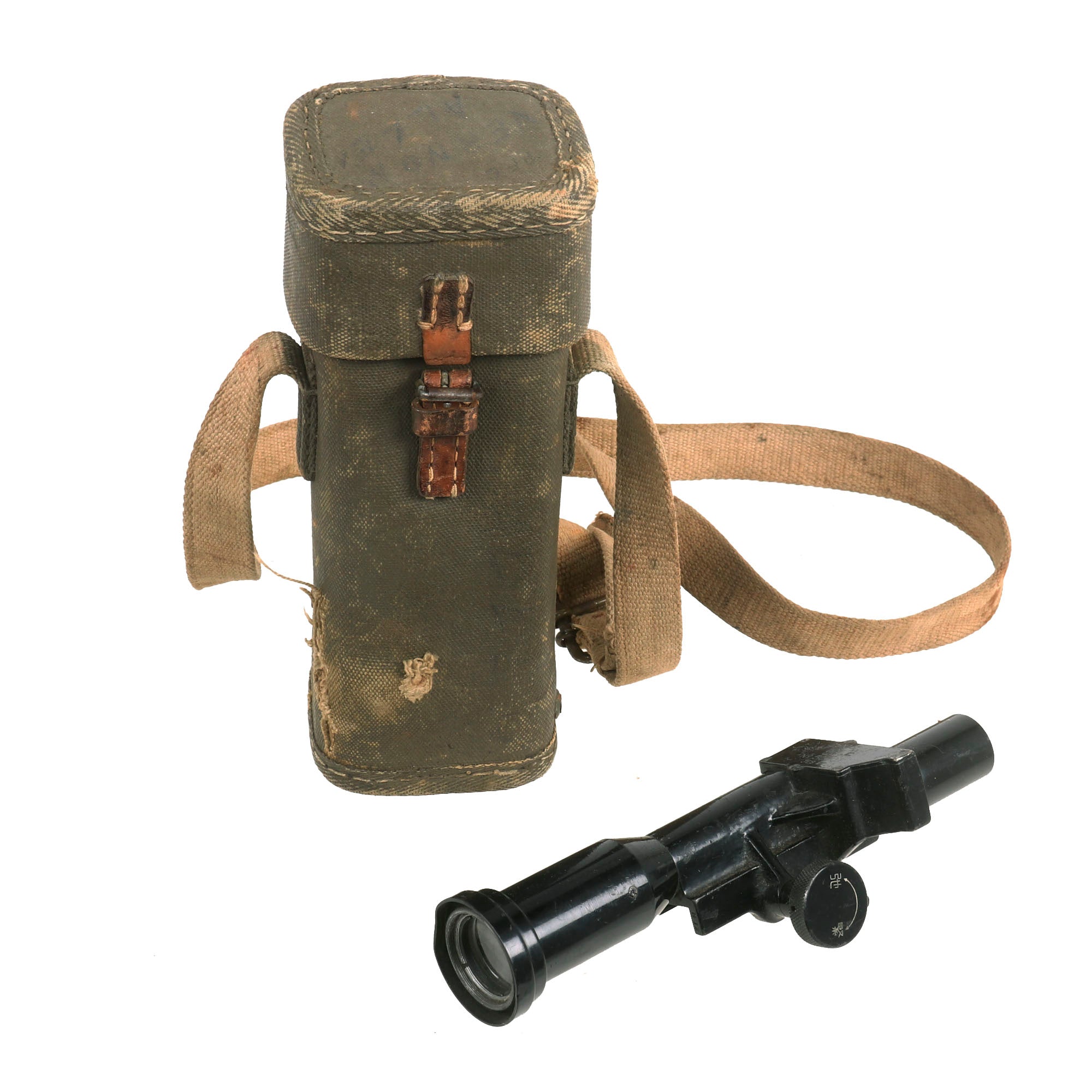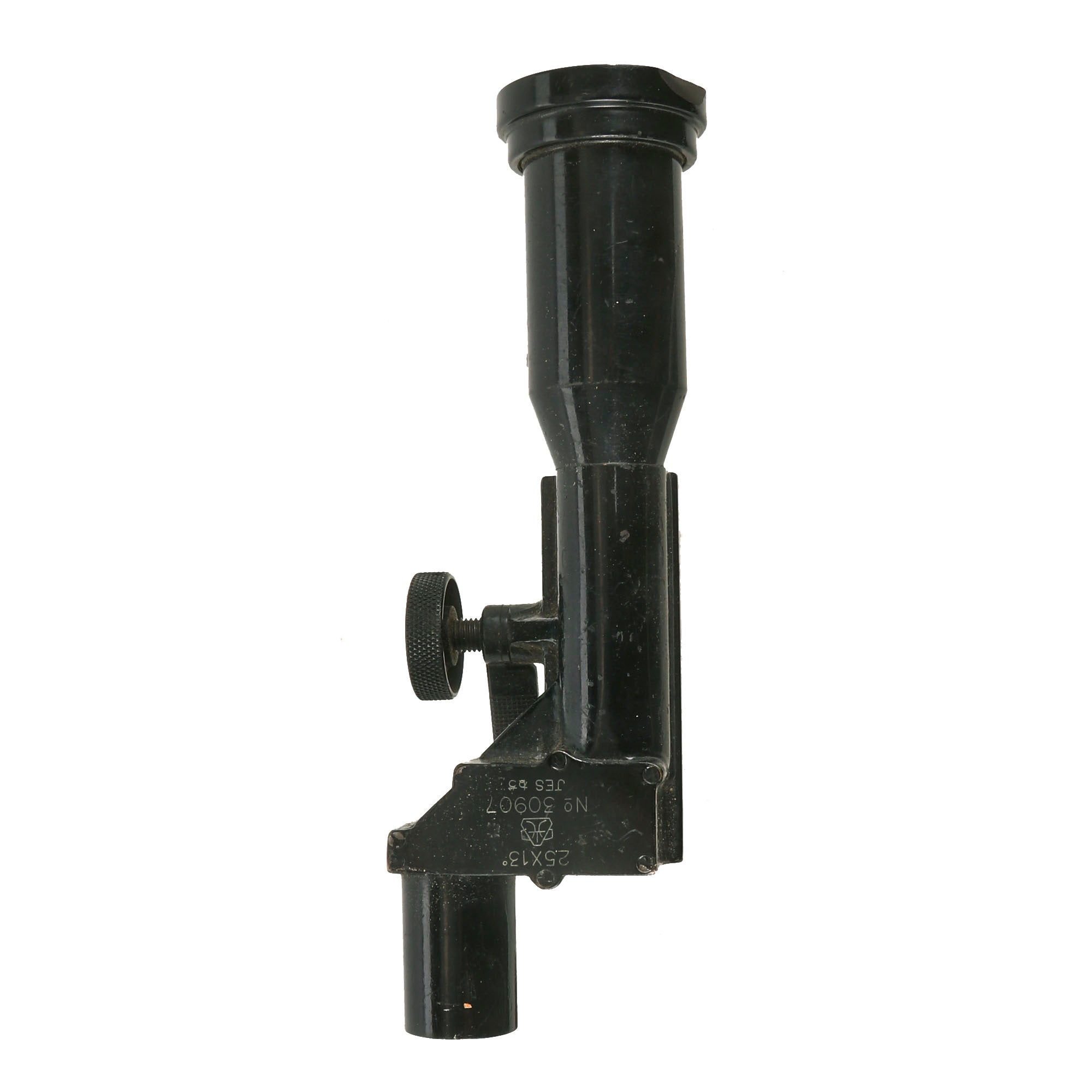 This 2.5X13° sight is in good, functional condition with almost all of the original black paint present. It is marked with serial number No.30907 just below the maker marking, which we were not able to identify. They also have a small J.E.S. ねぢ mark, which means that it was made under "Japanese Engineering Standards". The lenses are still clear and without damage with a visible range finding reticle. The included carry case is in wonderful, field used condition, and is dated 昭 十 八 (SHOWA 18) or 1943 on the interior lid.