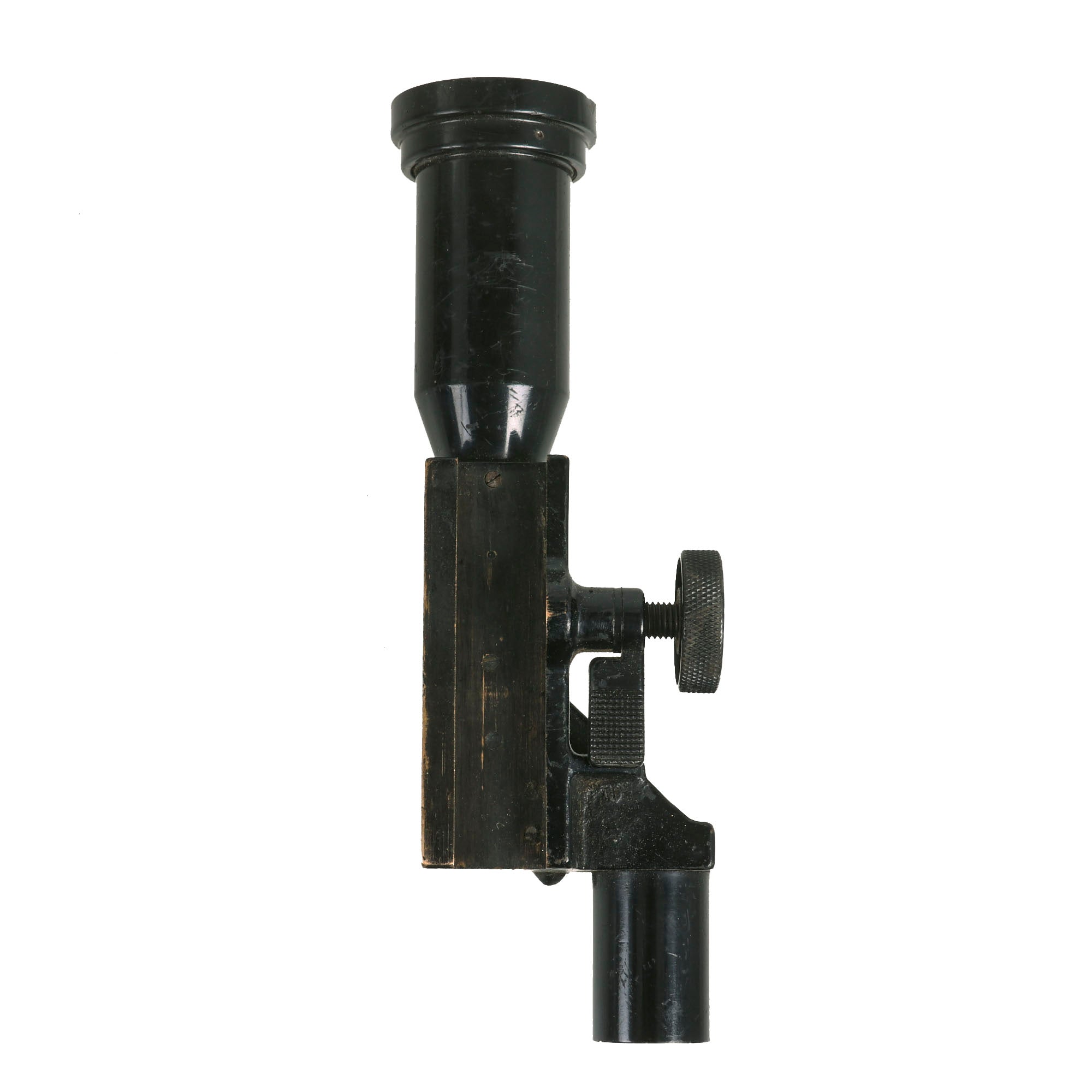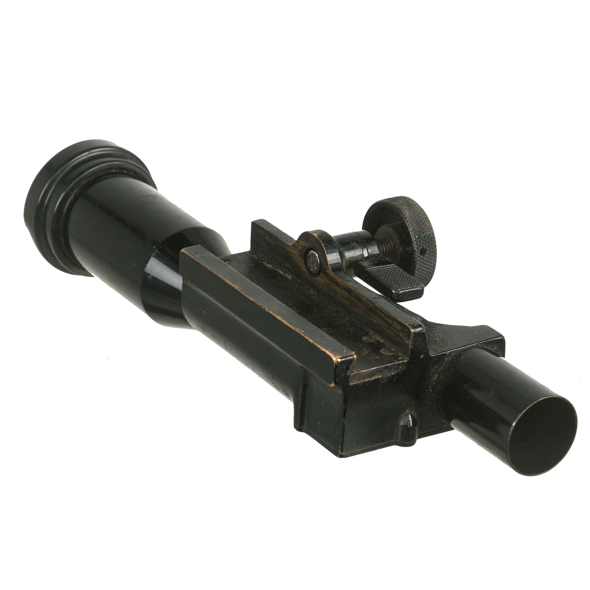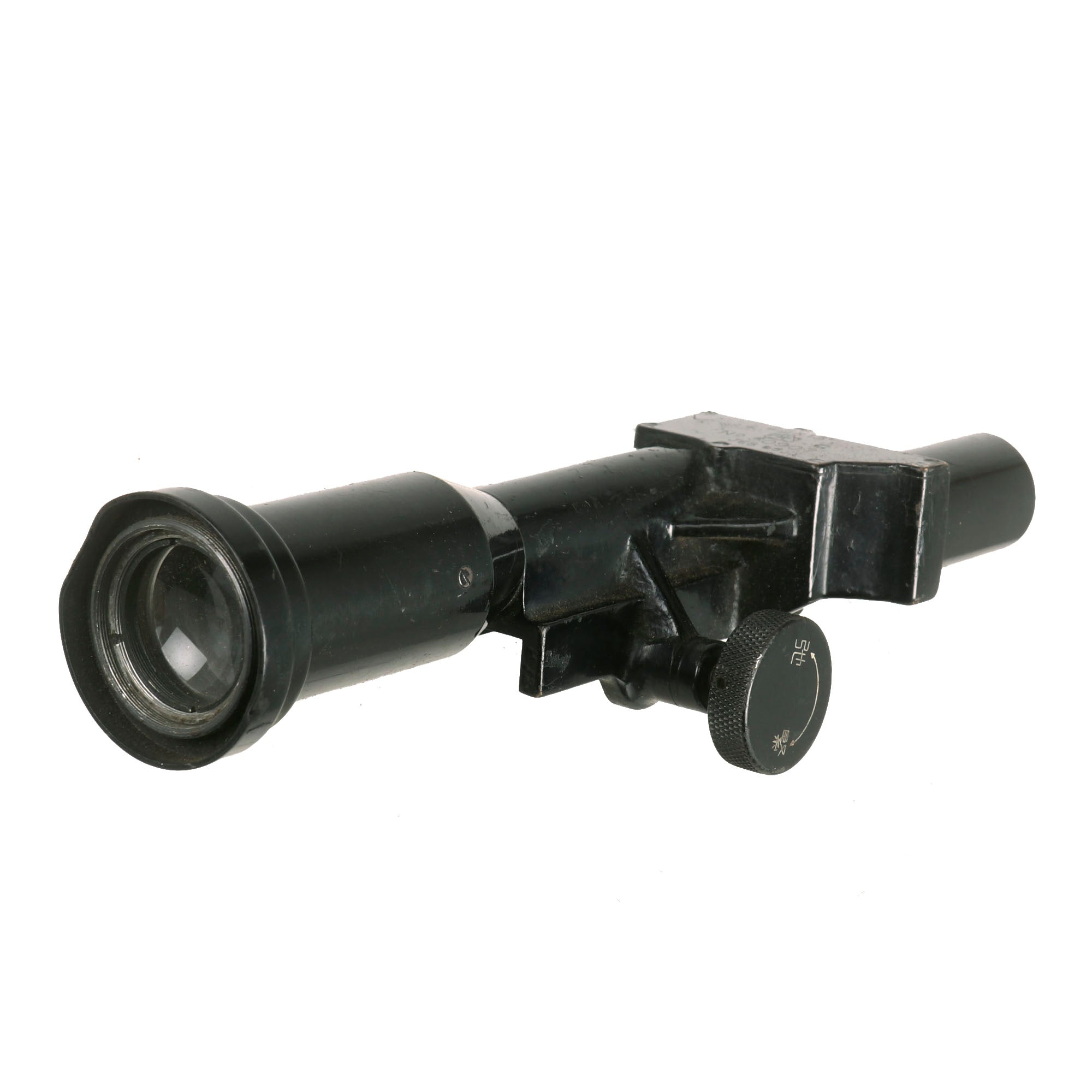 This 2.5X13° sight is in good, functional condition with almost all of the original black paint present. It is marked with serial number No.30907 just below the maker marking, which we were not able to identify. They also have a small J.E.S. ねぢ mark, which means that it was made under "Japanese Engineering Standards". The lenses are still clear and without damage with a visible range finding reticle. The included carry case is in wonderful, field used condition, and is dated 昭 十 八 (SHOWA 18) or 1943 on the interior lid.
