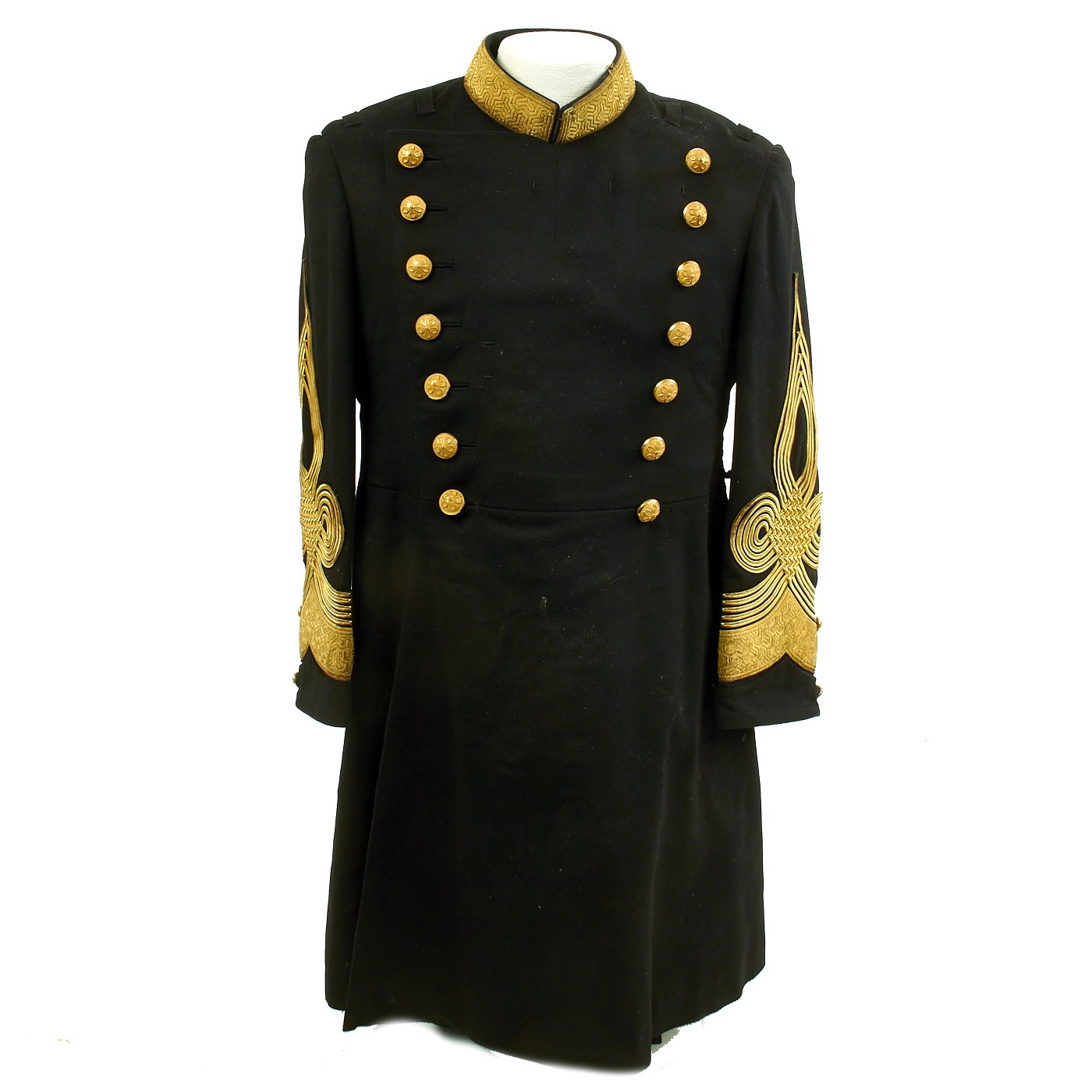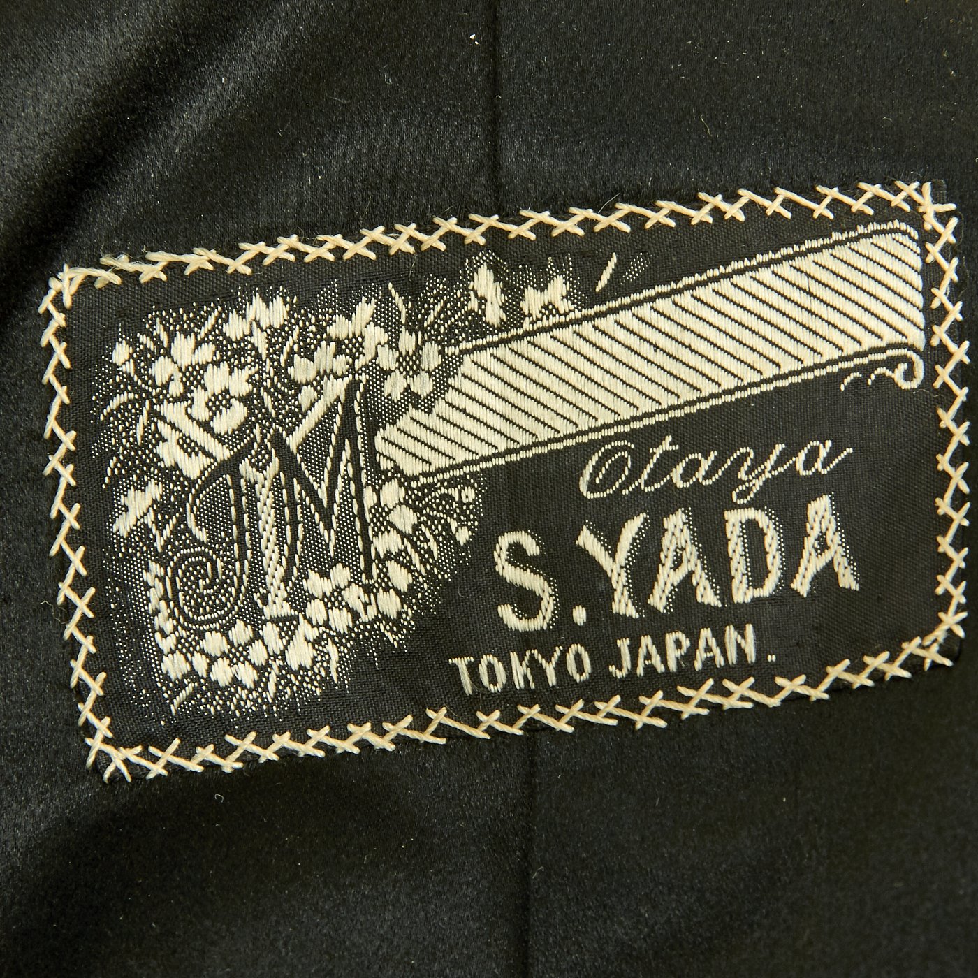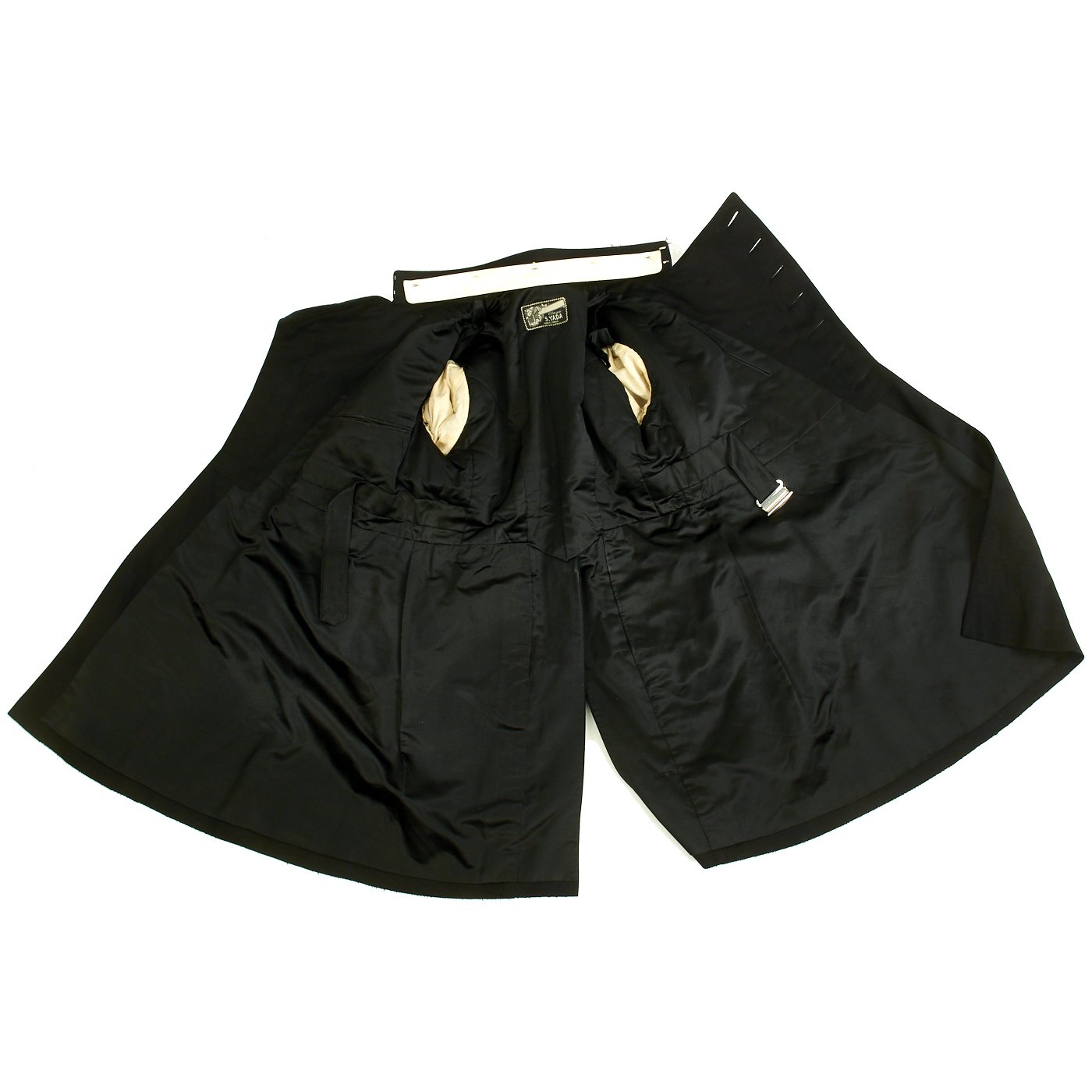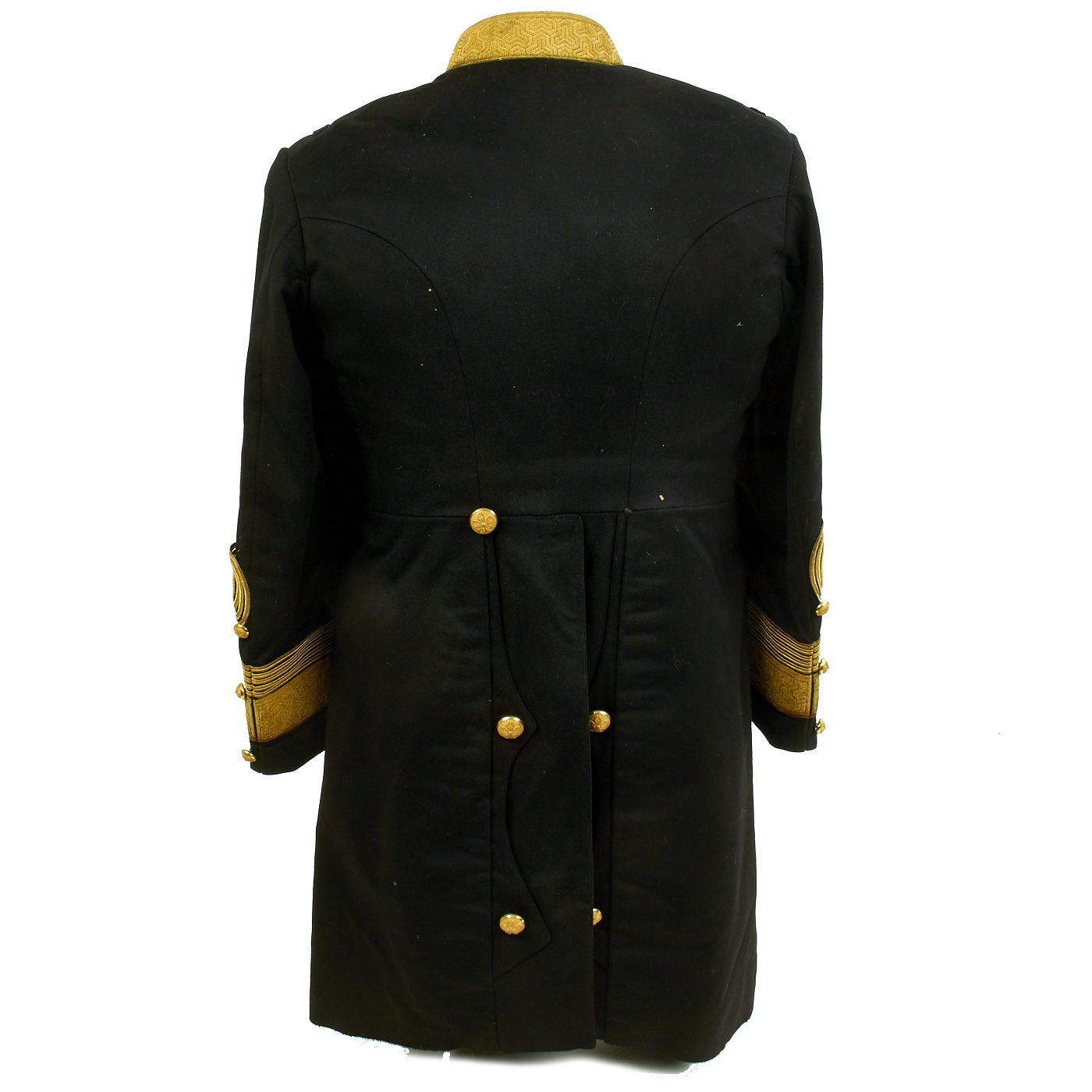 - A Meiji 19 1886 type full dress frock coat. The black wool, three-quarter length coat has a double-breasted front closure leading to a stand-up collar fastened by dual hooks and eyes. The 45mm tall collar is faced in gilt bullion patterned embroidery. Dual wool loops are sewn to each shoulder. Each of the seven, highly convex, 24mm diameter brass buttons to either side of the front closure have a five-lobed cherry blossom embossed to their obverses. A vertical support loop for the sword is to the left hip, which is fastened at its top by a 15mm diameter version of the buttons seen to either side of the front closure. Three buttons identical 15mm buttons are sewn to each cuff. Cuffs are complete with gilt bullion patterned embroidered Austrian Knots. A tail shirt vent rises from the base of the reverse, to either side of which are three buttons (one missing) identical to those on either side of the front closure. To the tail skirt vent, to either side of it, along the edges of the sword support strap. The interior is fully lined in black cotton/silk, but for its sleeves, which are lined in white silk. A horizontal slash pocket to the right breast, and a vertical slash patch pocket to the left breast. The chest measures approximately 36". Features a very nice S. YADA, TOKYO, JAPAN tailor's label. Also included are a matching set or trousers.