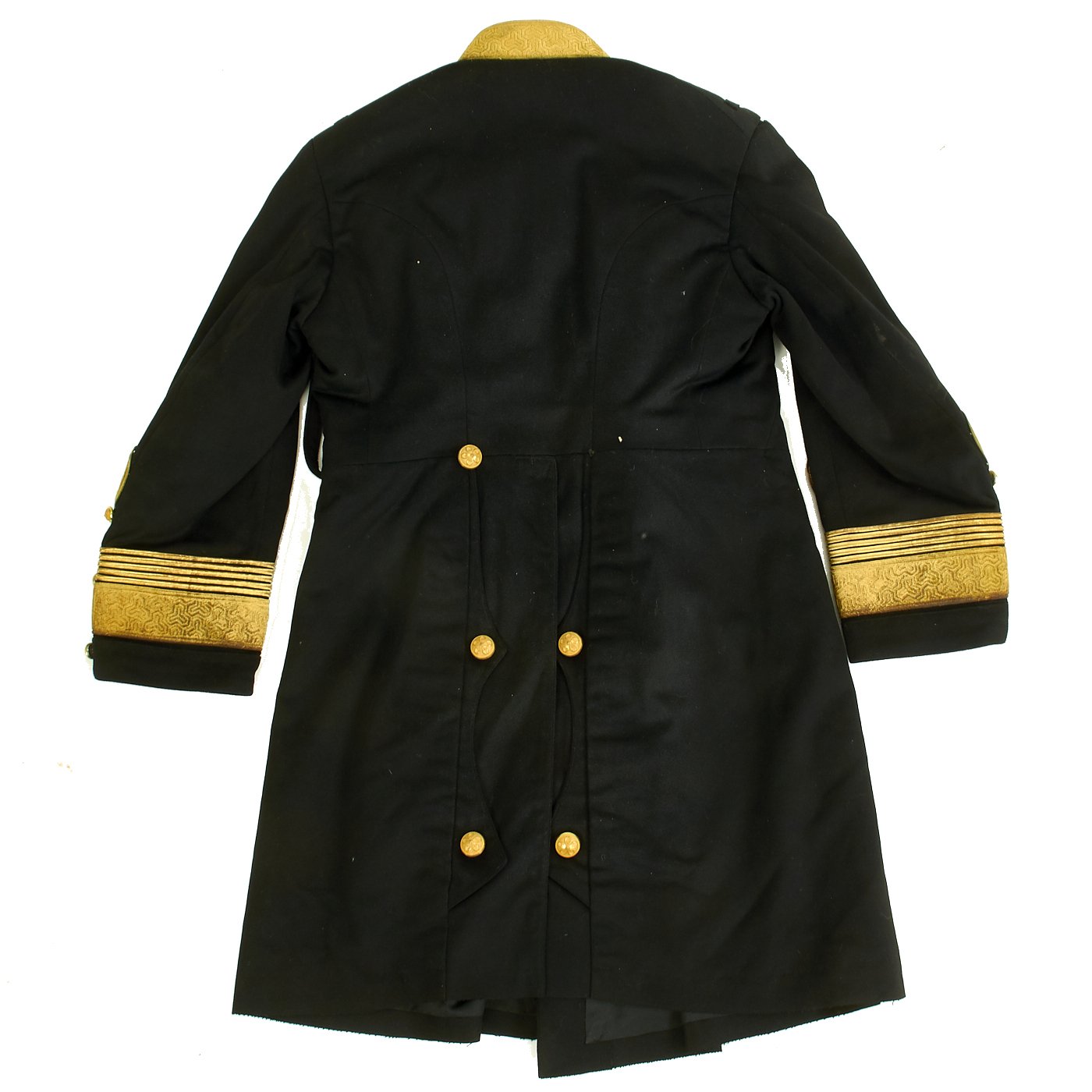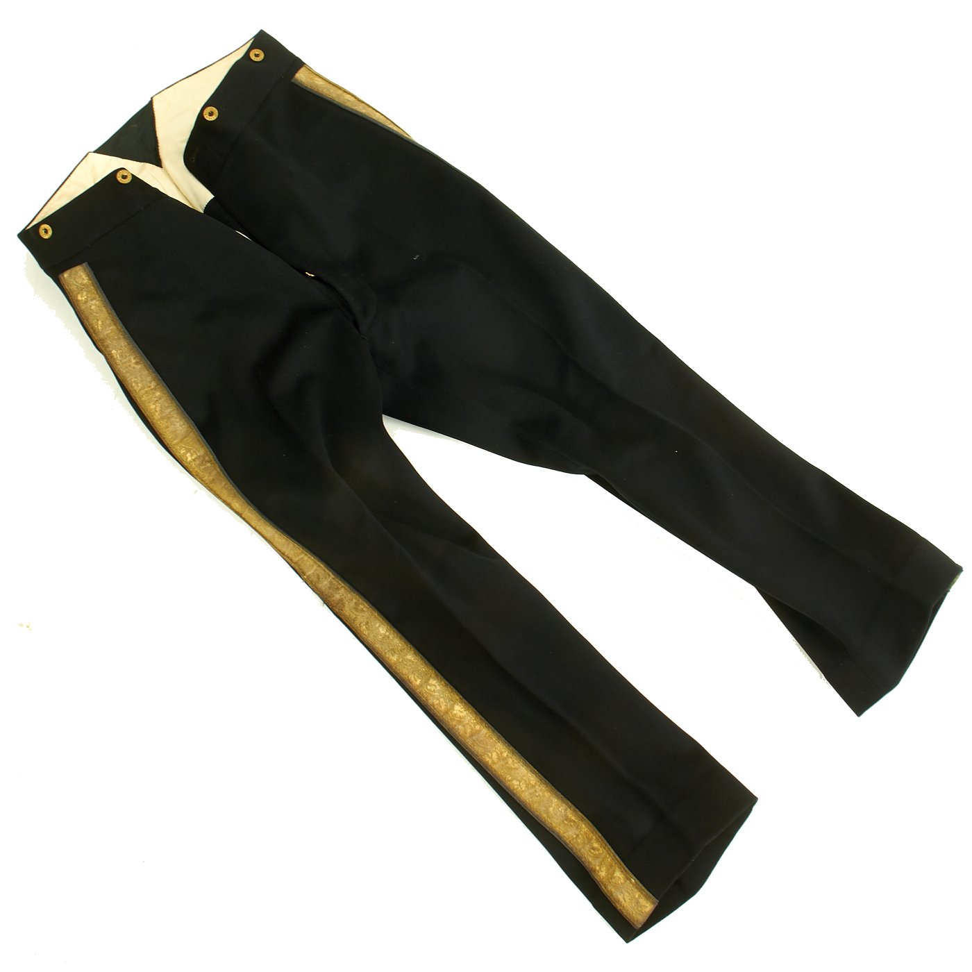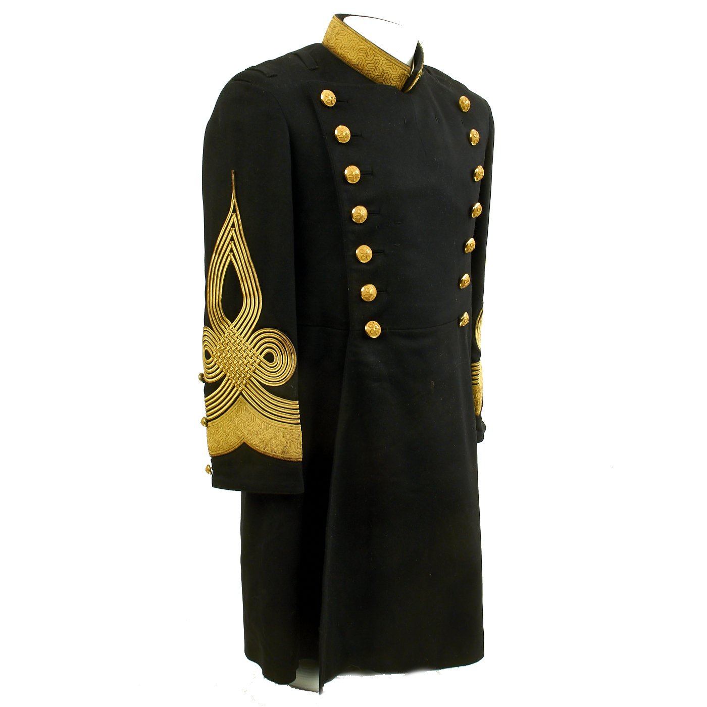 - A Meiji 19 1886 type full dress frock coat. The black wool, three-quarter length coat has a double-breasted front closure leading to a stand-up collar fastened by dual hooks and eyes. The 45mm tall collar is faced in gilt bullion patterned embroidery. Dual wool loops are sewn to each shoulder. Each of the seven, highly convex, 24mm diameter brass buttons to either side of the front closure have a five-lobed cherry blossom embossed to their obverses. A vertical support loop for the sword is to the left hip, which is fastened at its top by a 15mm diameter version of the buttons seen to either side of the front closure. Three buttons identical 15mm buttons are sewn to each cuff. Cuffs are complete with gilt bullion patterned embroidered Austrian Knots. A tail shirt vent rises from the base of the reverse, to either side of which are three buttons (one missing) identical to those on either side of the front closure. To the tail skirt vent, to either side of it, along the edges of the sword support strap. The interior is fully lined in black cotton/silk, but for its sleeves, which are lined in white silk. A horizontal slash pocket to the right breast, and a vertical slash patch pocket to the left breast. The chest measures approximately 36". Features a very nice S. YADA, TOKYO, JAPAN tailor's label. Also included are a matching set or trousers.