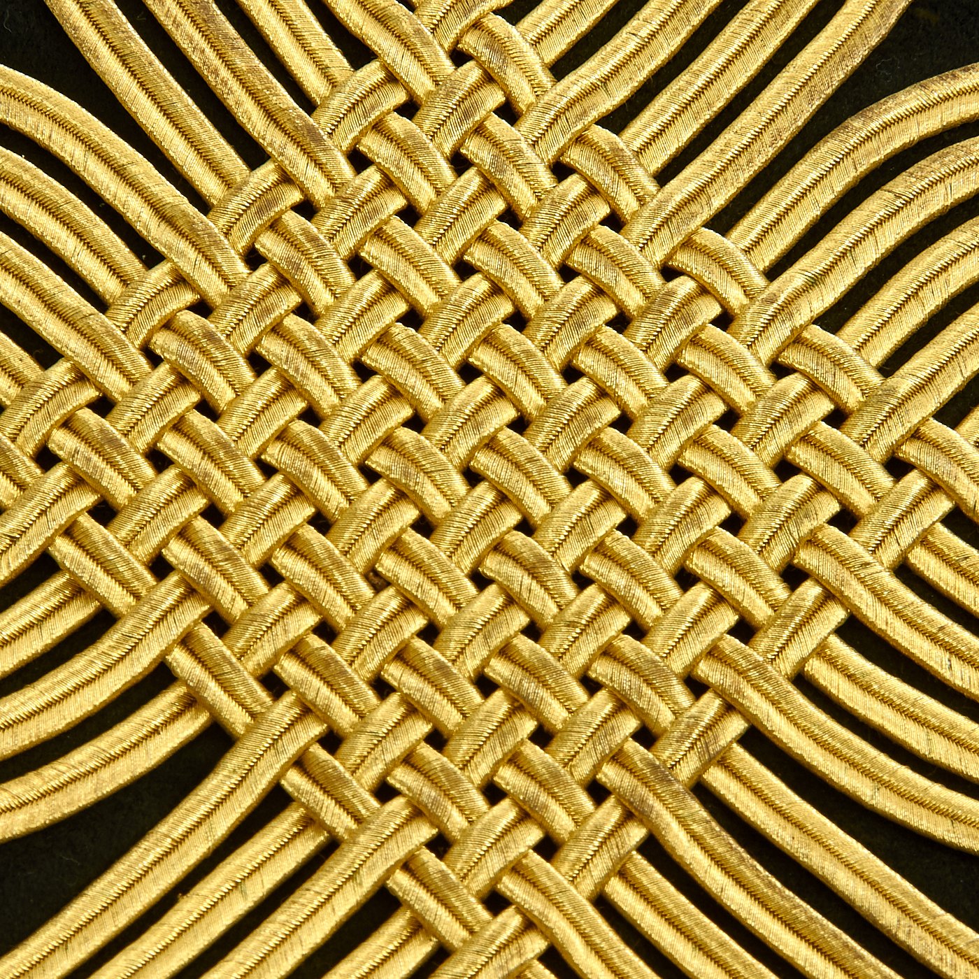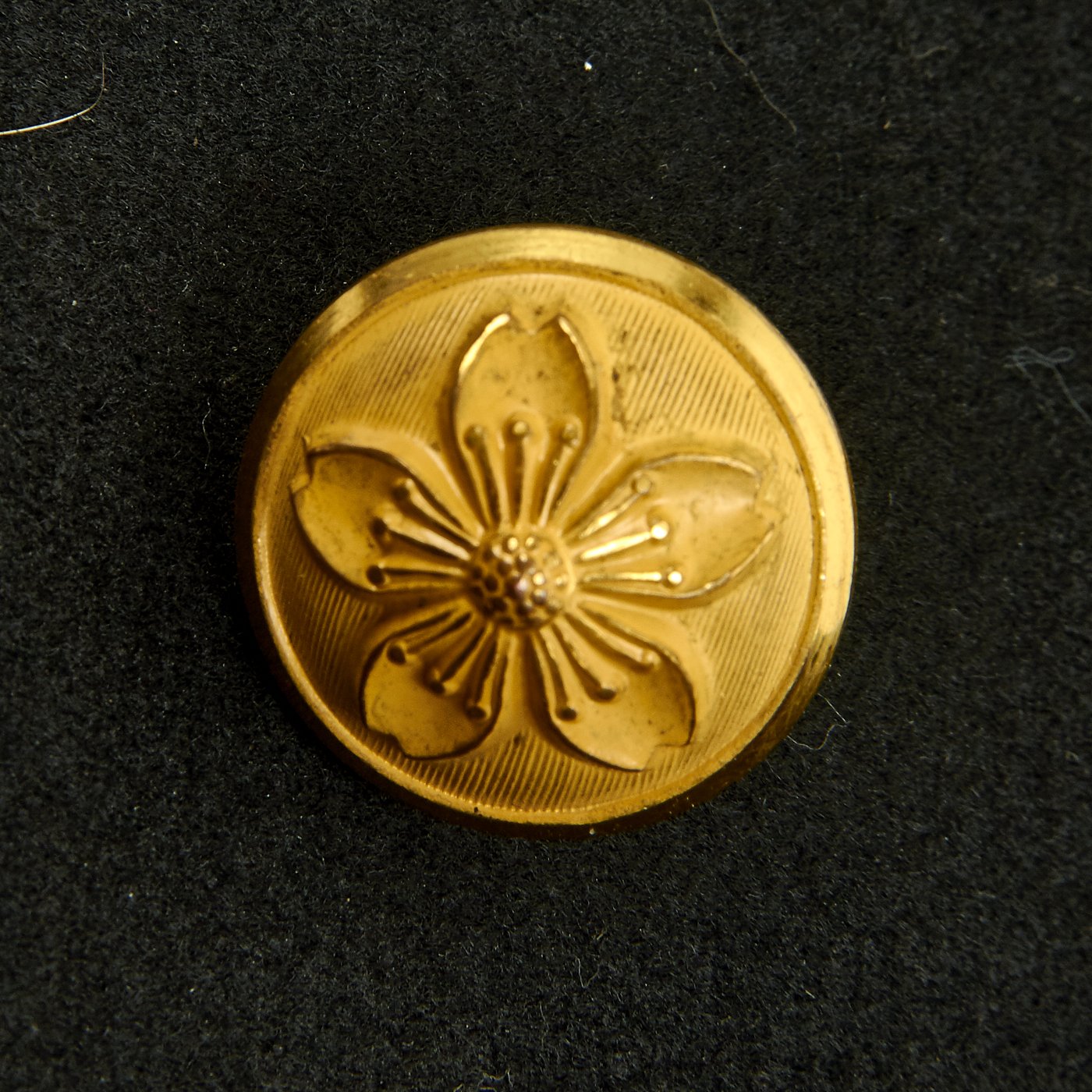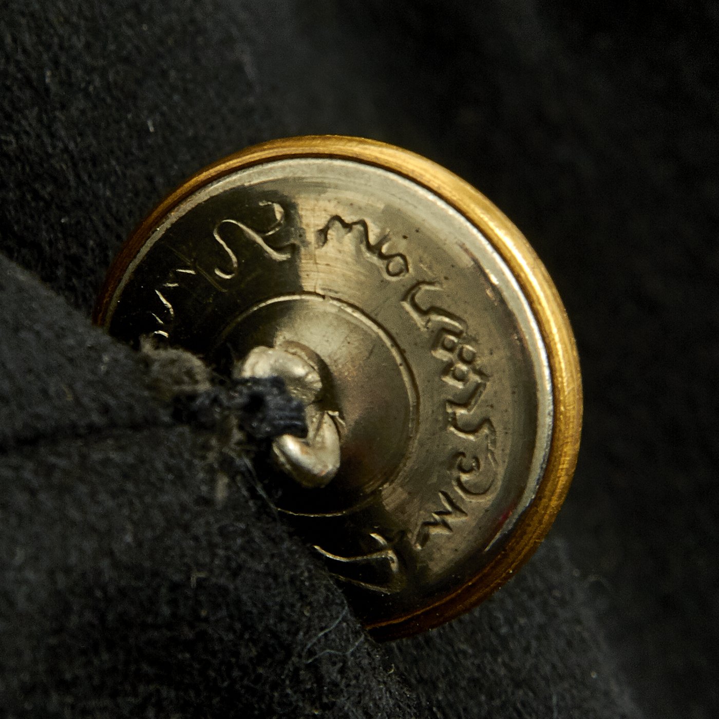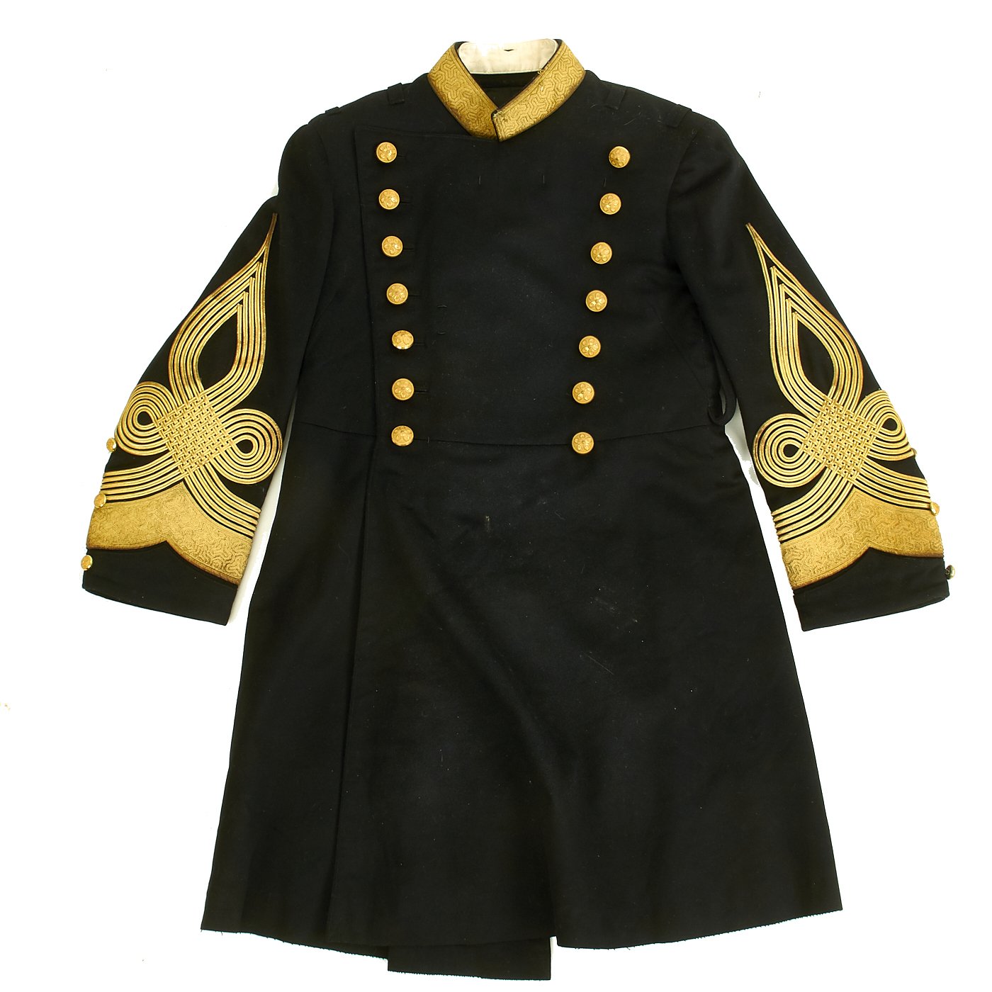 - A Meiji 19 1886 type full dress frock coat. The black wool, three-quarter length coat has a double-breasted front closure leading to a stand-up collar fastened by dual hooks and eyes. The 45mm tall collar is faced in gilt bullion patterned embroidery. Dual wool loops are sewn to each shoulder. Each of the seven, highly convex, 24mm diameter brass buttons to either side of the front closure have a five-lobed cherry blossom embossed to their obverses. A vertical support loop for the sword is to the left hip, which is fastened at its top by a 15mm diameter version of the buttons seen to either side of the front closure. Three buttons identical 15mm buttons are sewn to each cuff. Cuffs are complete with gilt bullion patterned embroidered Austrian Knots. A tail shirt vent rises from the base of the reverse, to either side of which are three buttons (one missing) identical to those on either side of the front closure. To the tail skirt vent, to either side of it, along the edges of the sword support strap. The interior is fully lined in black cotton/silk, but for its sleeves, which are lined in white silk. A horizontal slash pocket to the right breast, and a vertical slash patch pocket to the left breast. The chest measures approximately 36". Features a very nice S. YADA, TOKYO, JAPAN tailor's label. Also included are a matching set or trousers.