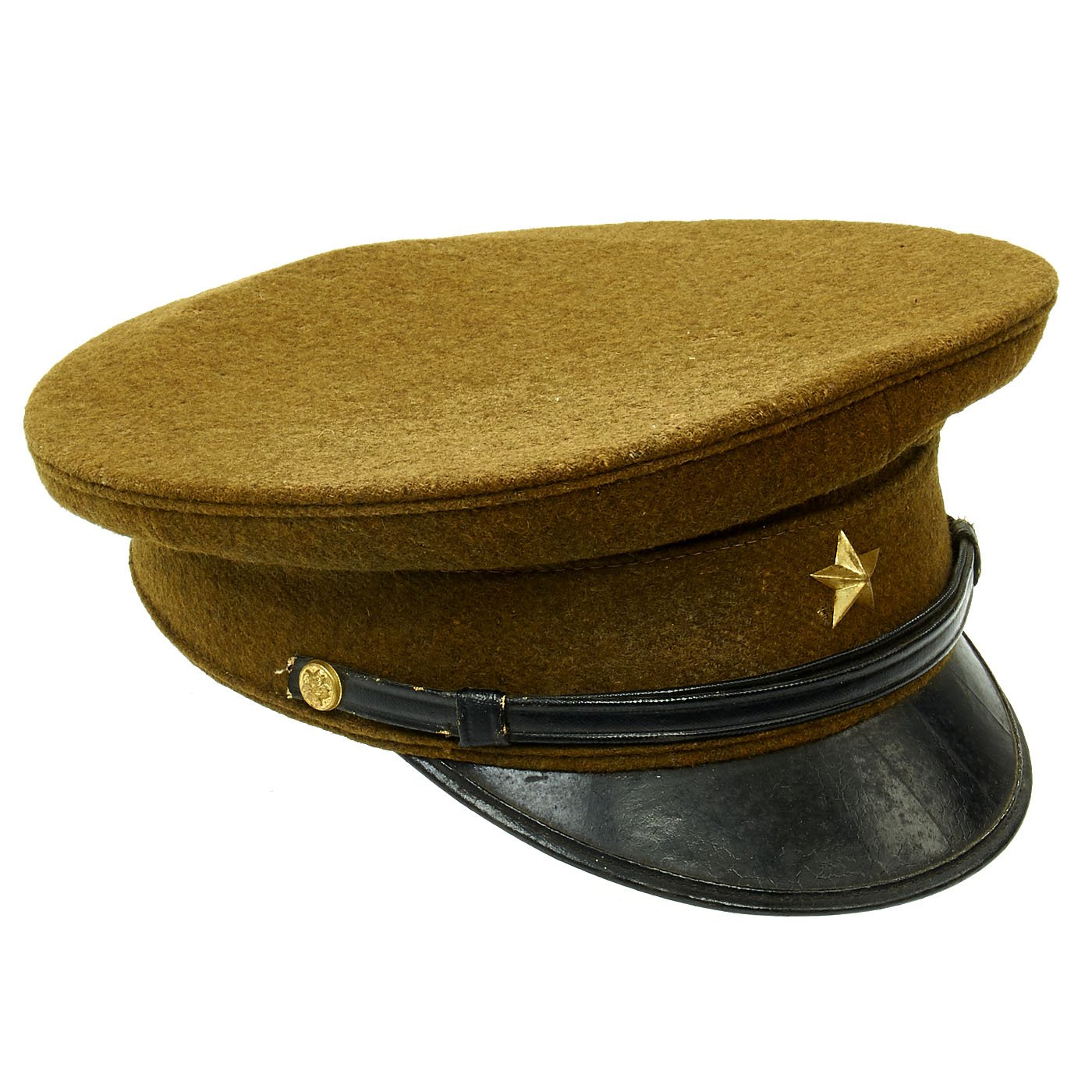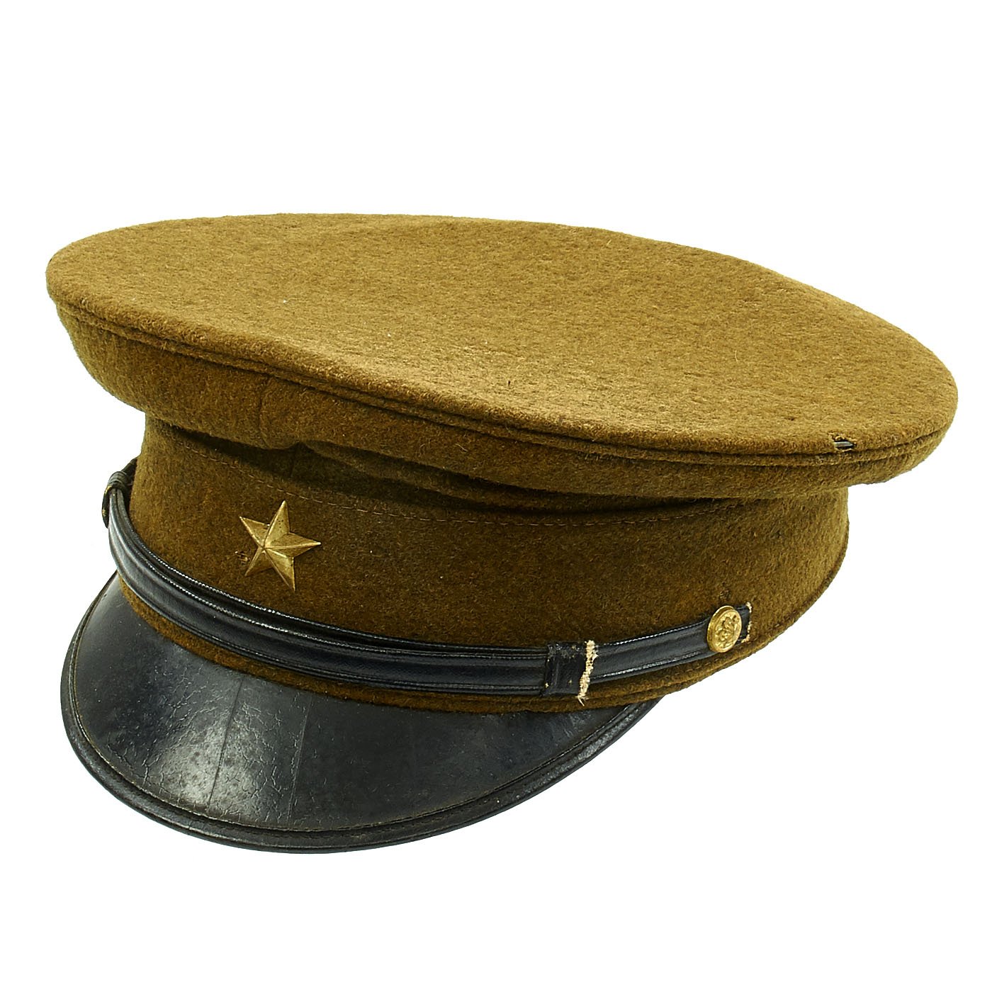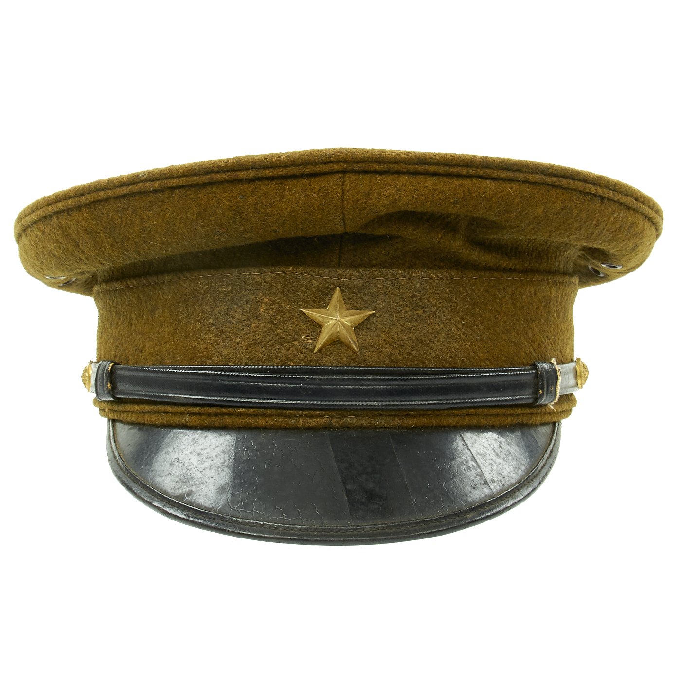 Original Item: Only One Available. This is a very good condition Japanese Imperial Army Ministry of Justice Employee Visor hat. It has a body of brown green wool. Center of cap features a brass Imperial Japanese Army Star along with brass Chrysanthemum chinstrap buttons. The black leather visor is in very good condition retaining its shape without distortion.