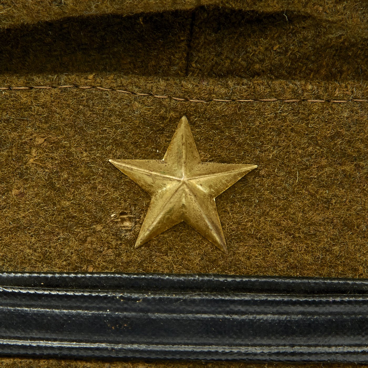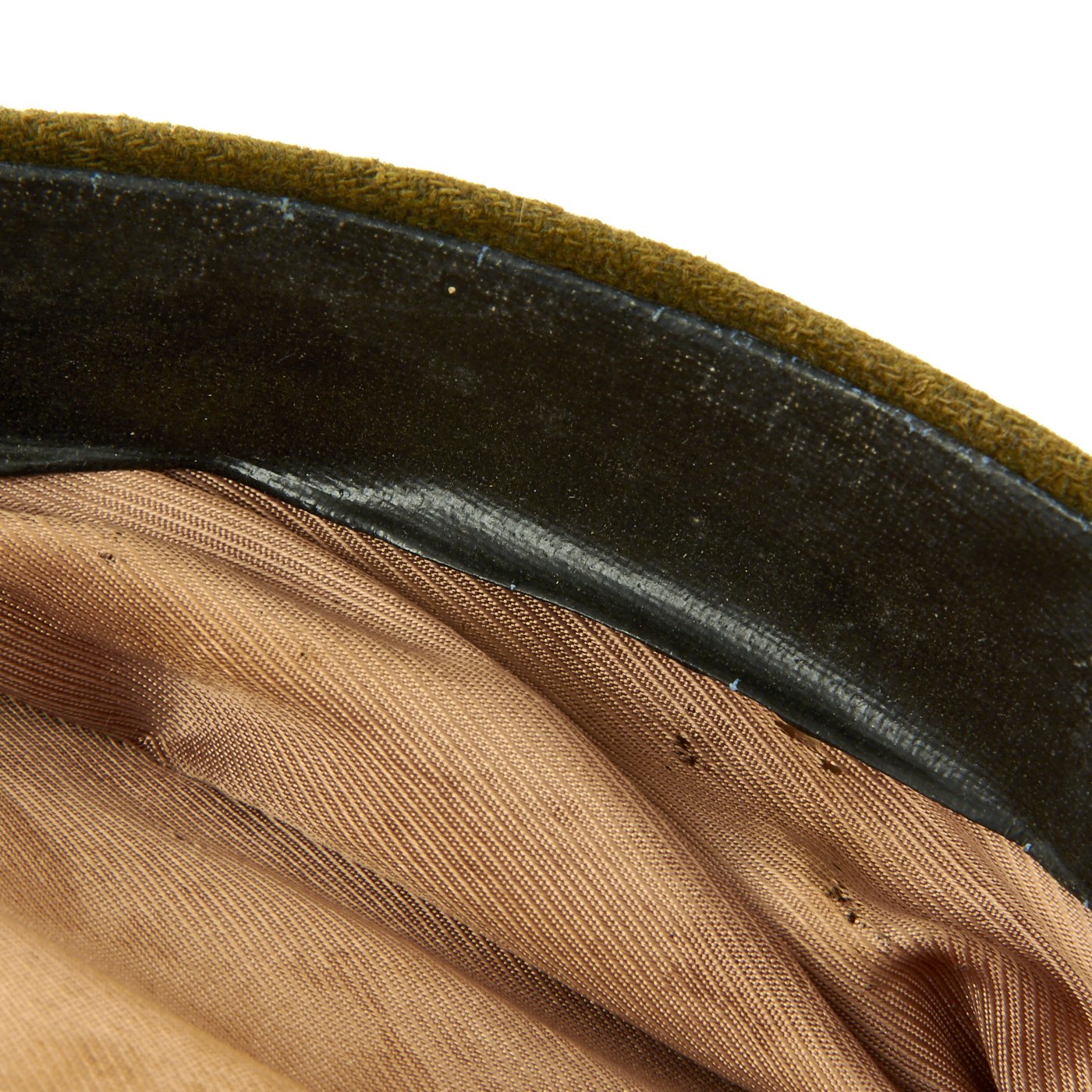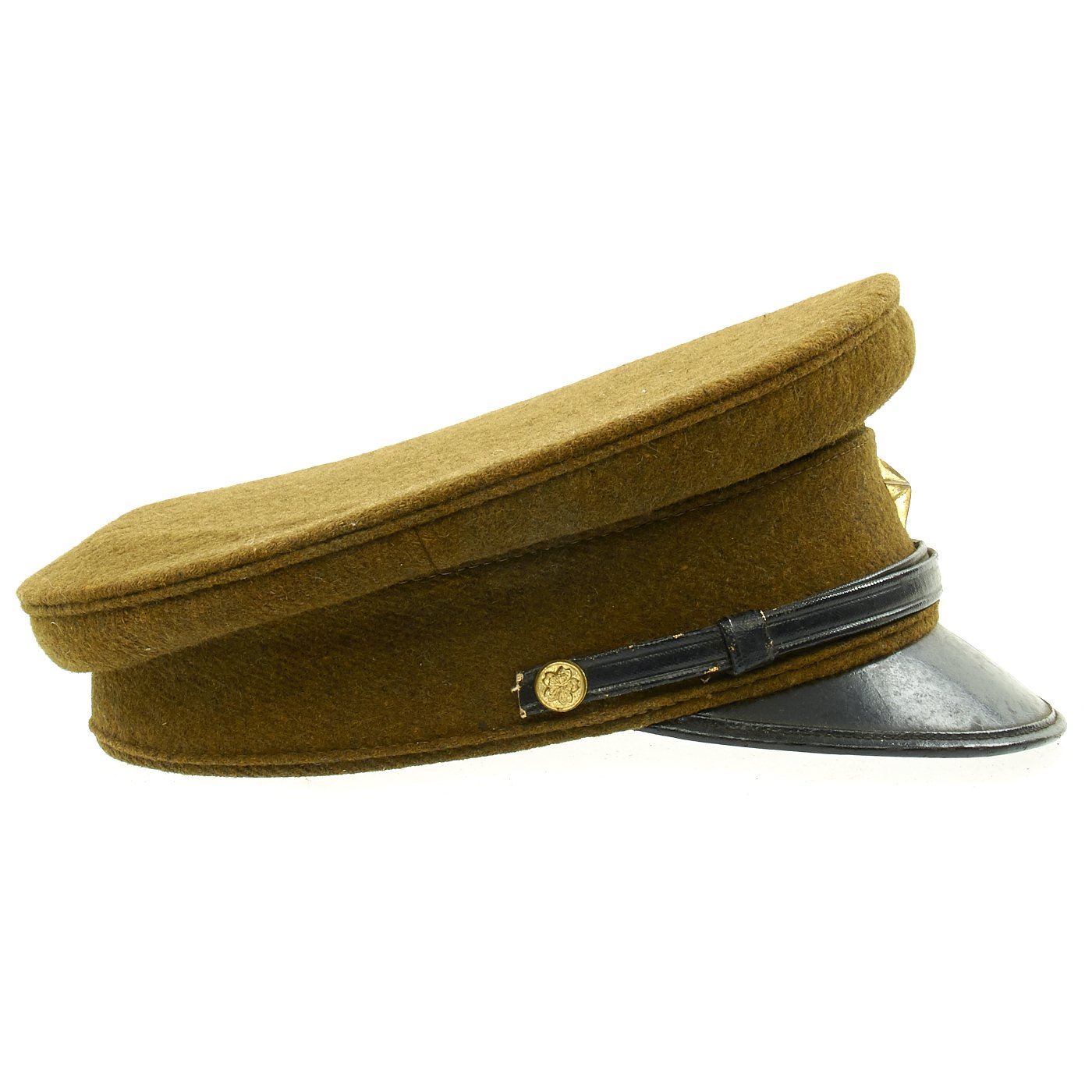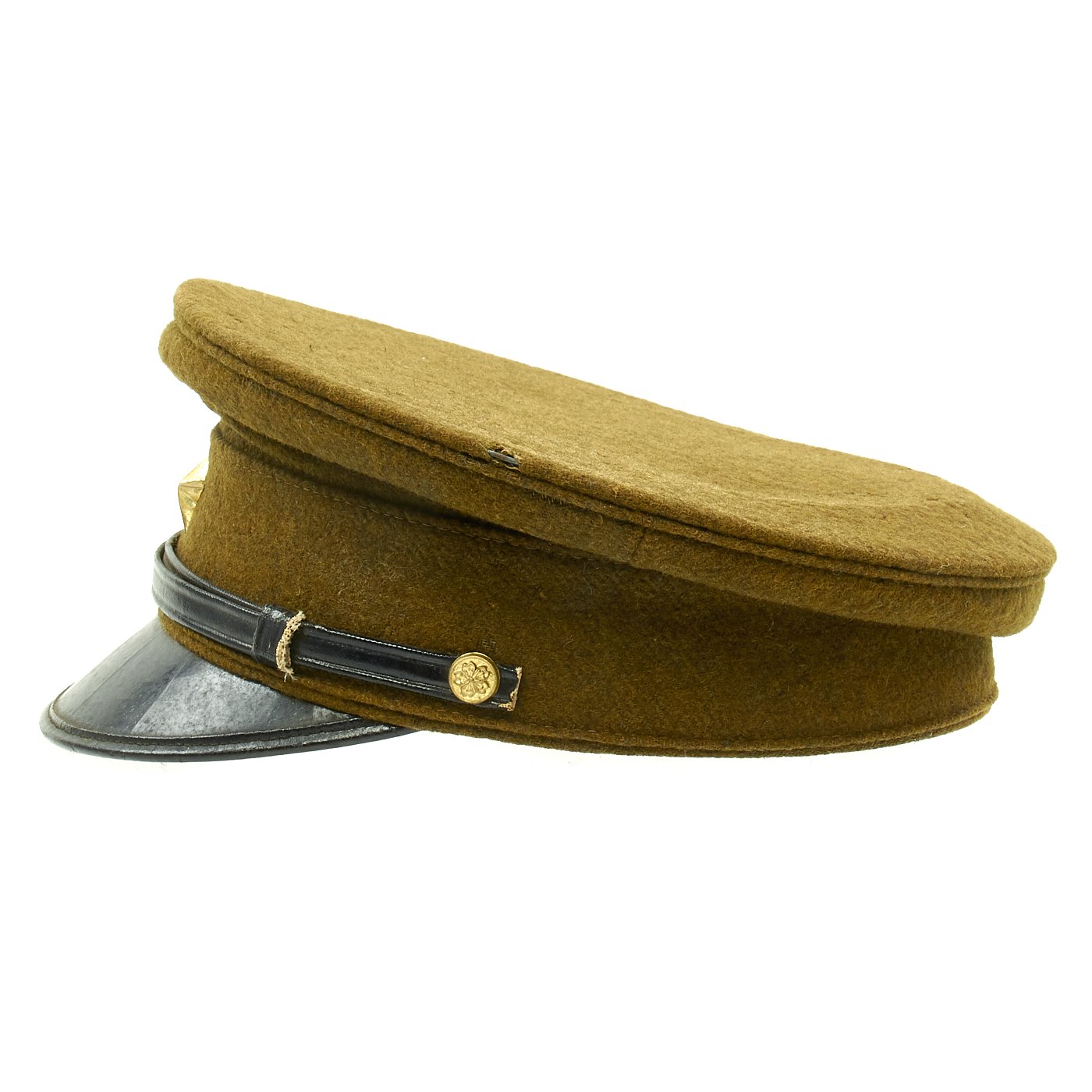 Original Item: Only One Available. This is a very good condition Japanese Imperial Army Ministry of Justice Employee Visor hat. It has a body of brown green wool. Center of cap features a brass Imperial Japanese Army Star along with brass Chrysanthemum chinstrap buttons. The black leather visor is in very good condition retaining its shape without distortion.
