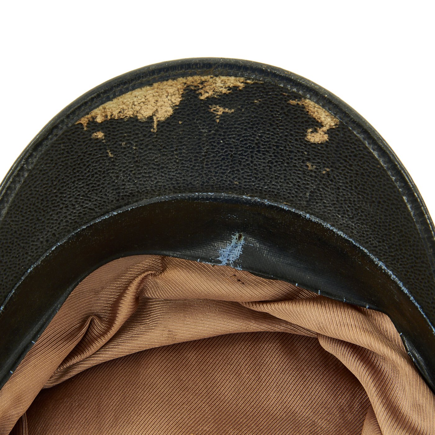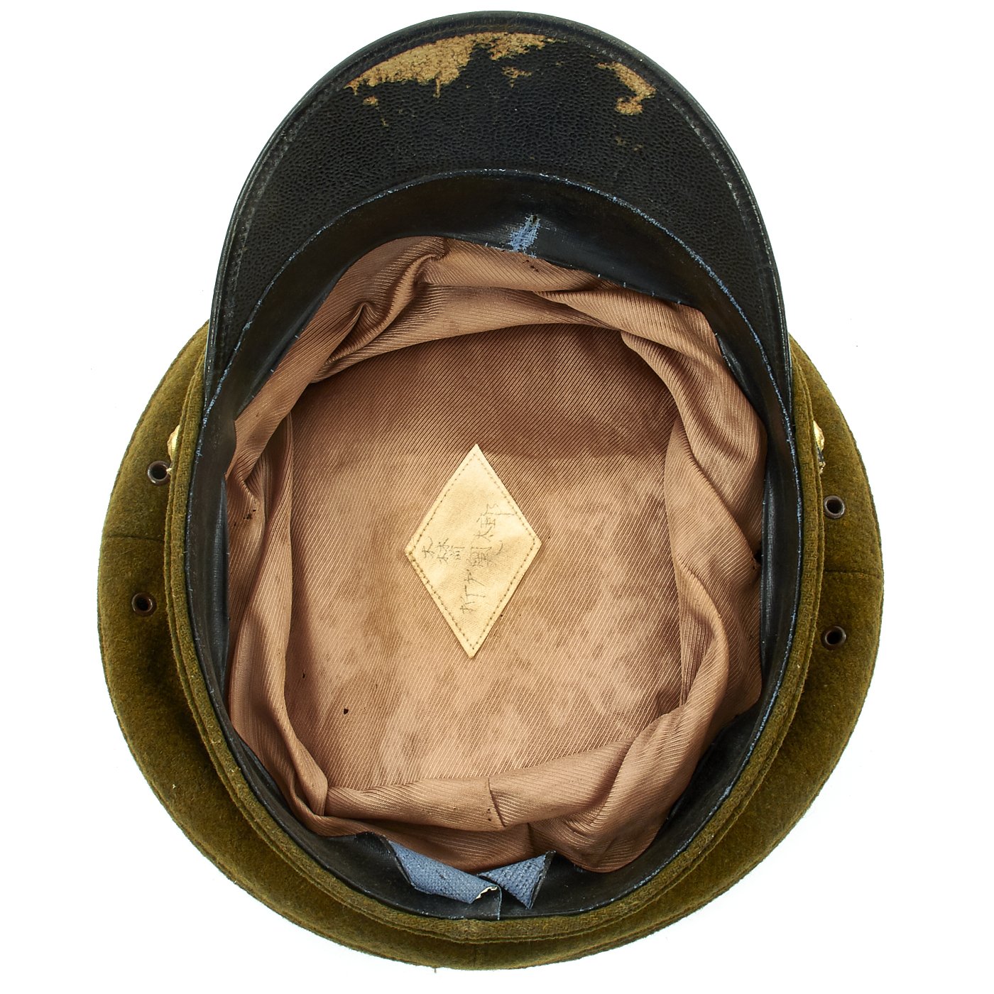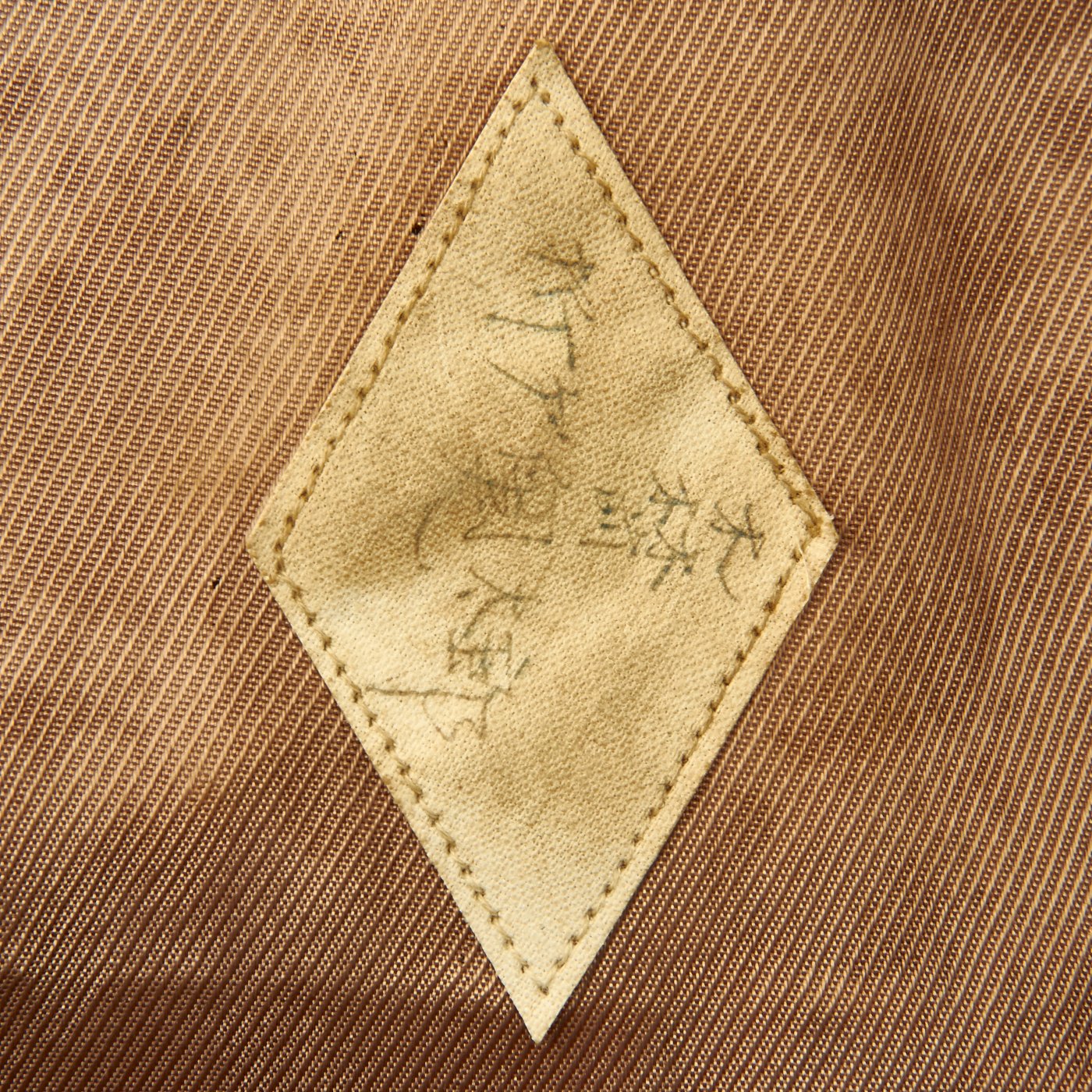 The interior is lined in satin. The black oilcloth sweatband shows minor wear but is complete. The center of the interior bears a diamond shaped stitched on name tag with Japanese characters.