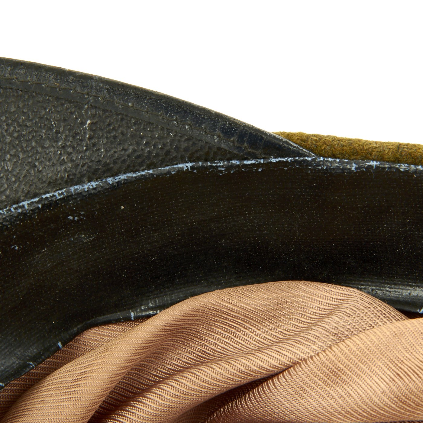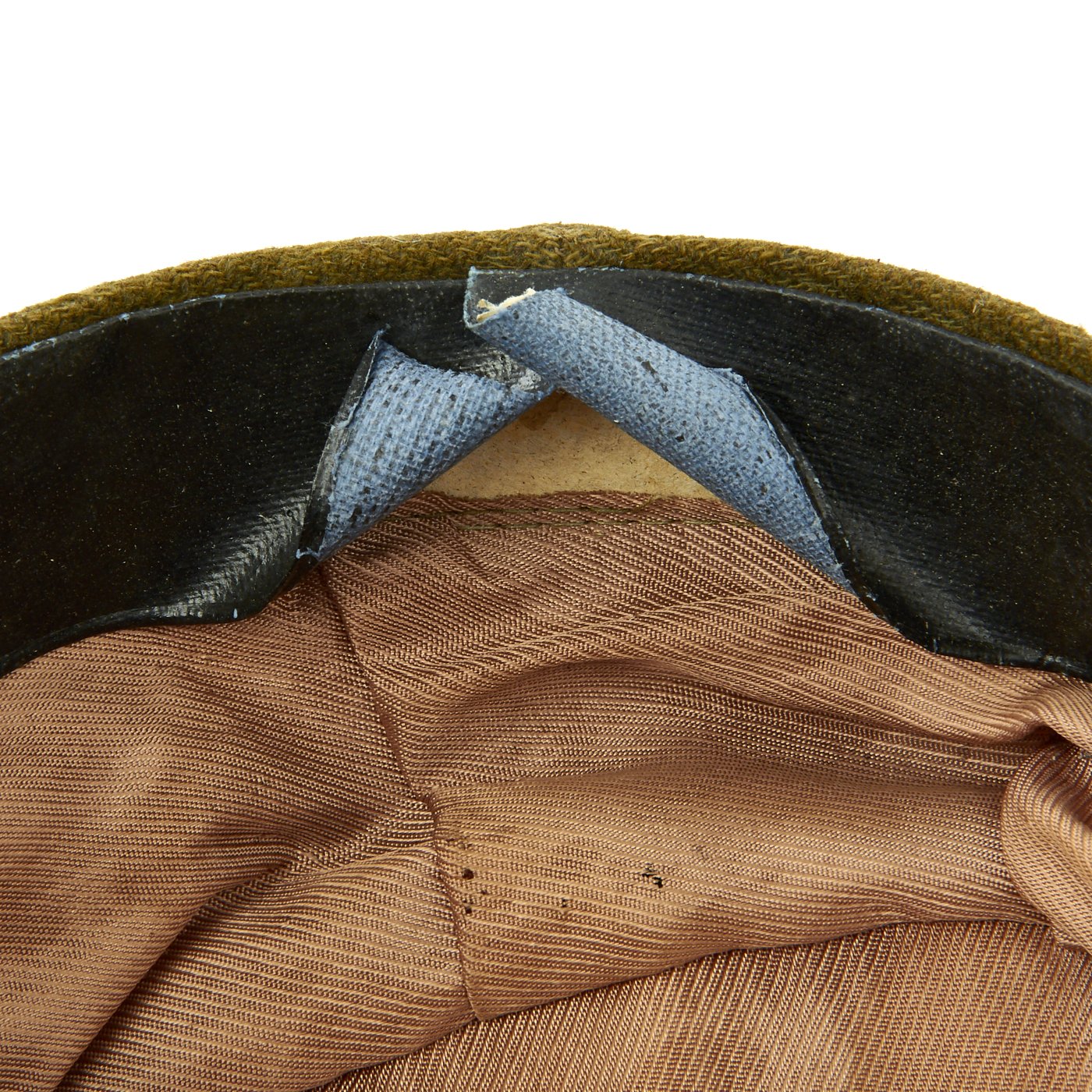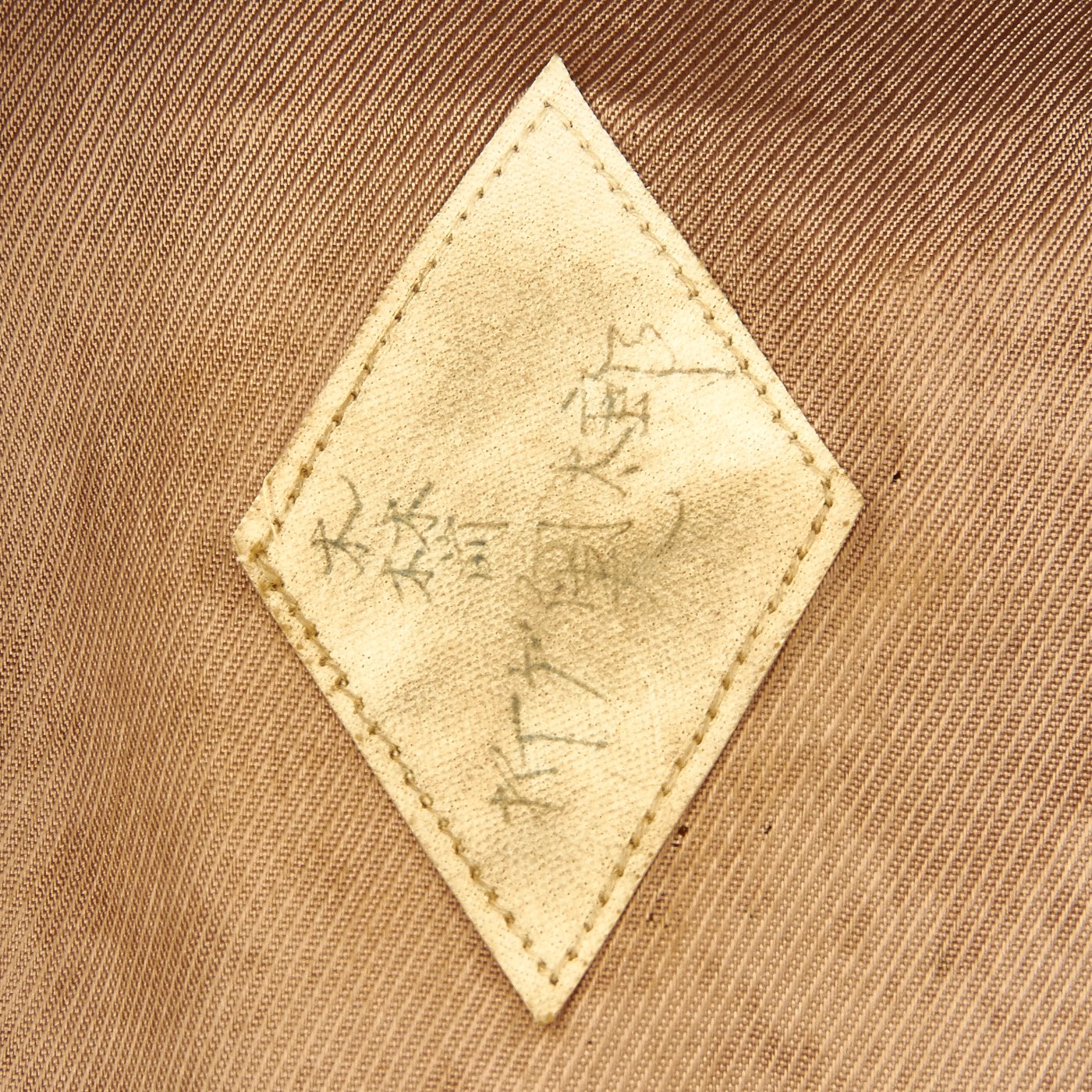 The interior is lined in satin. The black oilcloth sweatband shows minor wear but is complete. The center of the interior bears a diamond shaped stitched on name tag with Japanese characters.