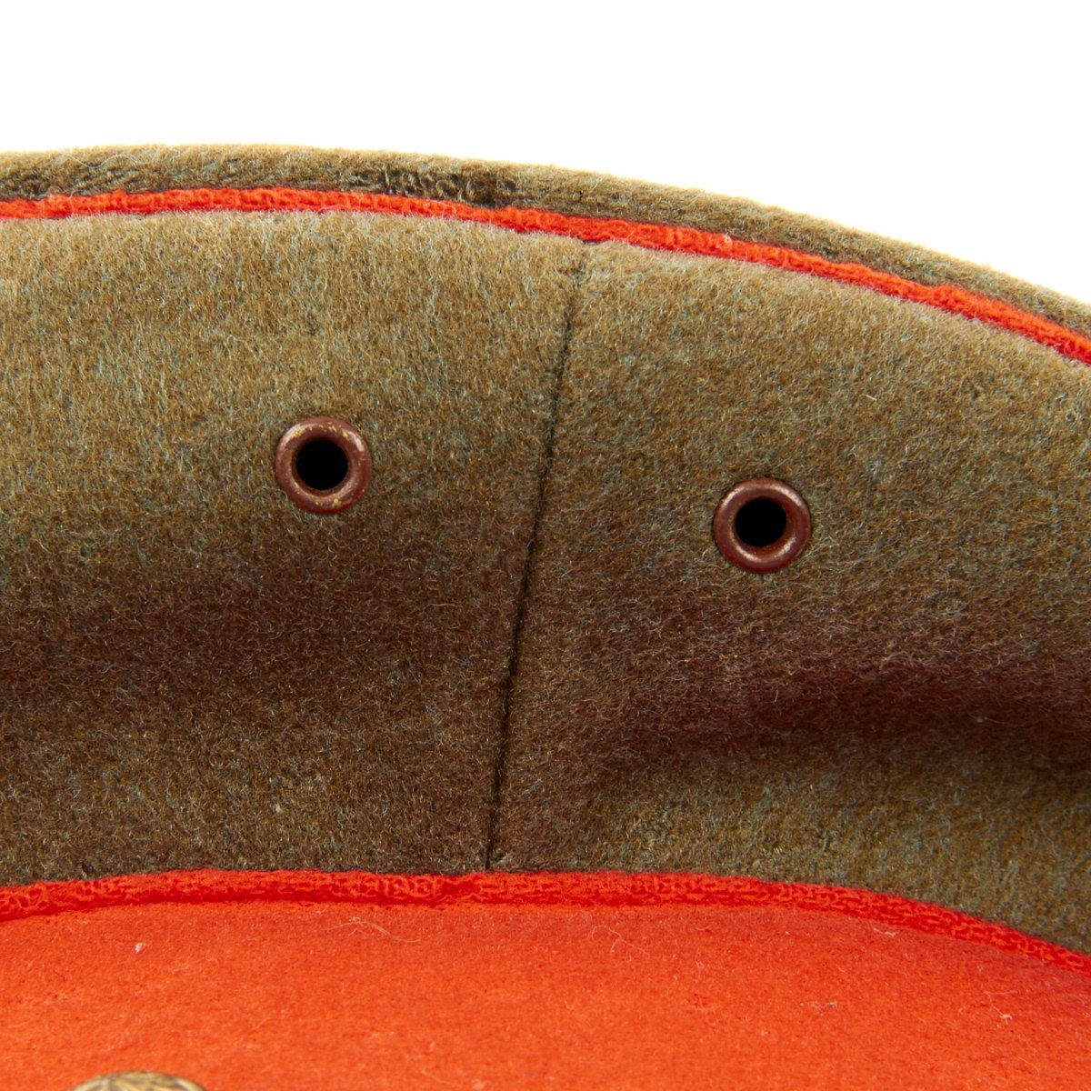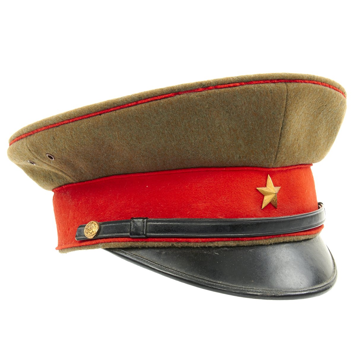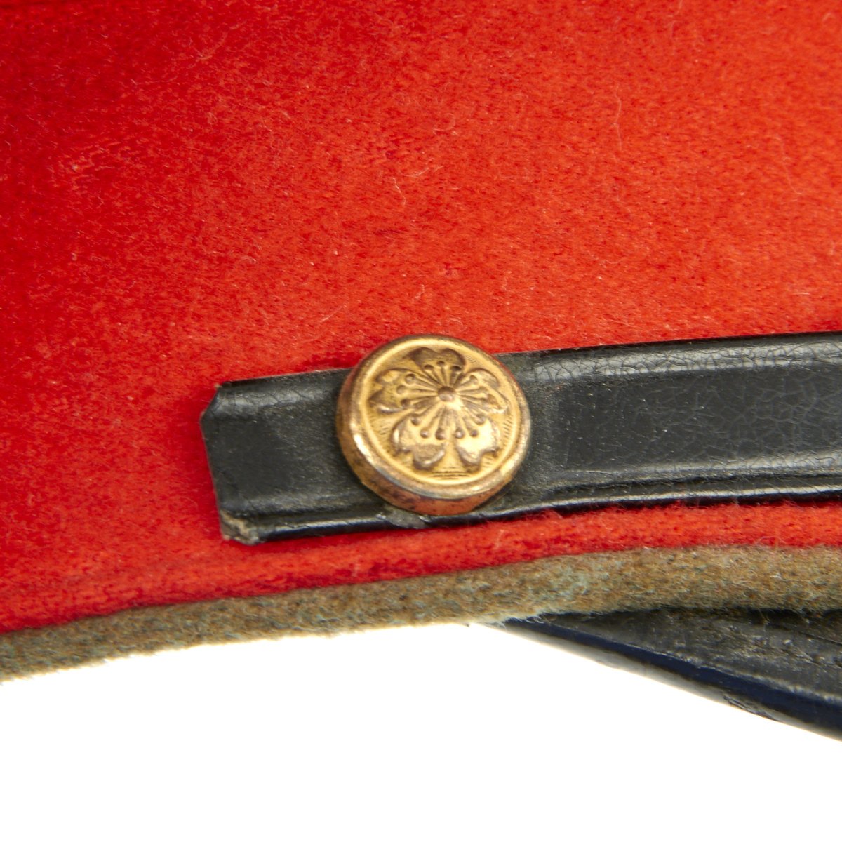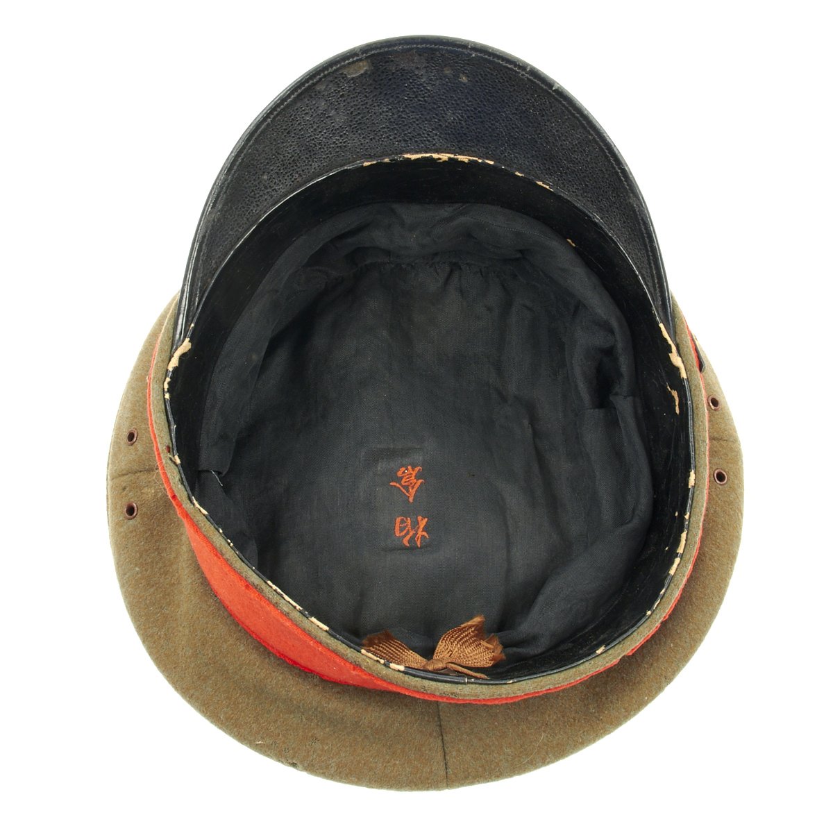 Original Item: Only One Available. This is a very good condition Japanese Imperial Army Officer's Visor hat. It has a body of brown/green wool with a top panel seam of red piping, matching the color of the red wool cap band.