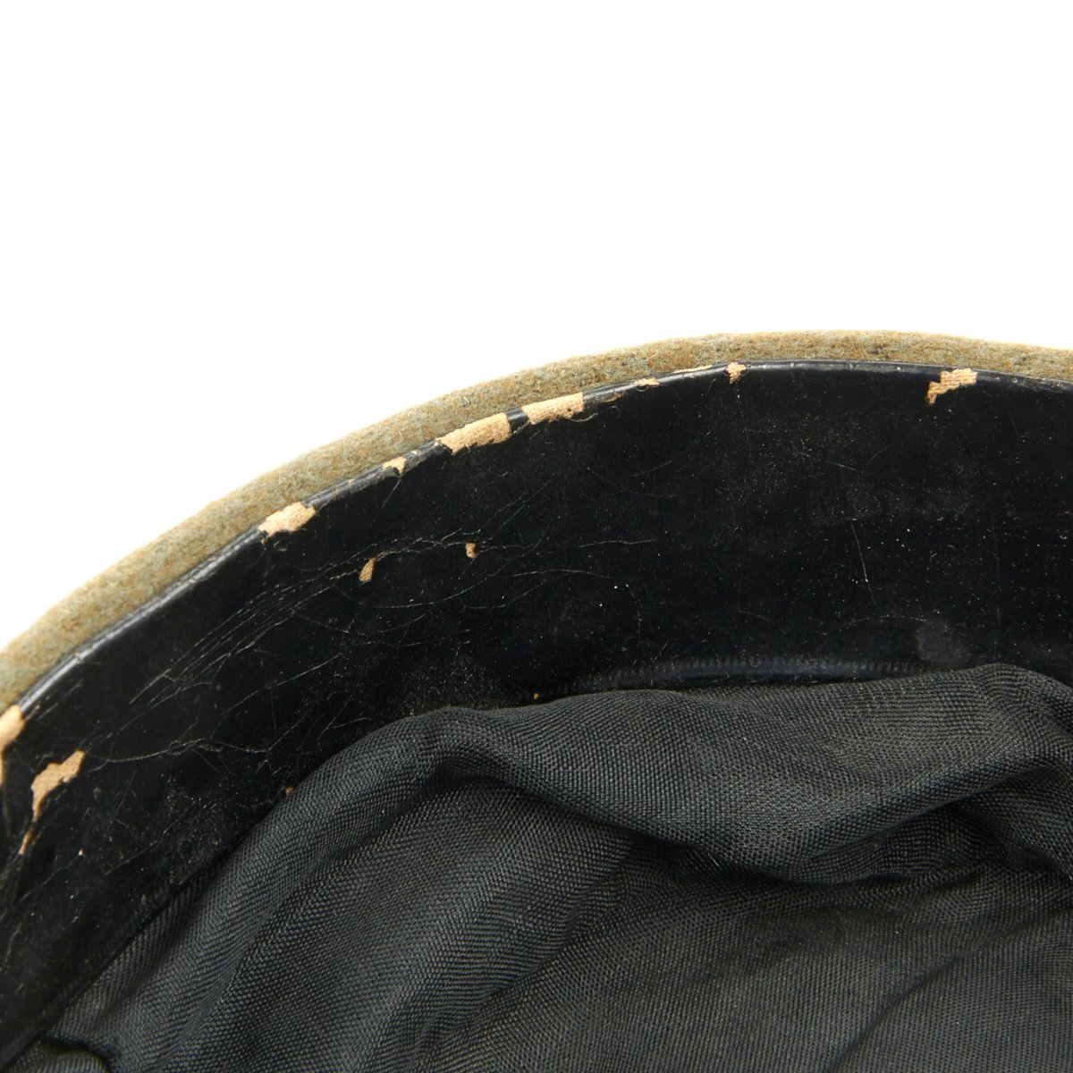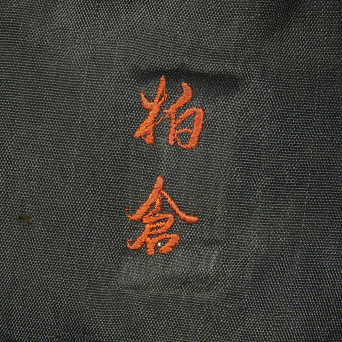 The interior is lined in black cloth (typically missing), with the cheesecloth reinforcement underneath. The black oilcloth sweatband shows minor wear but is complete. The center of the interior bears red embroidered Japanese characters.