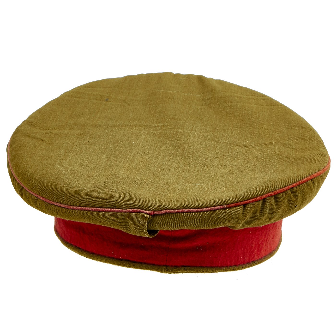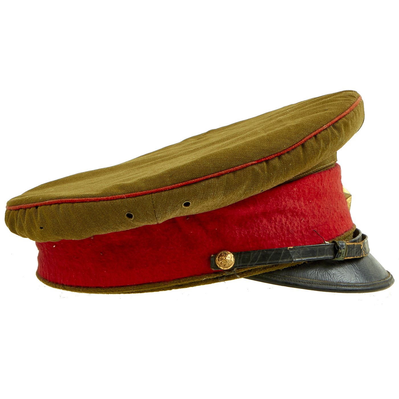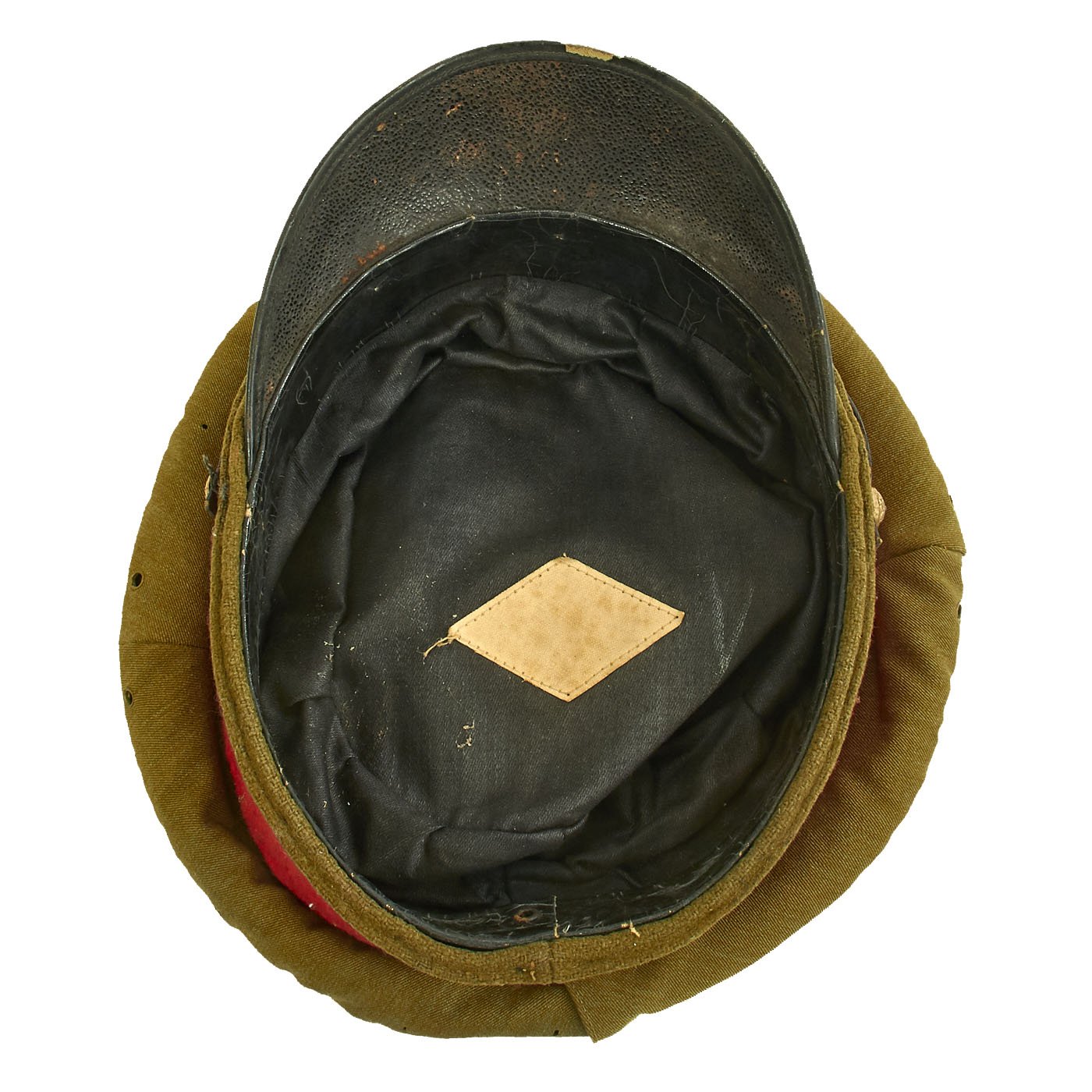 Original Item: Only One Available. This is a field worn salty Japanese Imperial Army Officer's Visor hat. It has a body of brown/green wool with a top panel seam of red piping, matching the color of the red wool cap band. Over this is a cotton hat cover with snap back.