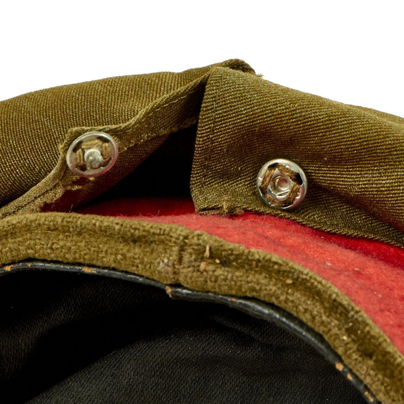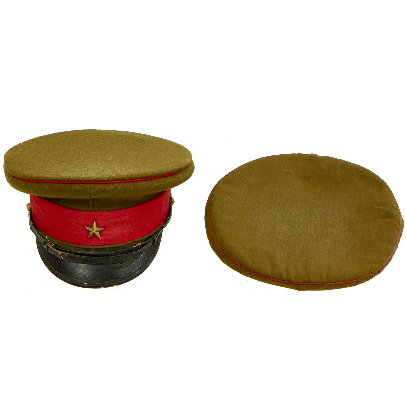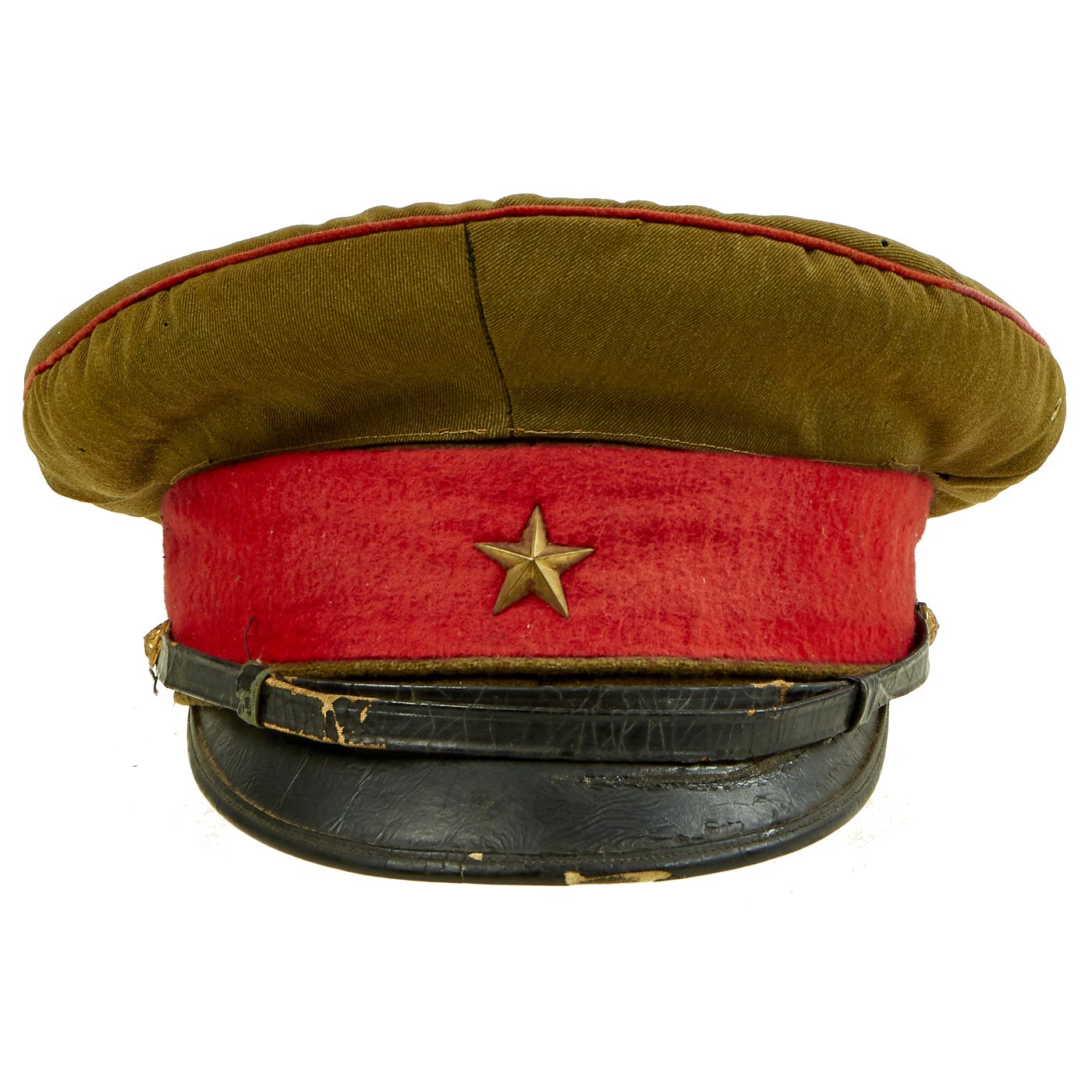 Original Item: Only One Available. This is a field worn salty Japanese Imperial Army Officer's Visor hat. It has a body of brown/green wool with a top panel seam of red piping, matching the color of the red wool cap band. Over this is a cotton hat cover with snap back.