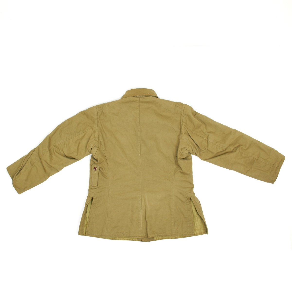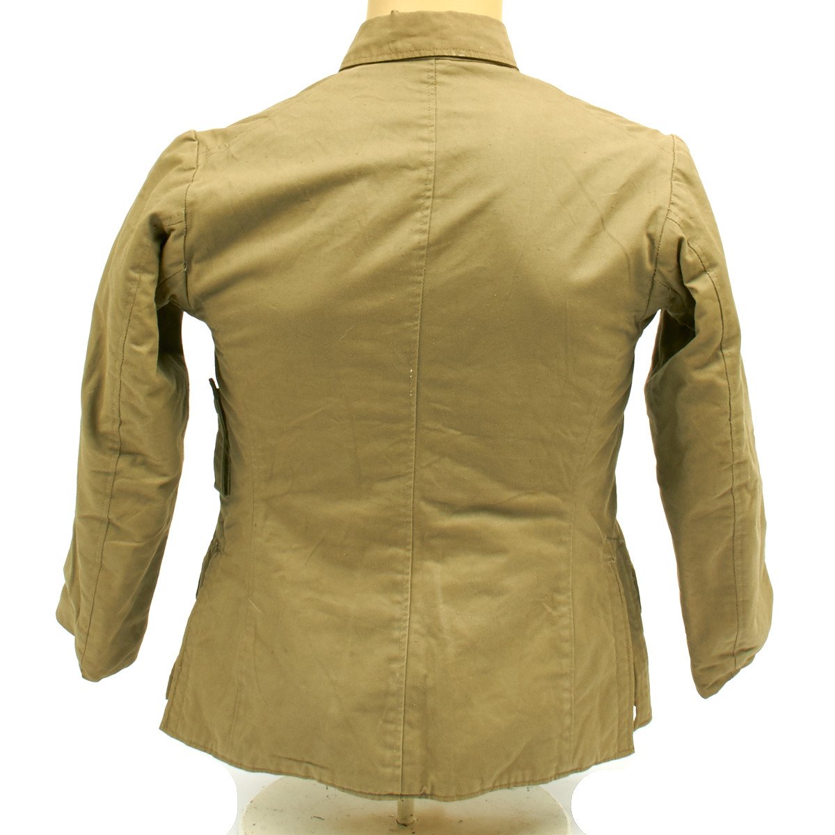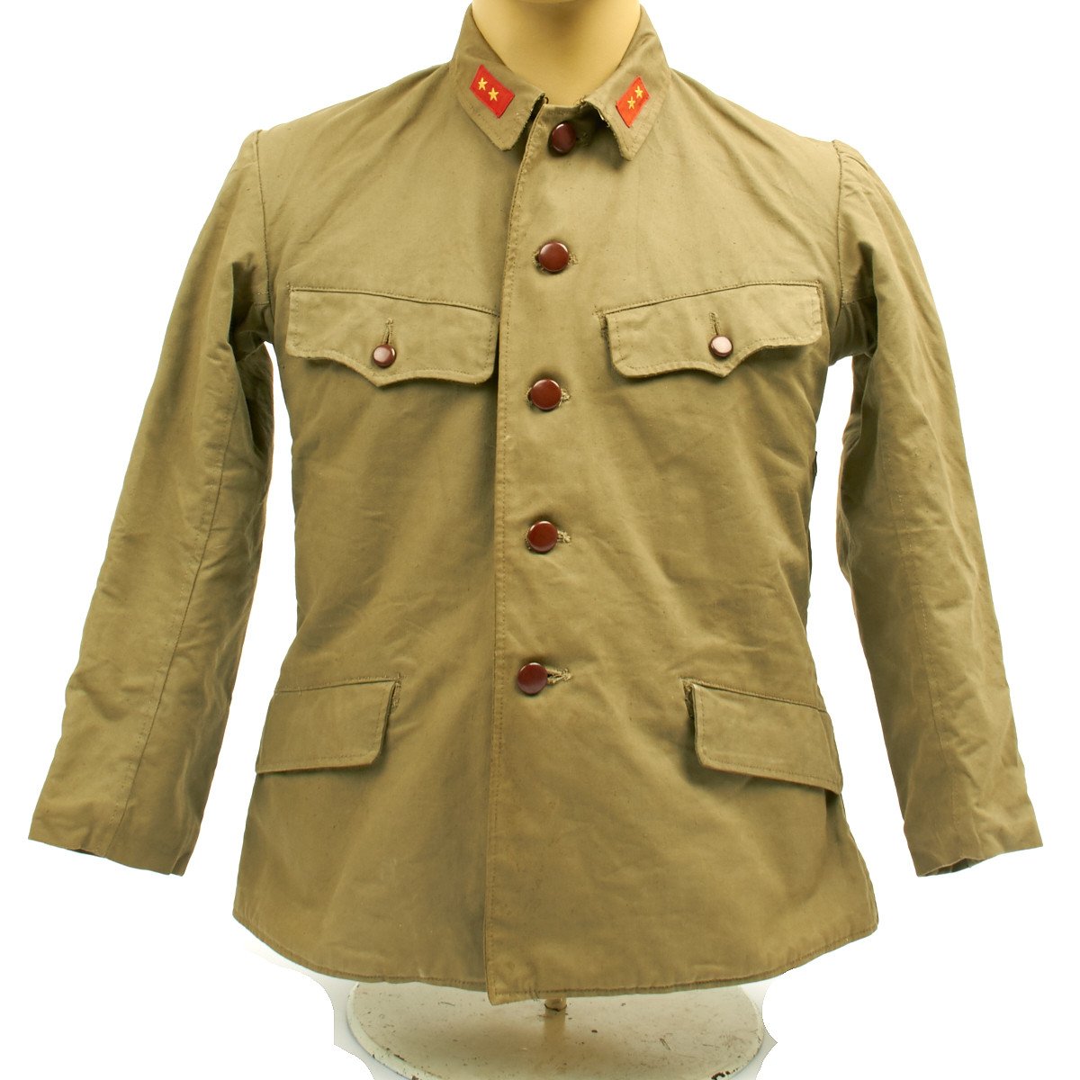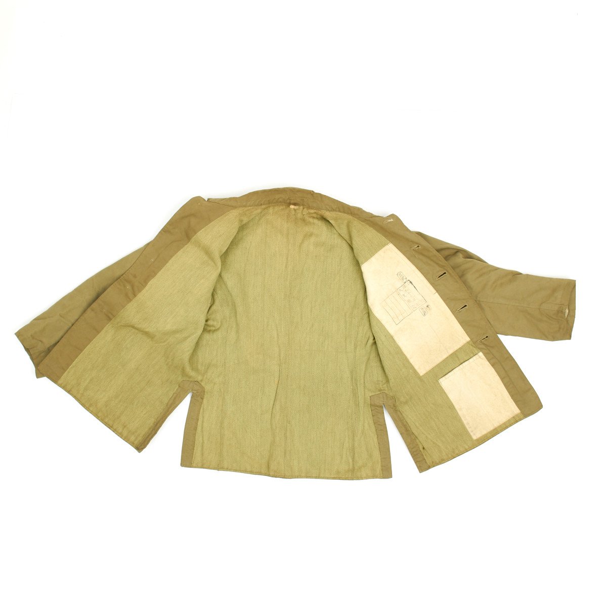Original Item: Only One Available. This is a rare original WW2 Japanese Army tunic for a private first class. The tunic is in unissued condition. High quality construction, cotton shell and lining with polished buttons. Features Private first class collar tabs with embroidered stars. There are several lines of Kanji ink stamped to the inner lining. Size is approximately a 36 chest. Overall excellent condition with no stains, tears or moth damage. They don’t come cleaner than this.