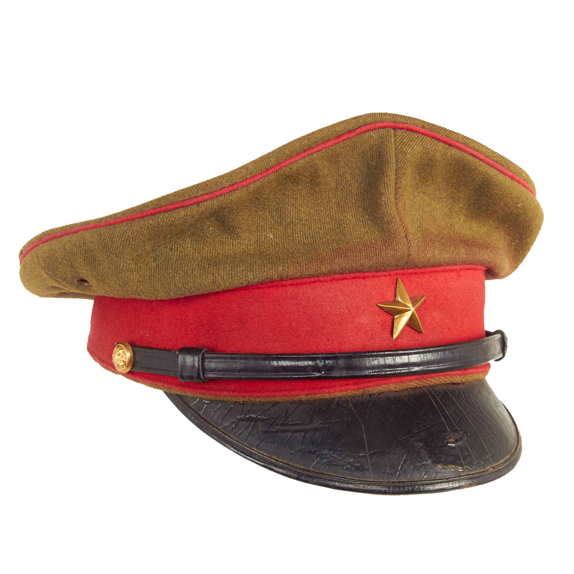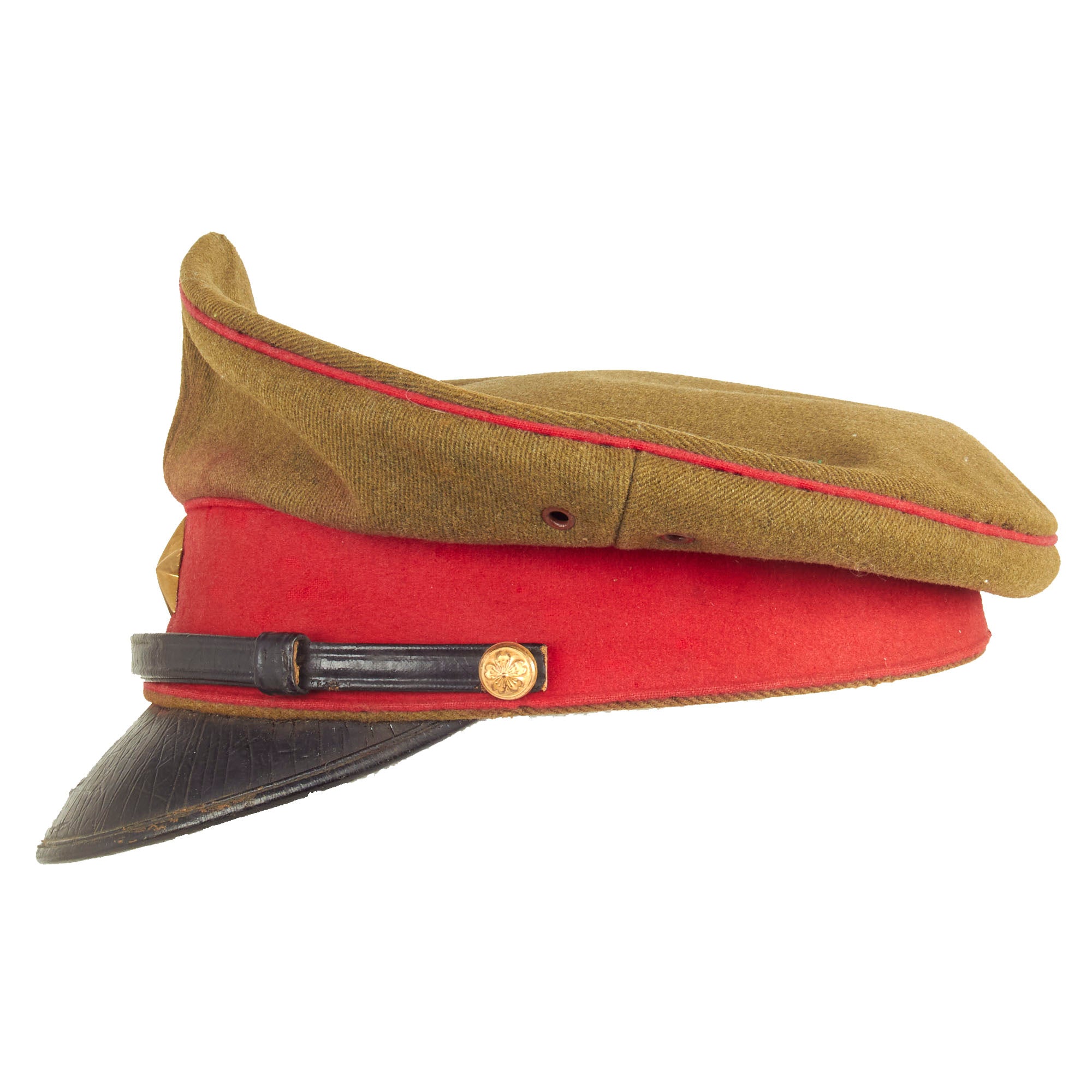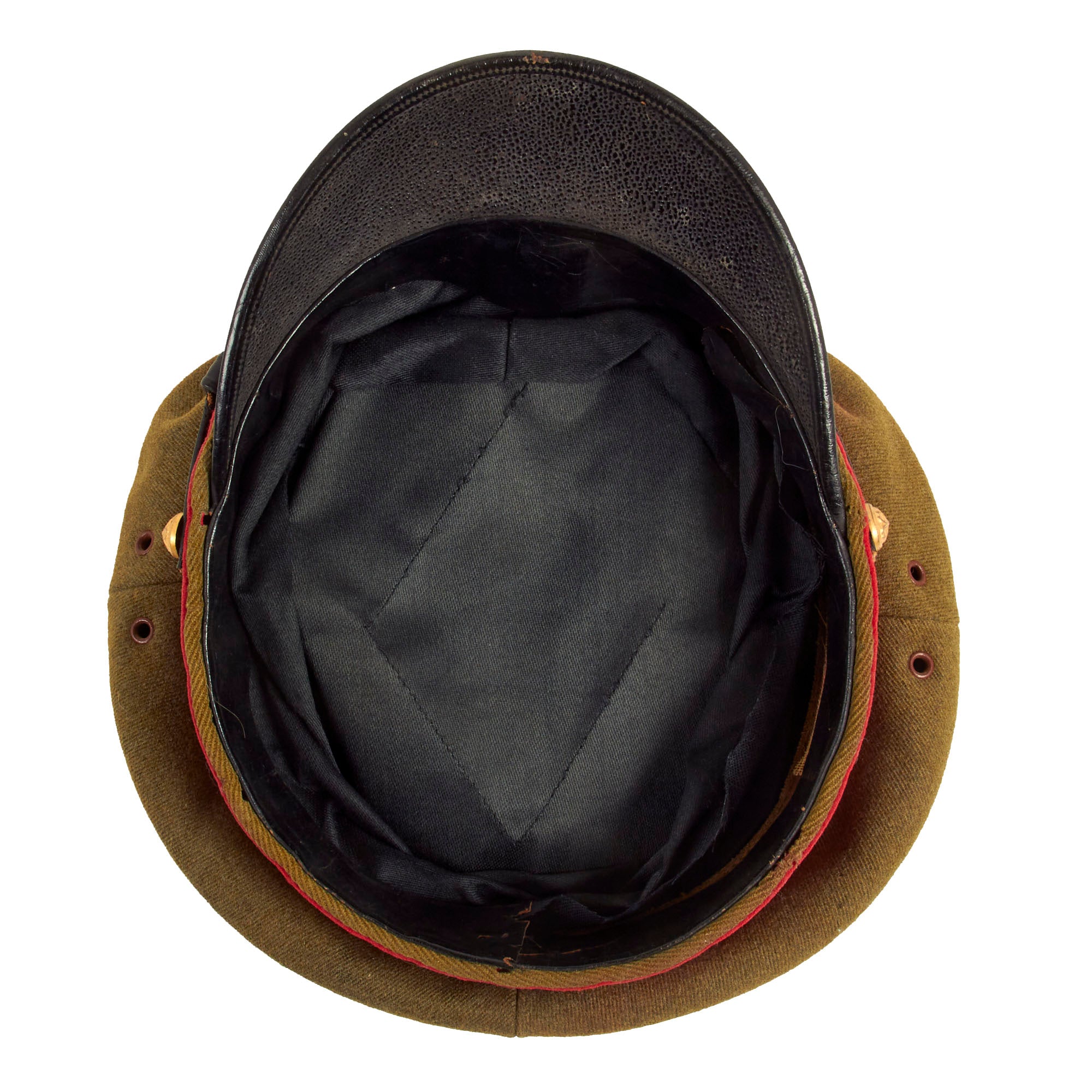 Original Item: Only One Available. This is a solid condition Japanese Imperial Army Type 45 Officer's Visor hat. It has a body of brown/green wool with a top panel seam of red piping, matching the color of the red wool cap band.