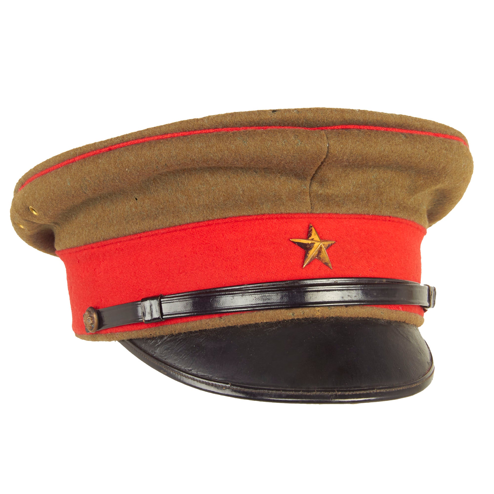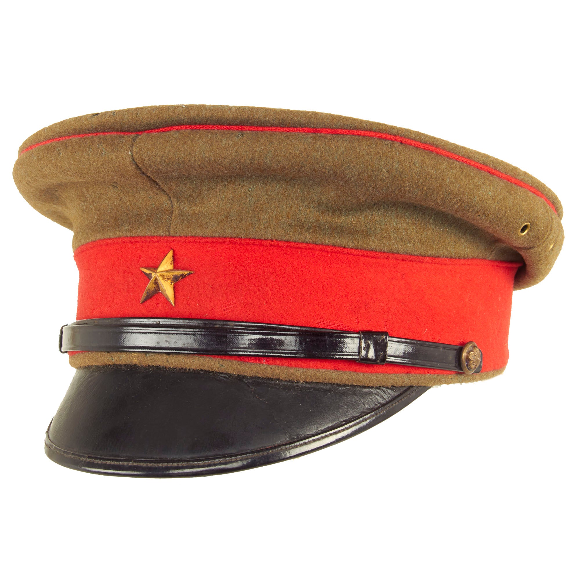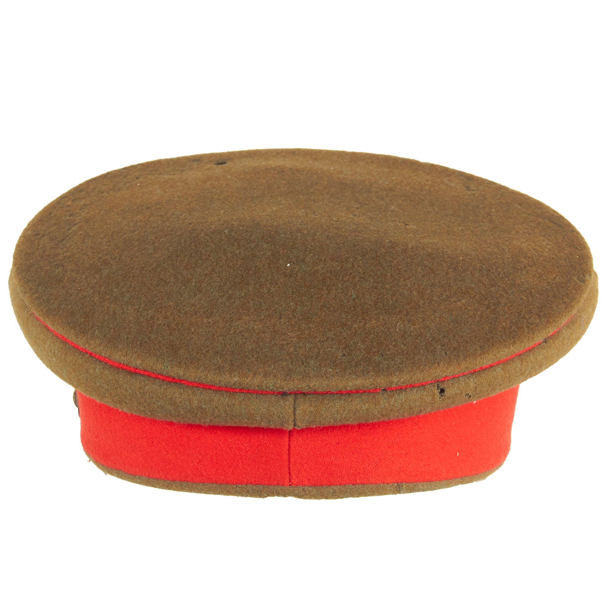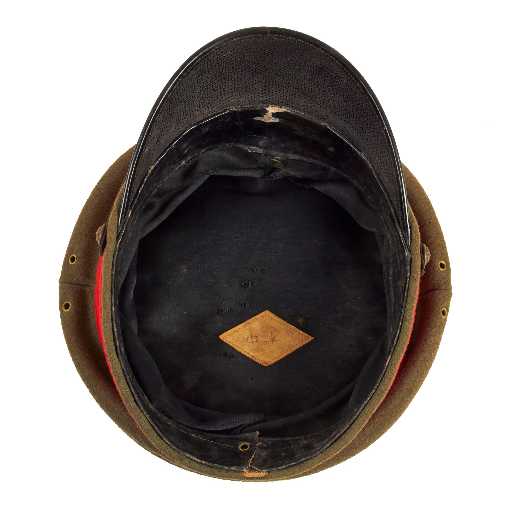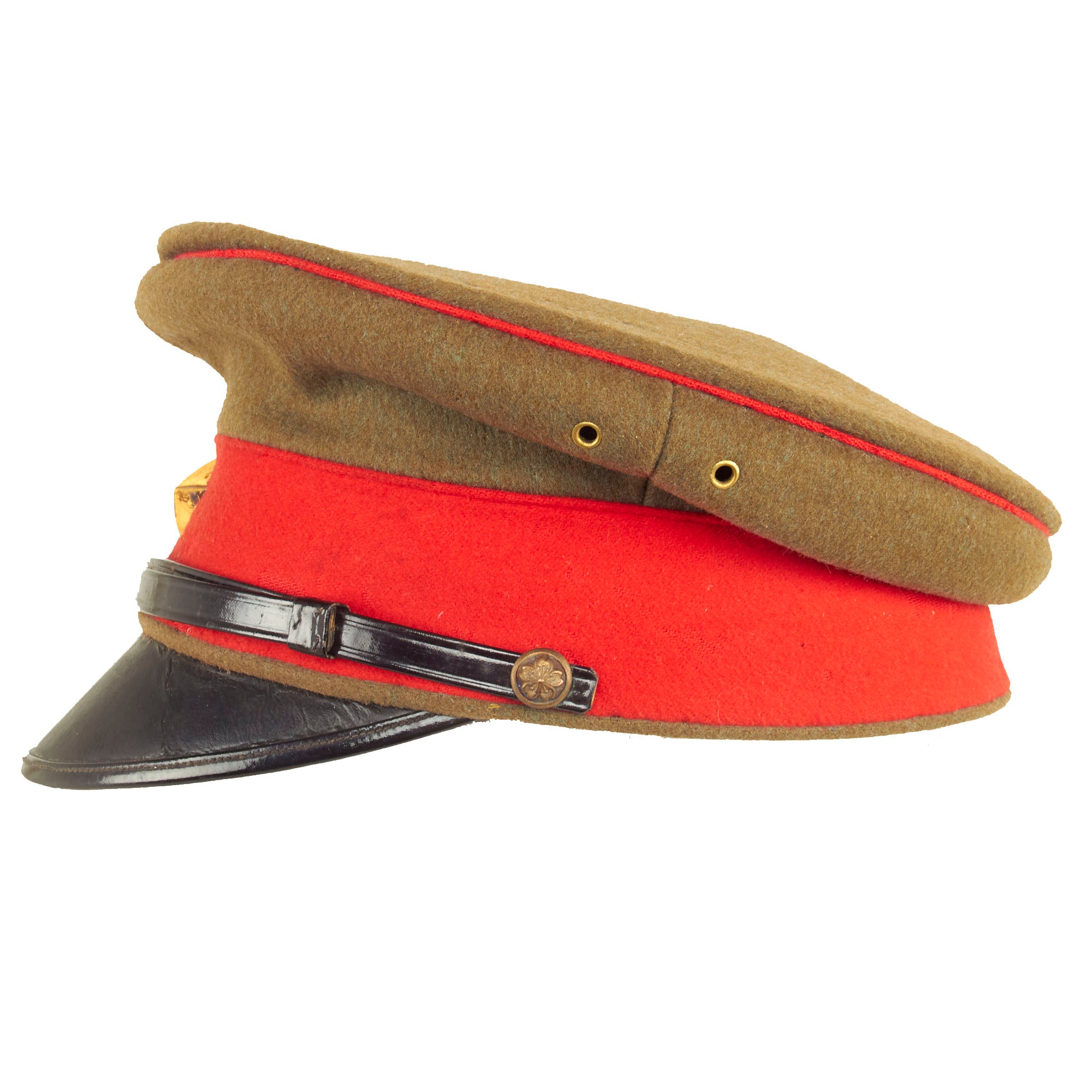 Original Item: Only One Available. This is a solid condition Japanese Imperial Army Type 45 Officer's Visor hat. It has a body of brown/green wool with a top panel seam of red piping, matching the color of the red wool cap band.