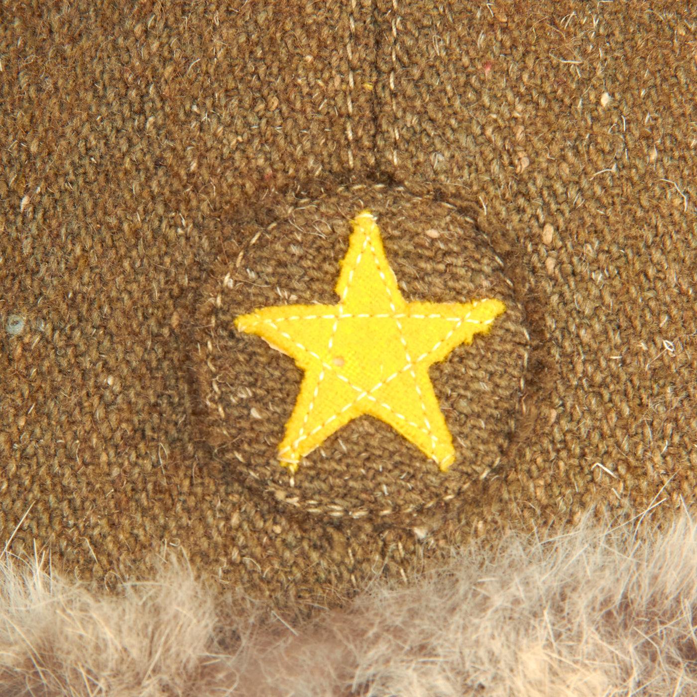 The design of the cap is similar to winter caps used around the world, insulated with an imitation fur flap going around the cap that can be folded down as needed due to colder weather. The portion over the ears is longer, so it can be tied under the chin. The front center of the cap has a yellow Imperial Japanese Army star on it, above the fur front trim. There are also numerous buttons and loops that are used to secure the cap in the two main configurations. There are even small rabbit fur lined ear flap openings, possibly for use with earphones. The cap even has a movable fur "visor", usually stored on the right under the flaps, to further insulate the brow area when needed. Definitely an interesting design.