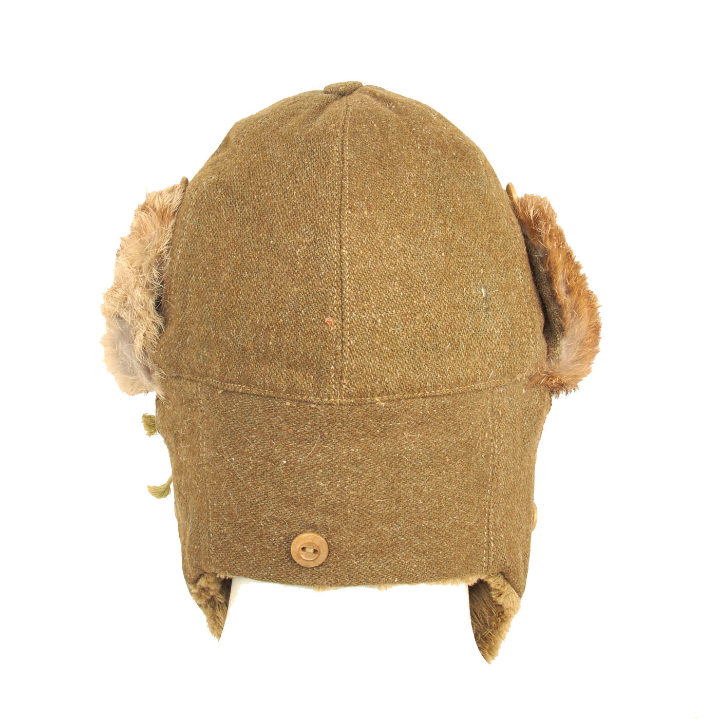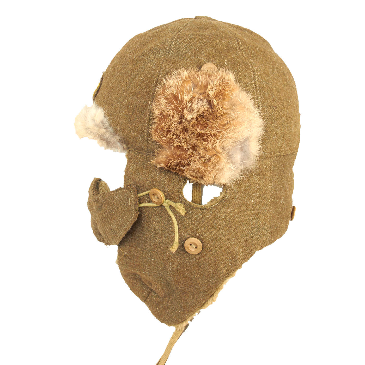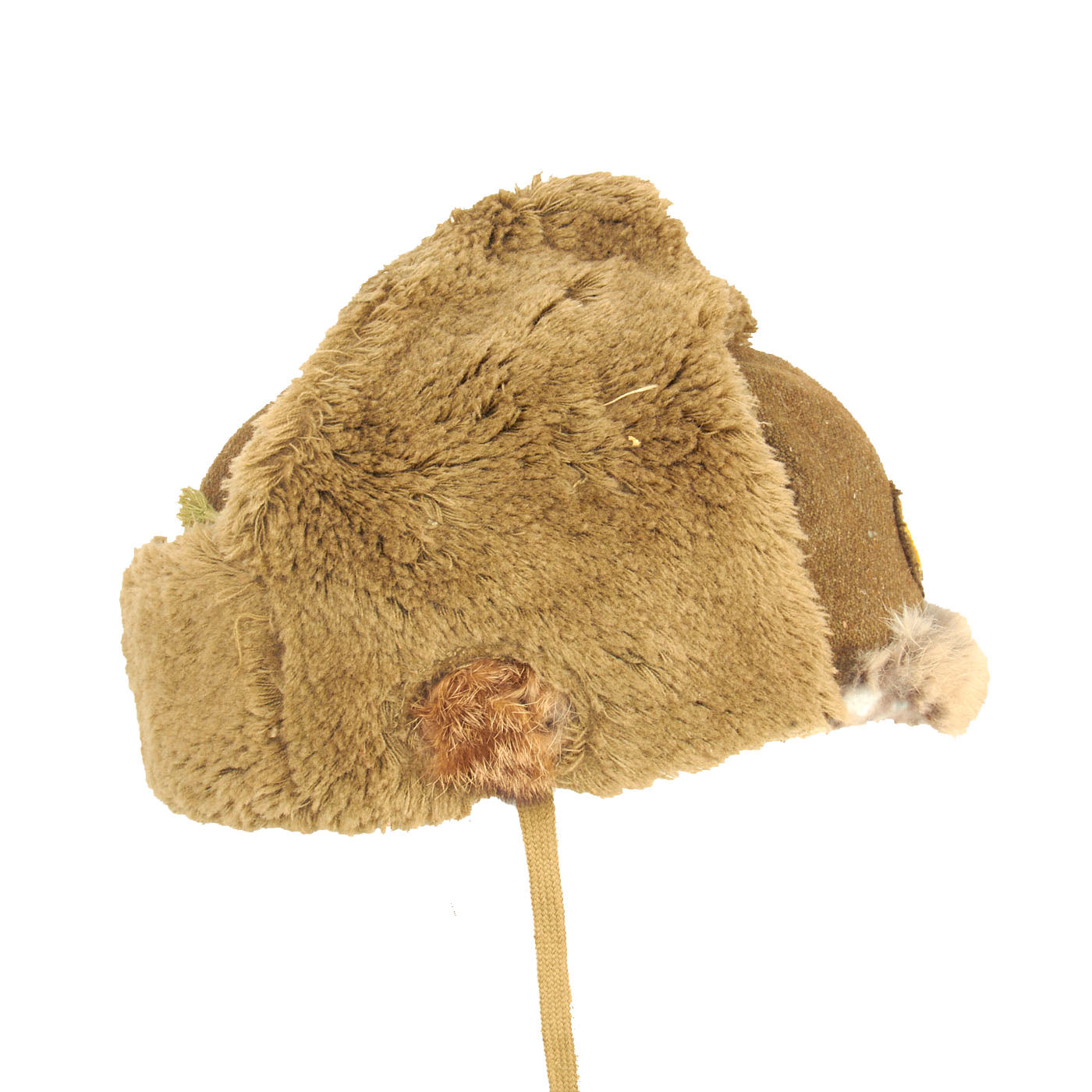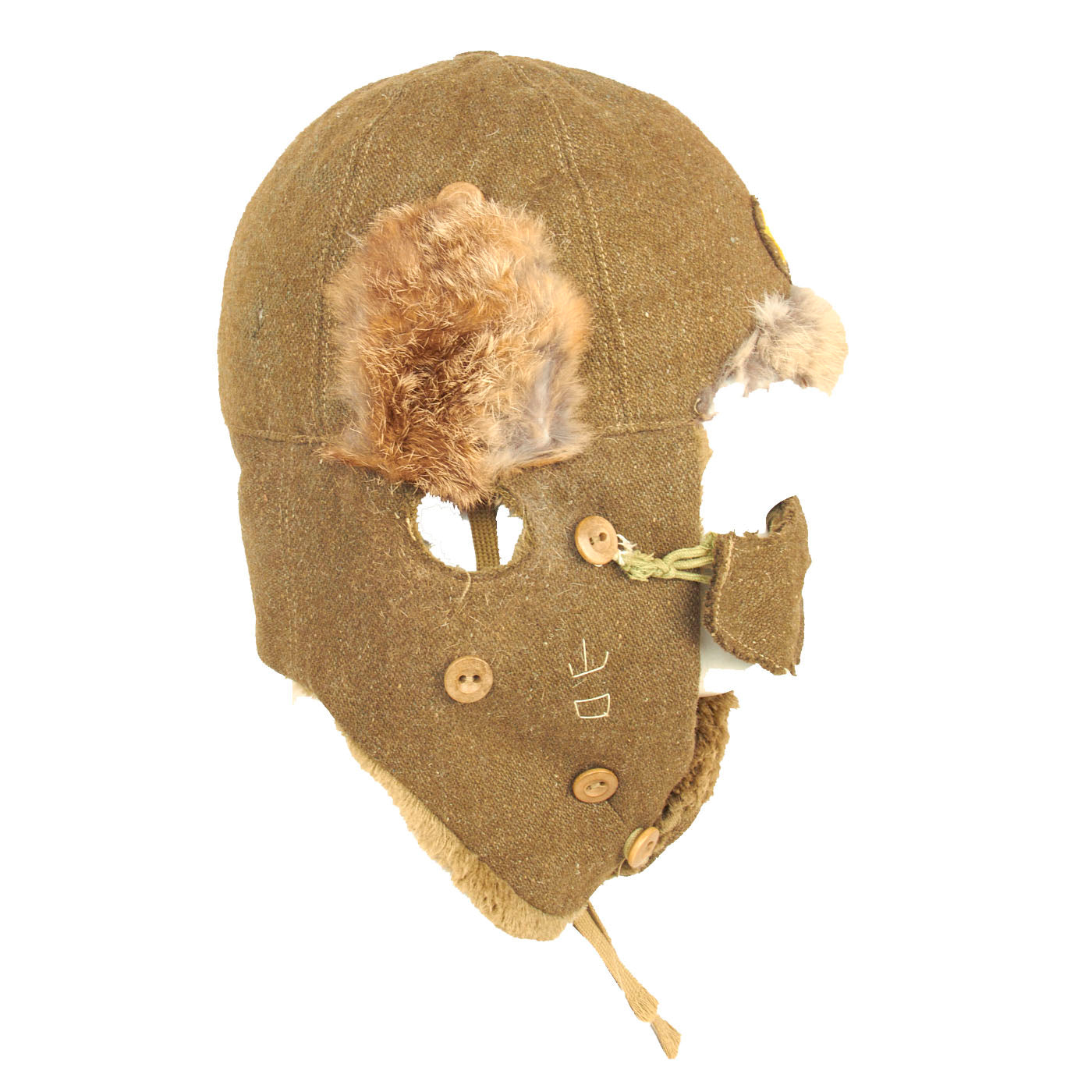 Condition of the cap is very good, with little sign that this was used in the field. The main issue is loss of the fur on the trim above the front. Rabbit fur is very delicate and soft, so this is very common to see on items of this age. The inside of the flap, which is lined with carpet-like imitation fur, is far more resilient, and in great shape.