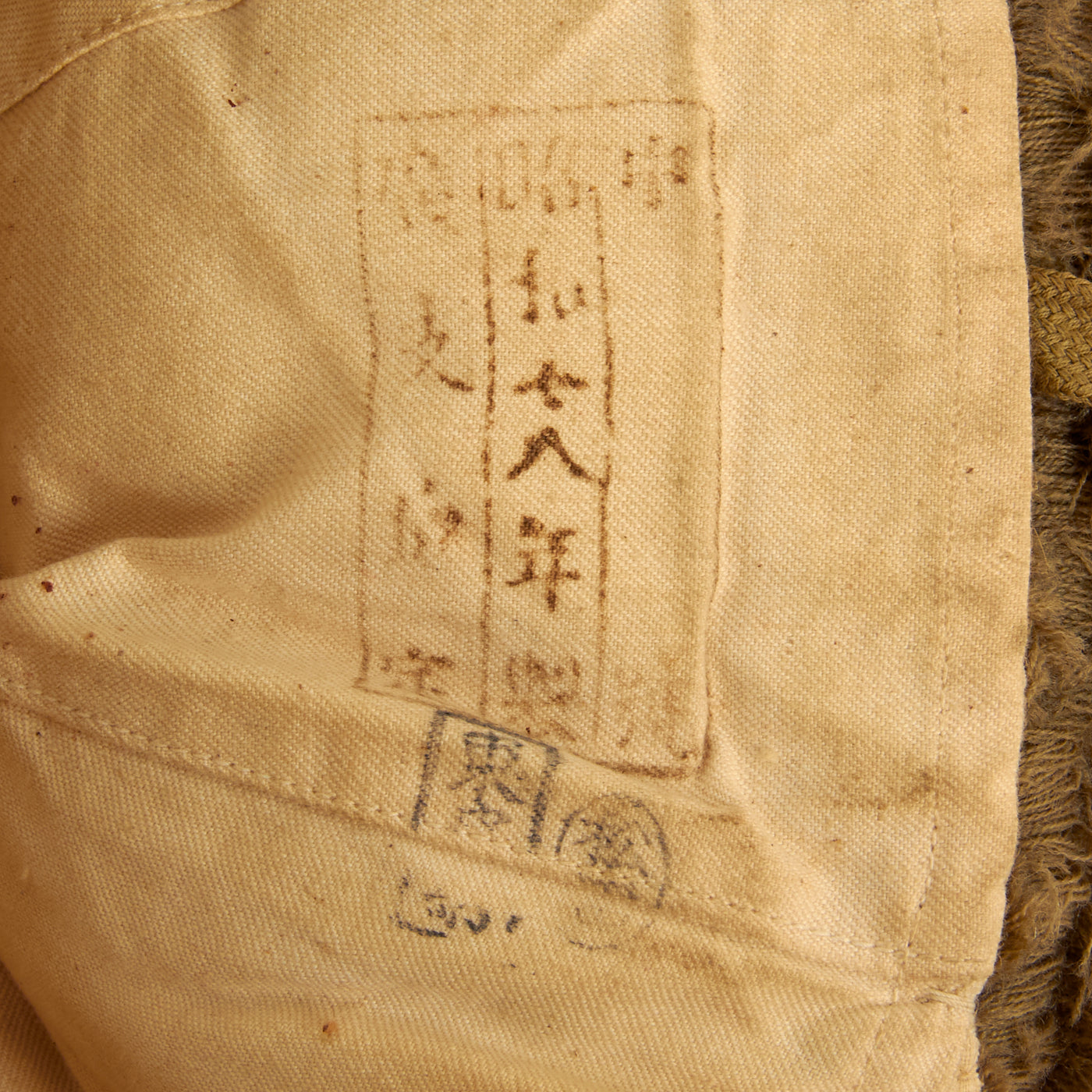 The interior of the cap is lined with white canvas, which has another thicker white canvas piece tag stitched inside of it. This piece is marked with a grid on one side, for the owner to write his name, and the other side has the maker and production information. The center line of this is a date: 昭 和 十 八 年, which reads SHOWA (current reigning emperor) Juu Hachi Nen (18th year of reign - 1943)