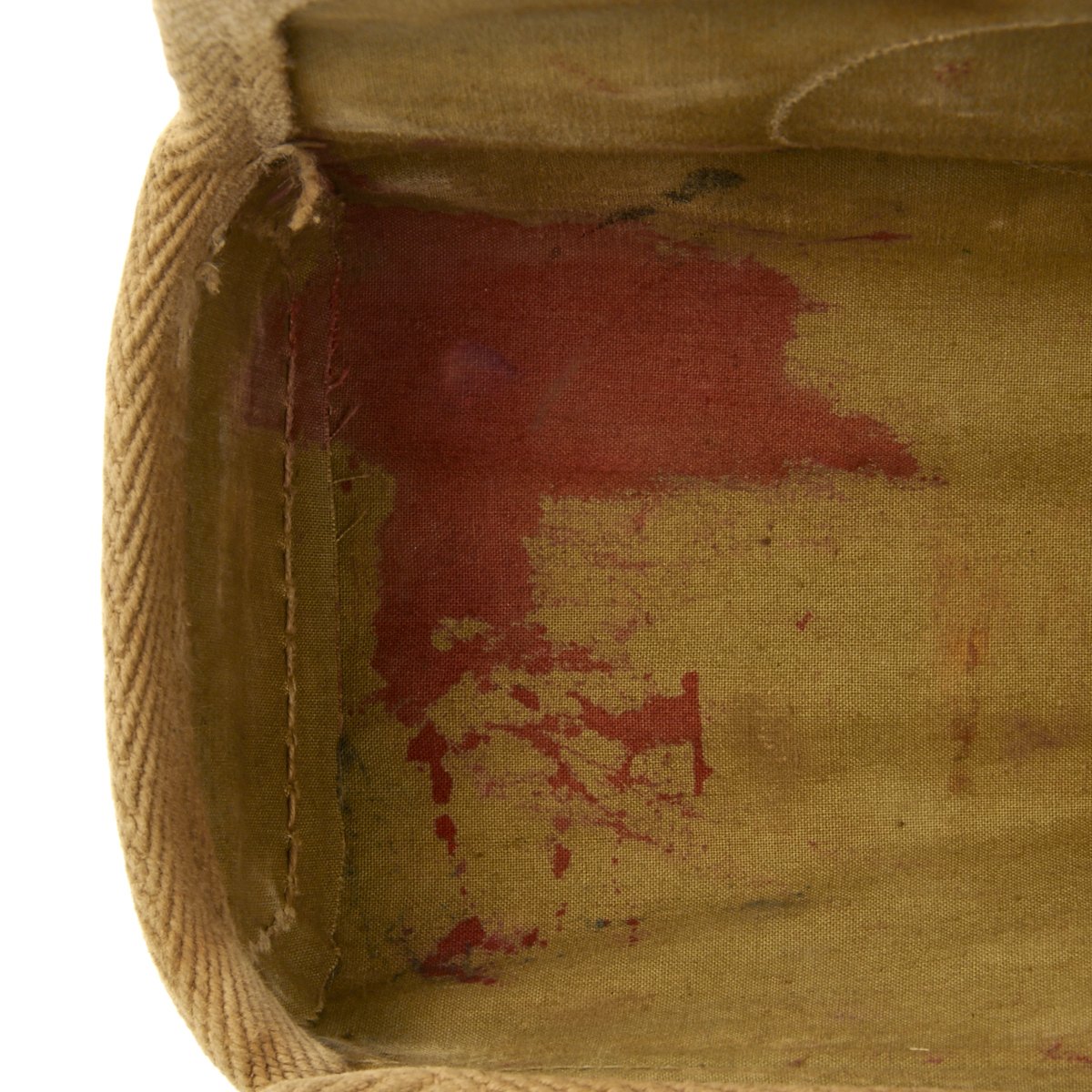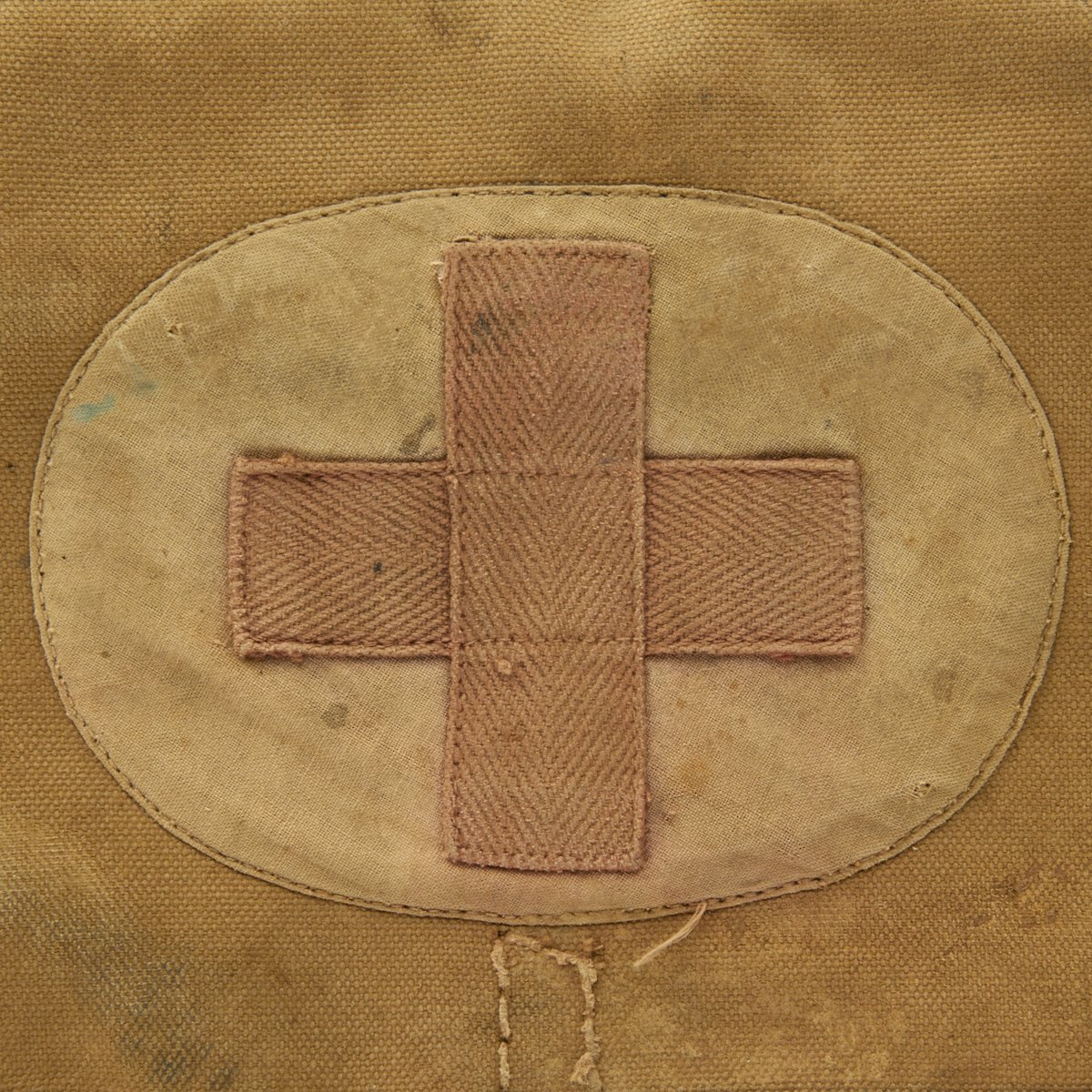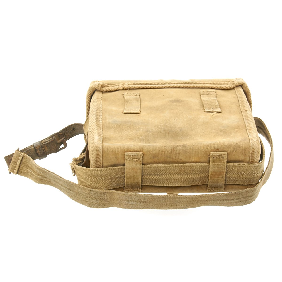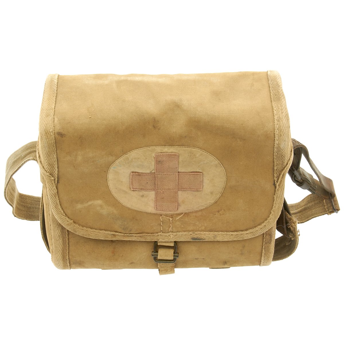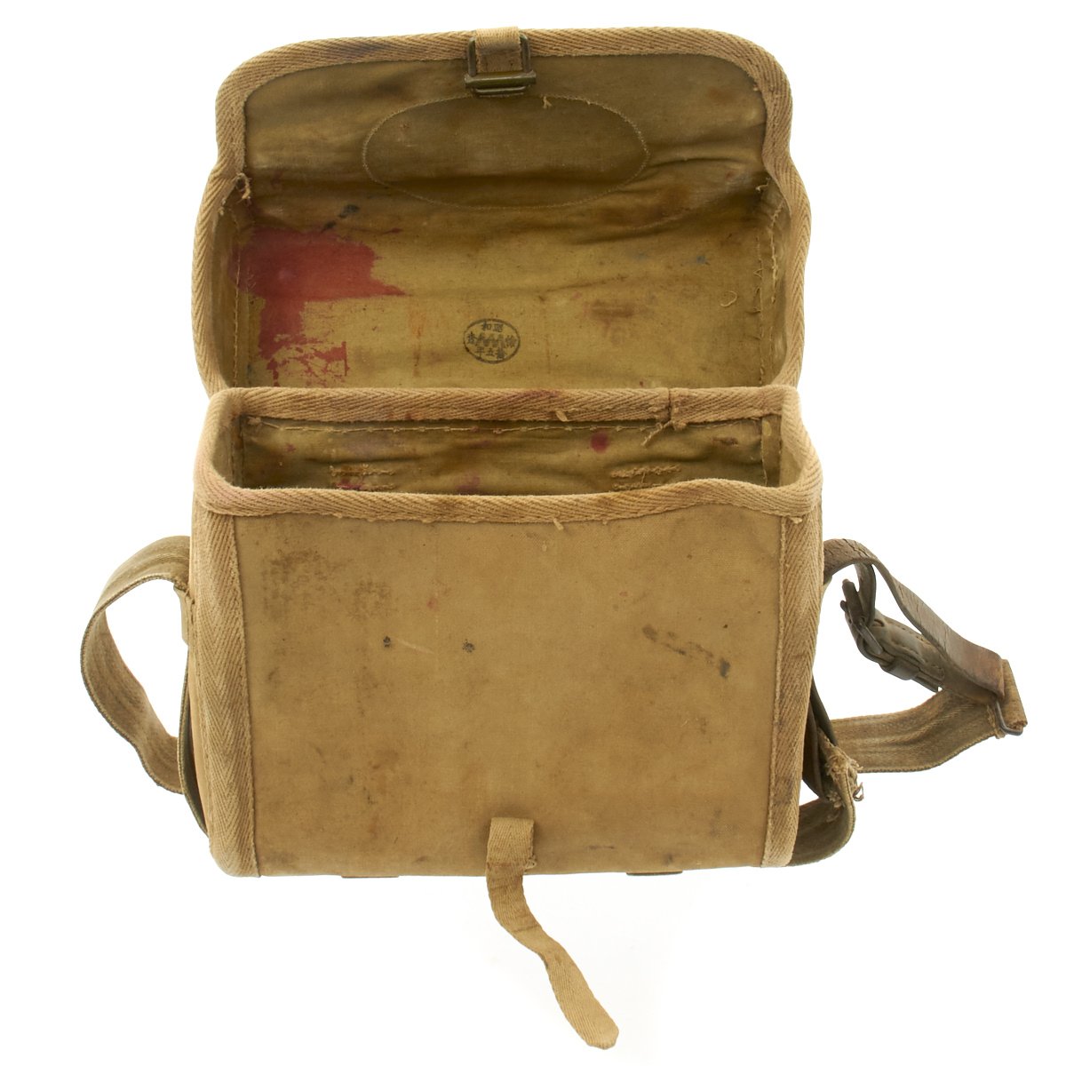 Original Item: Only One Available. Rare reinforced canvas version of an Imperial Japanese medical bag. This style bag replaced the heavier leather version and was the type that a Japanese medical officer used during World War II. The medic bag contained basic medical supplies and equipment which the medic used to administer first-aid to wounded soldiers on the front lines. The bag is offered in very good condition with internal kanji ink stamp. It measures approximately 11" x 9" x 4".