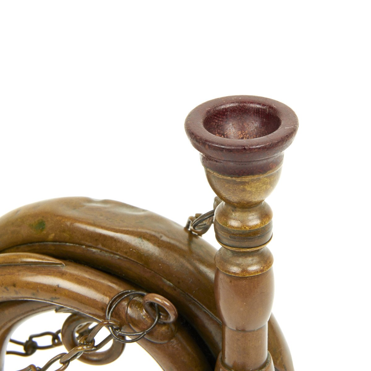 Original Item: Only One Available. This is a genuine Japanese Military Bugle from the WWII period. You can identify it as such by the Bakelite mouth piece and the large clamp that secures the mouthpiece, which is unfortunately missing the wing nut. Bugle is in overall good condition and playable but does have some dings and dents, particularly on the bell. A very rare piece from the Empire of the Rising Sun.
