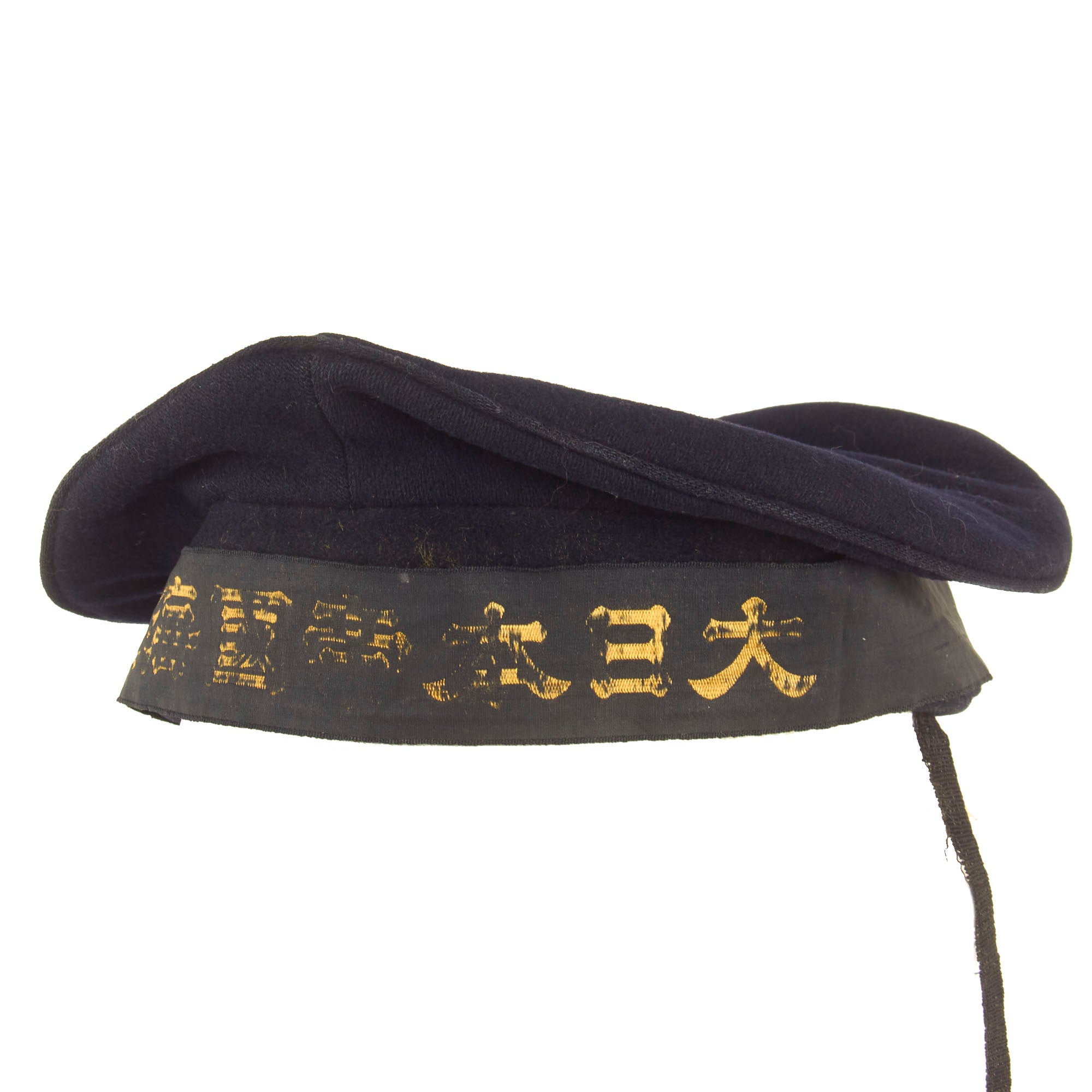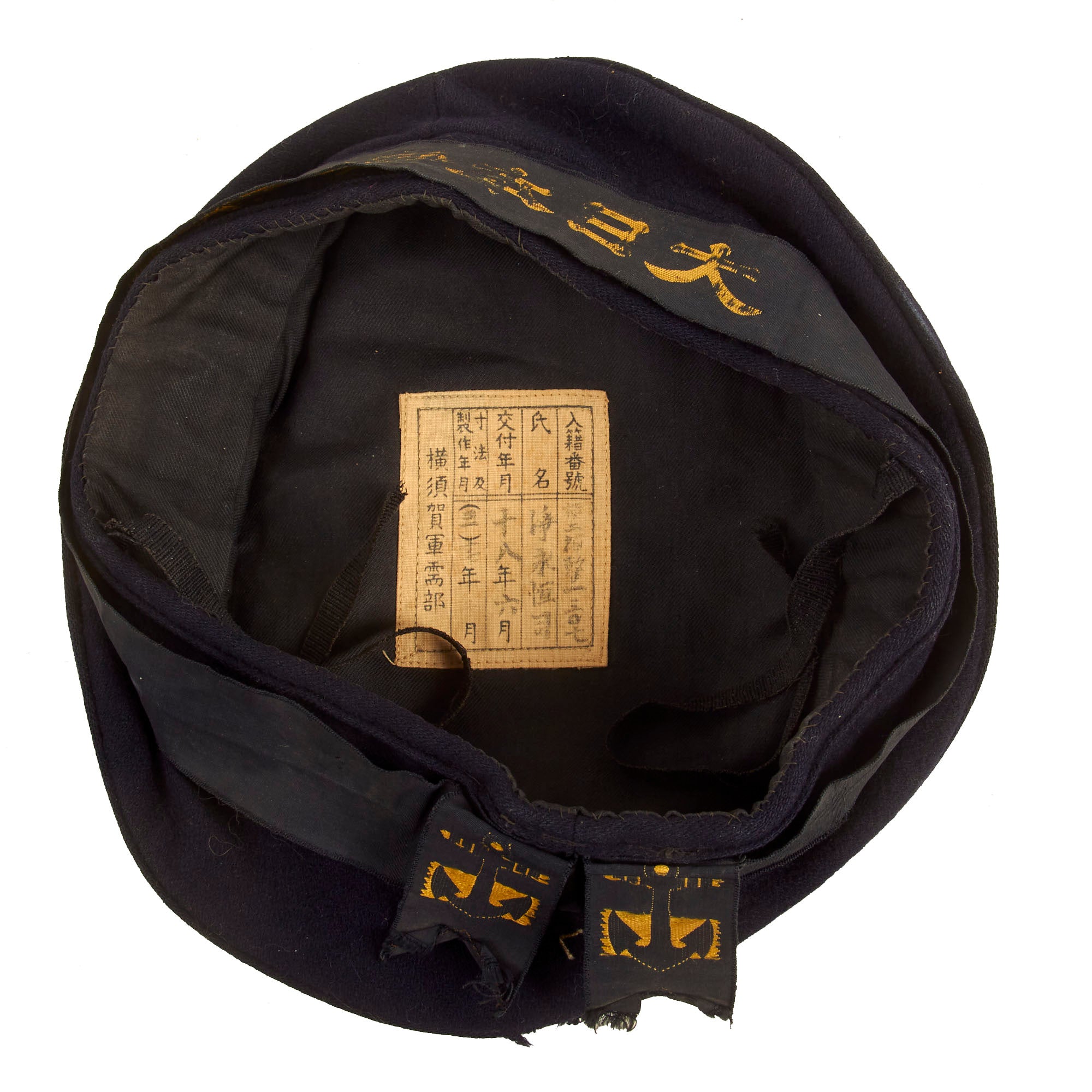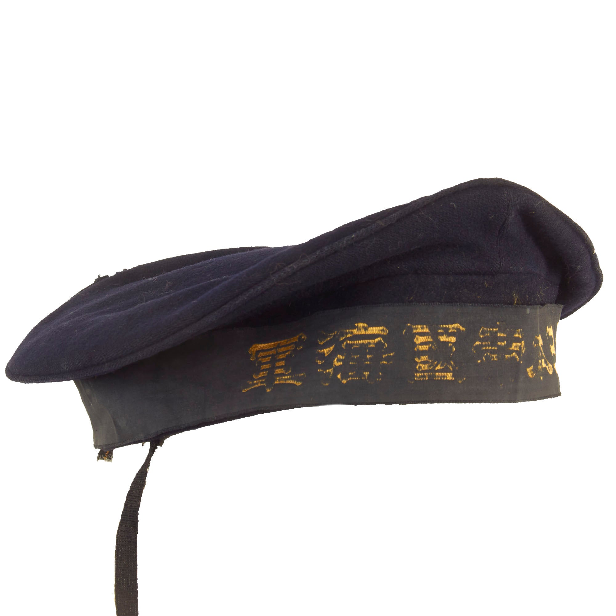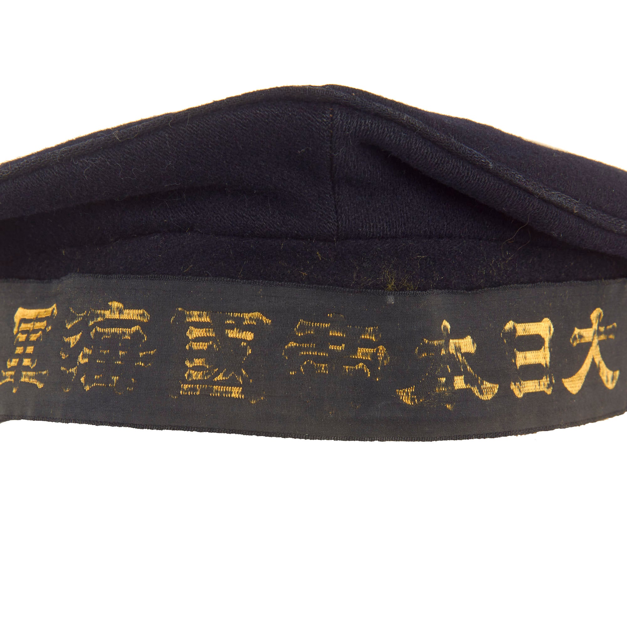 Original Item: Only One Available. Issue quality IJN enlisted hat in dark blue navy wool. Standard cap tally of embroidered golden characters on a black ribbon and two anchors. The talley present is the standard “GREAT JAPAN IMPERIAL NAVY”. The embroidery is still mostly legible but as you can see from, the photos there is thread loss.
