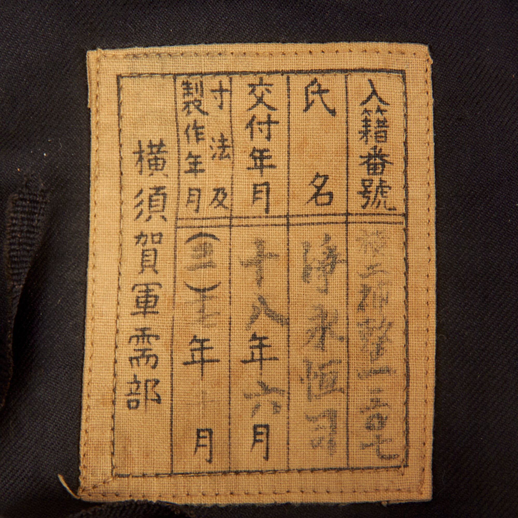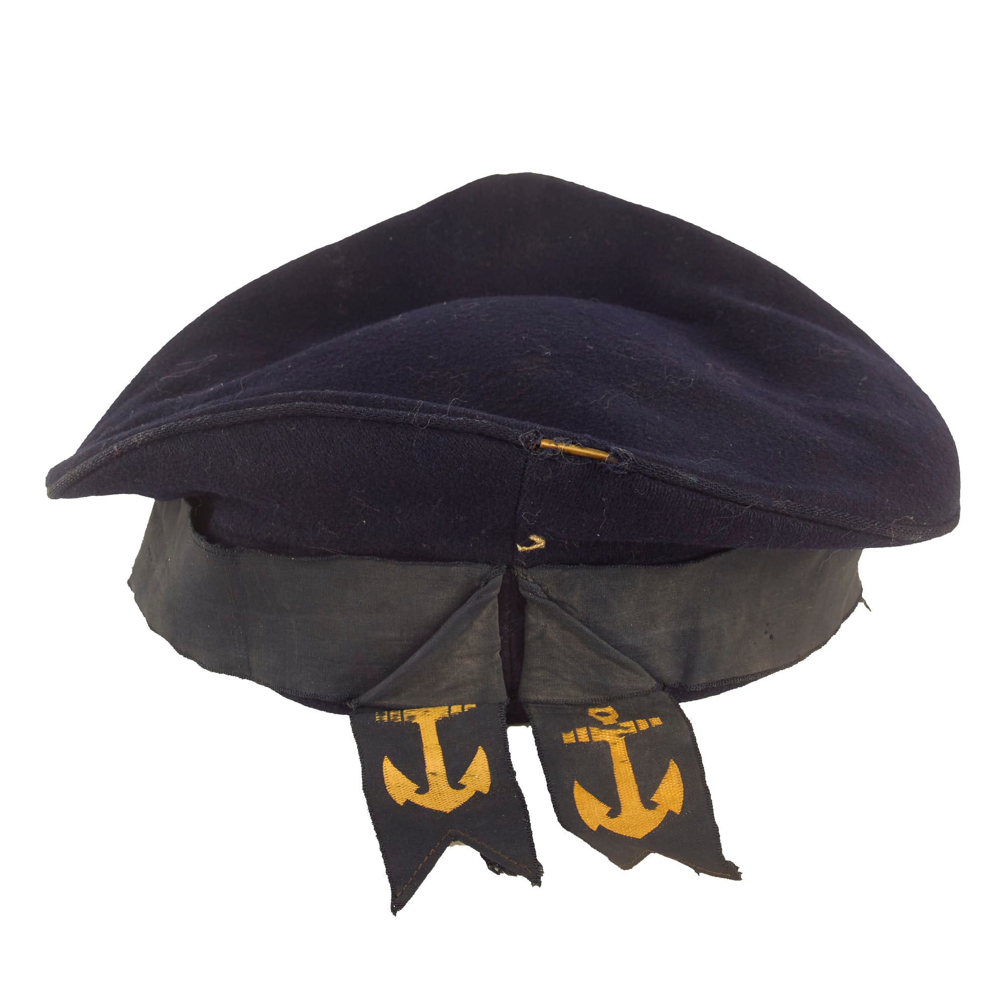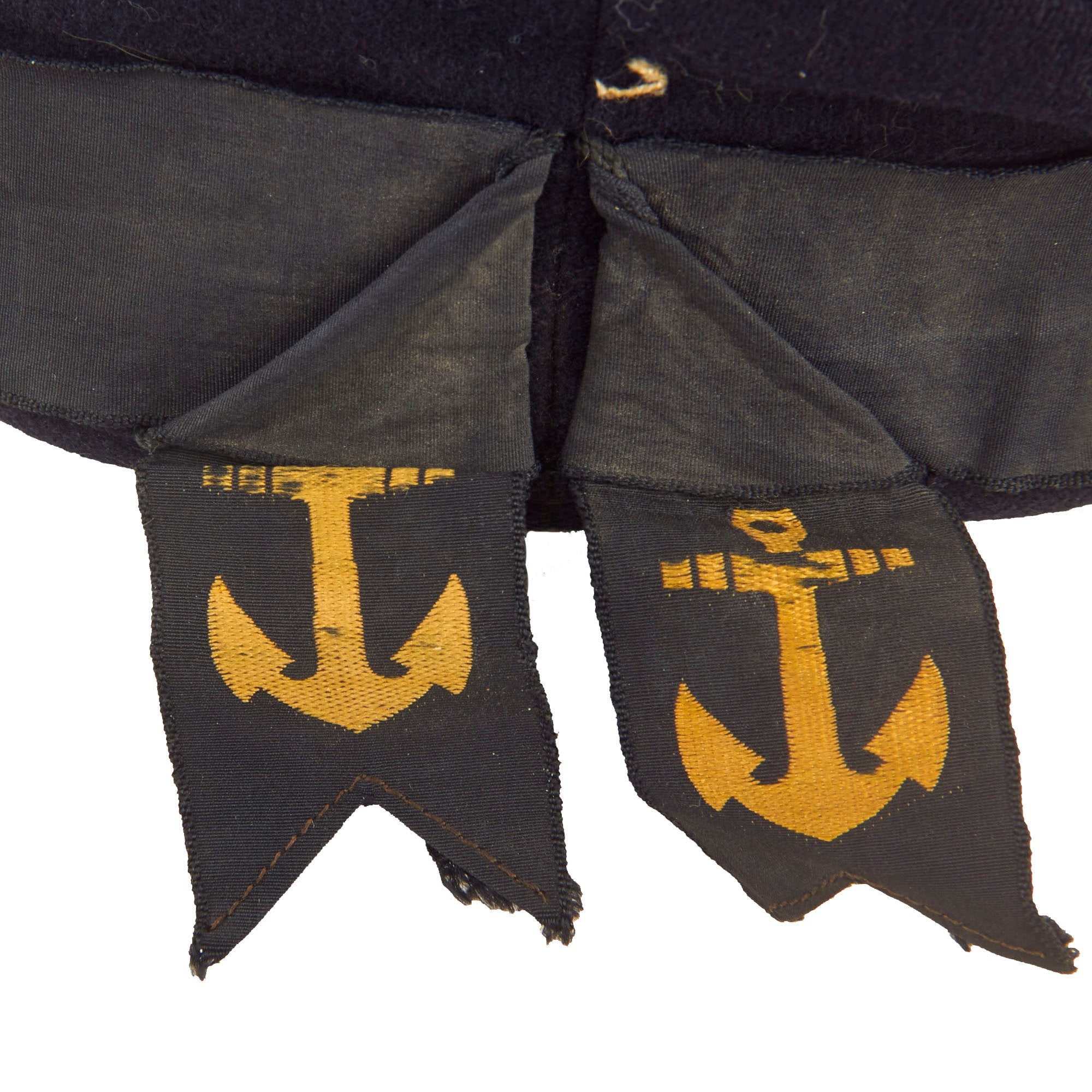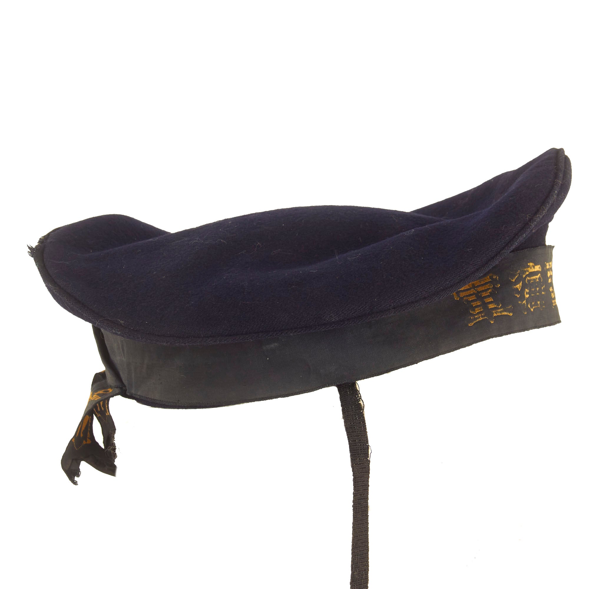 Original Item: Only One Available. Issue quality IJN enlisted hat in dark blue navy wool. Standard cap tally of embroidered golden characters on a black ribbon and two anchors. The talley present is the standard “GREAT JAPAN IMPERIAL NAVY”. The embroidery is still mostly legible but as you can see from, the photos there is thread loss.