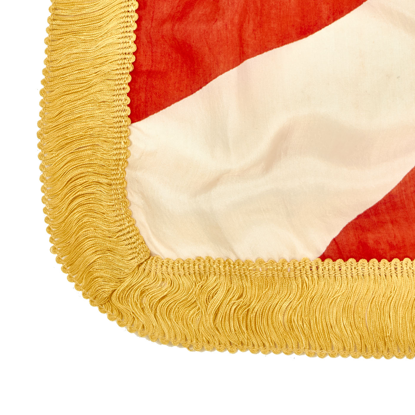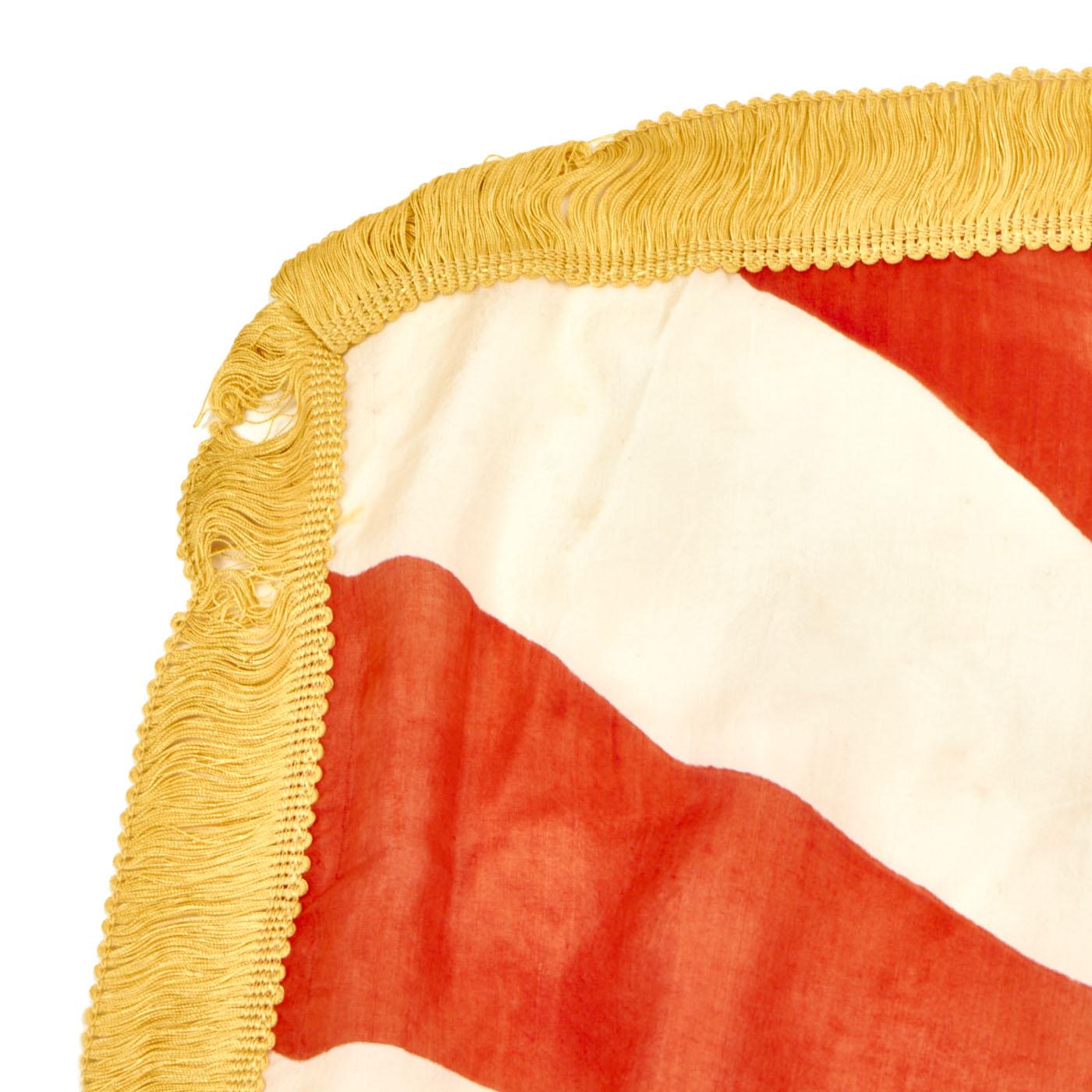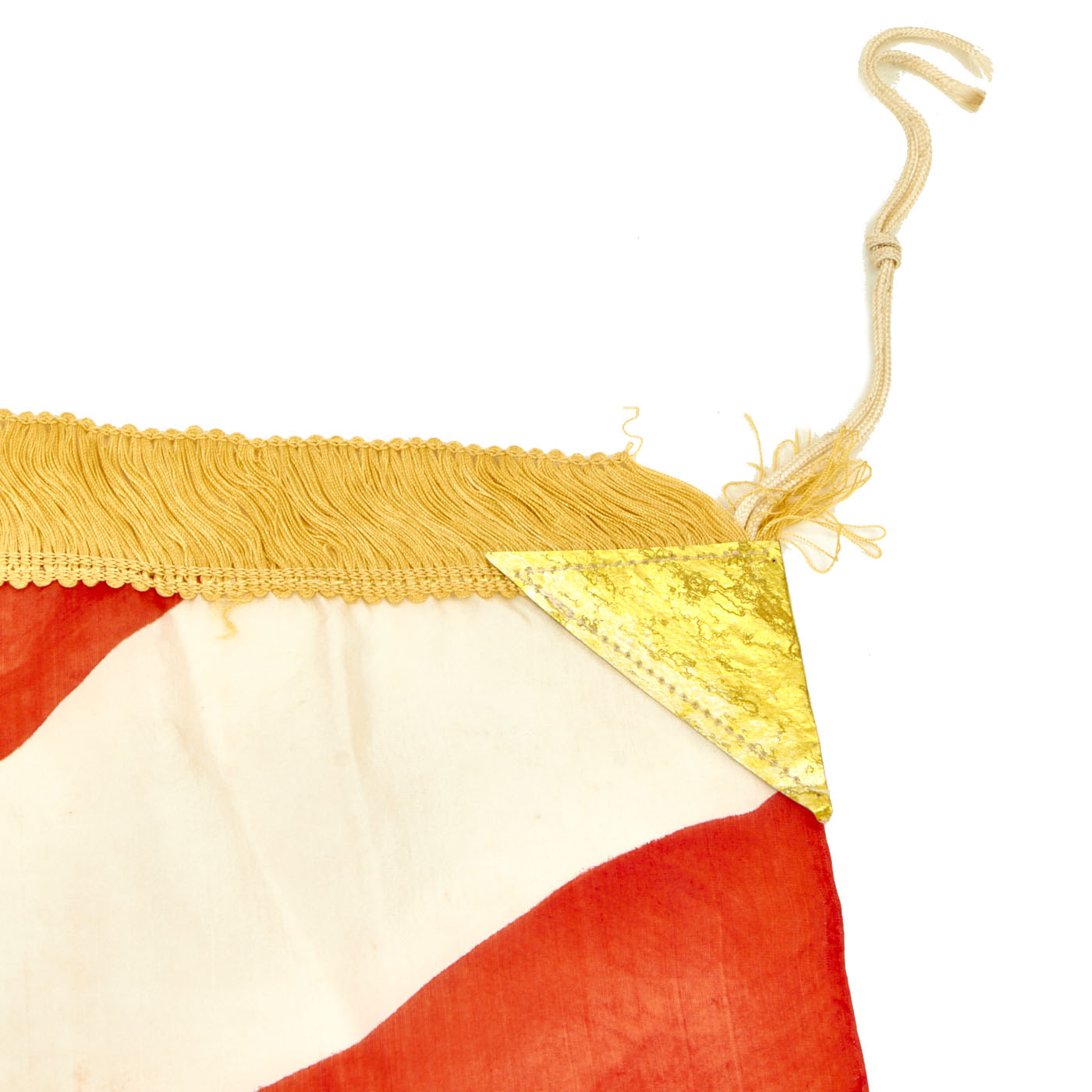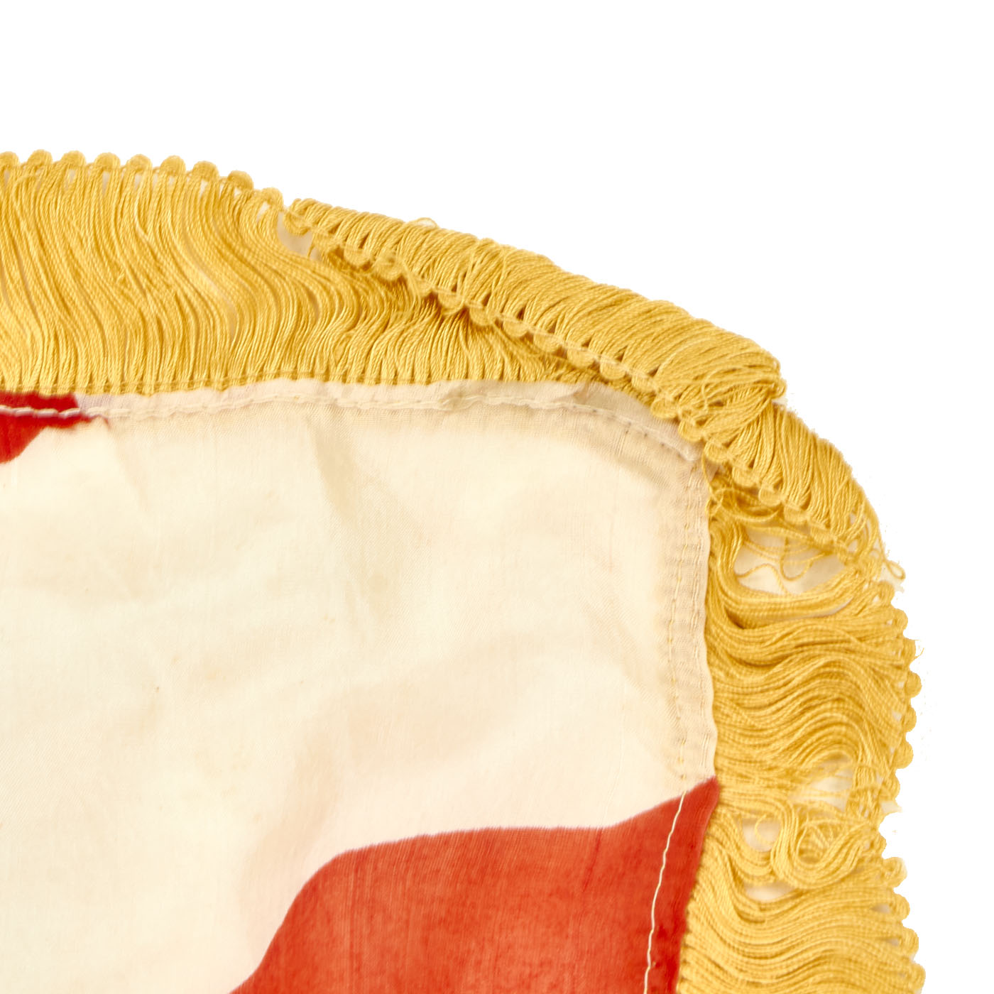 This is possibly one of the nicest rising sun flags we have offered. It is a very nice two piece rising sun flag that measures approximately 24" x 34", and is made of very fine woven cloth, most likely rayon. It is in very good condition, with a dyed red "Sun" in the middle, with rays going out to the edge of the flag. It features gold foiled leather reinforcements without tie strings on the staff side and nicely stitched borders. The gold fringe on the borders indicates parade and or ceremonial use, as well as personal use for homes and organizations.