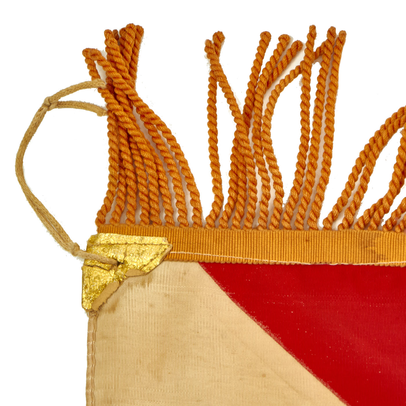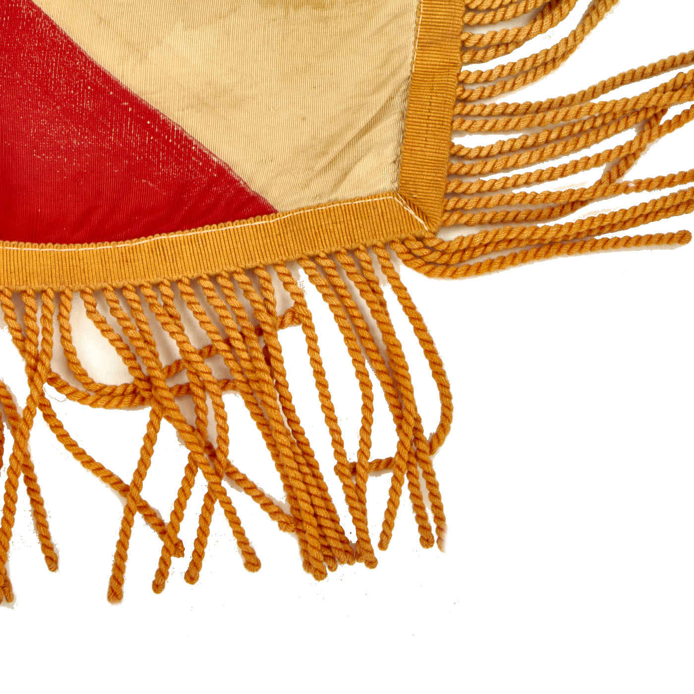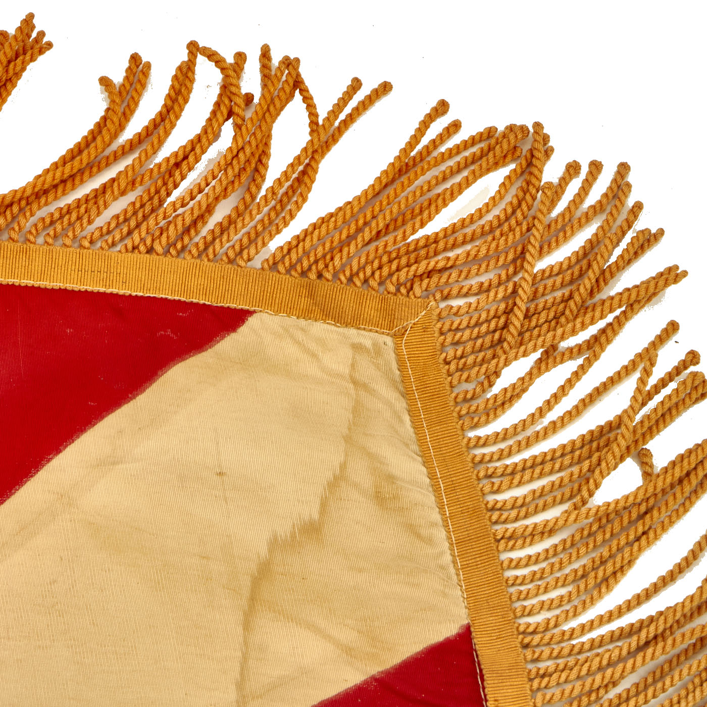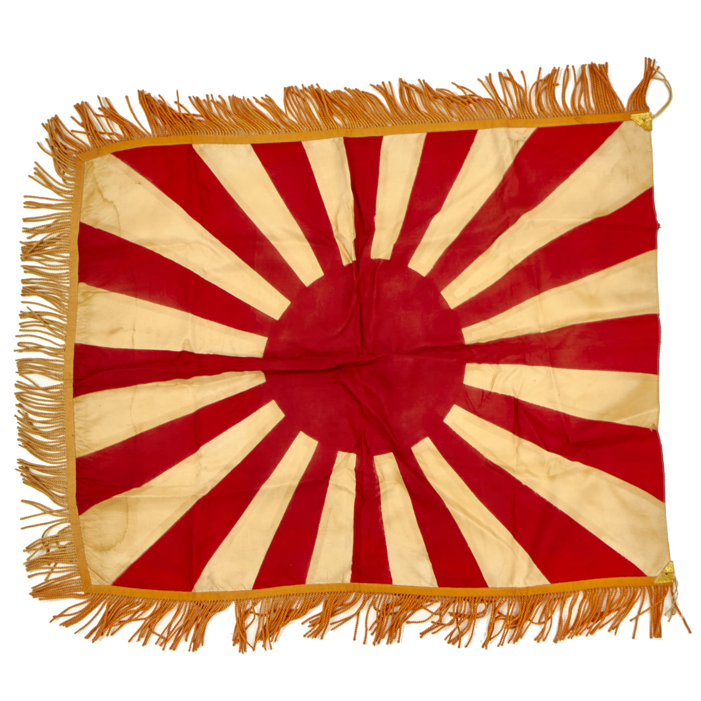 This is possibly one of the nicest rising sun flags we have offered. It is a very nice two piece rising sun flag that measures approximately 38" x 36", and is made of very fine woven cloth, most likely rayon. It is in very good condition, with a dyed red "Sun" in the middle, with rays going out to the edge of the flag. It features leather reinforcements with tie strings on the staff side and nicely stitched borders. The gold fringe on the borders indicates parade and or ceremonial use, as well as personal use for homes and organizations.