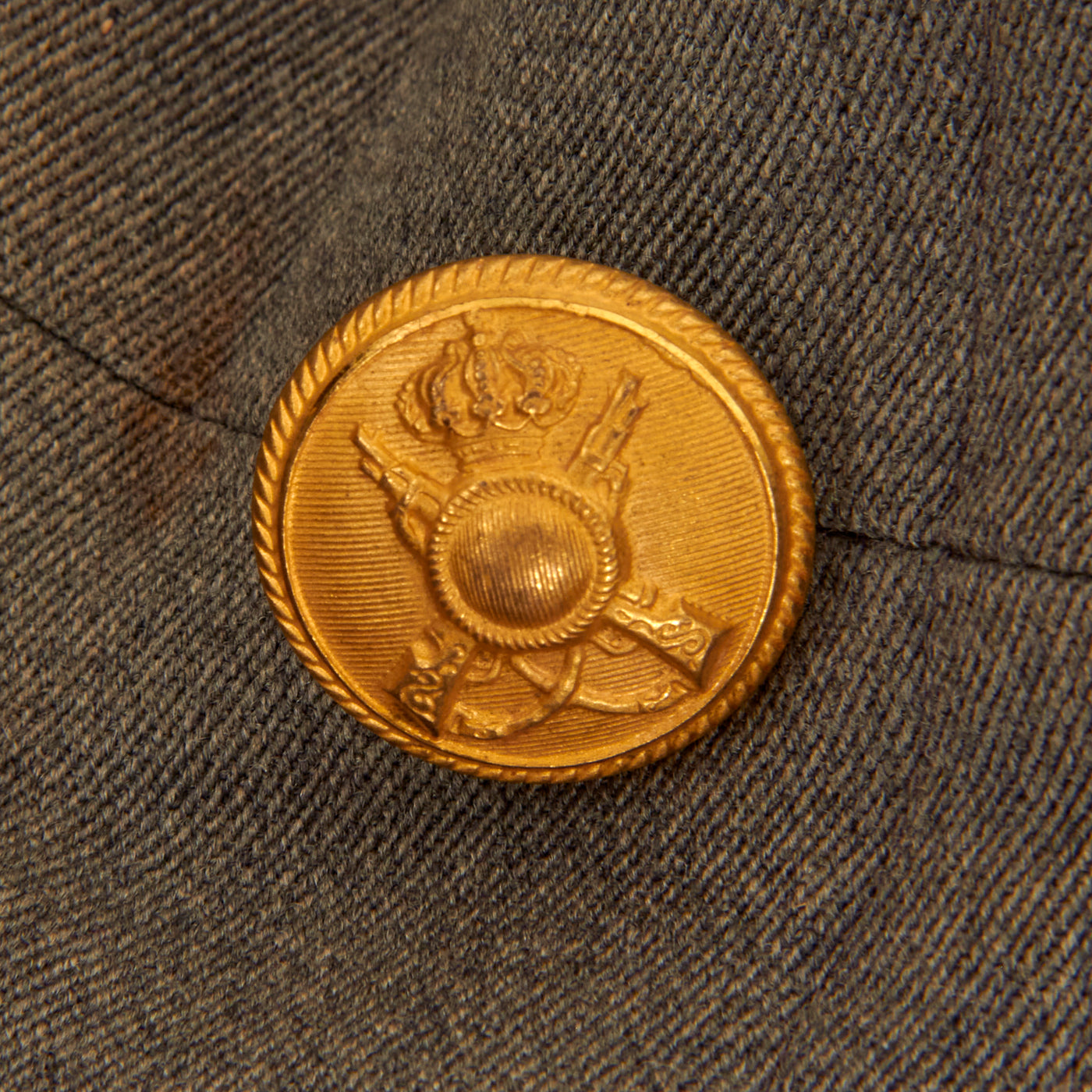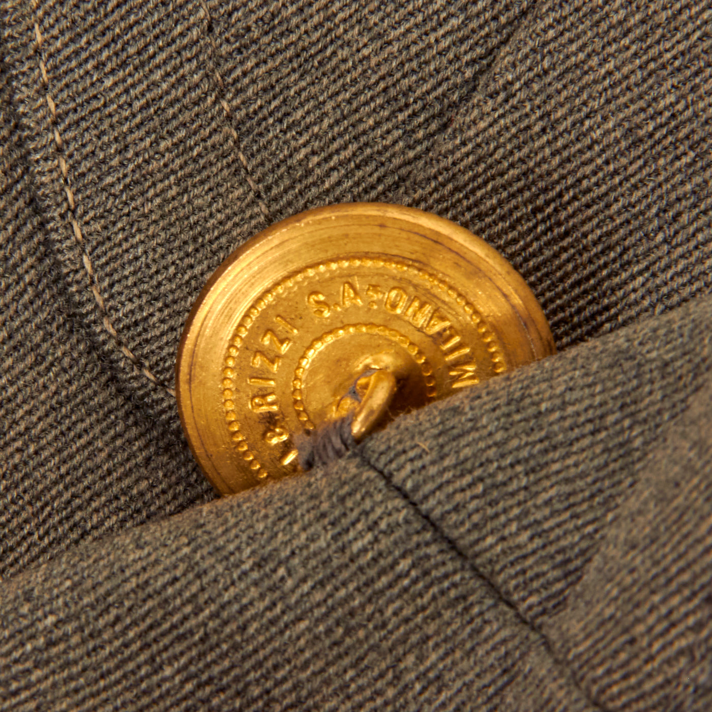 The fine two pocket four button wool tunic is made of a fine gabardine elastique wool, with turnback cuffs, and velvet collar. The Infantry Officer Shoulder titles are a brass false-embroidered design, and match one another as well. Each Collar is fitted with the Mostrine (collar tab) of the 36th Division.