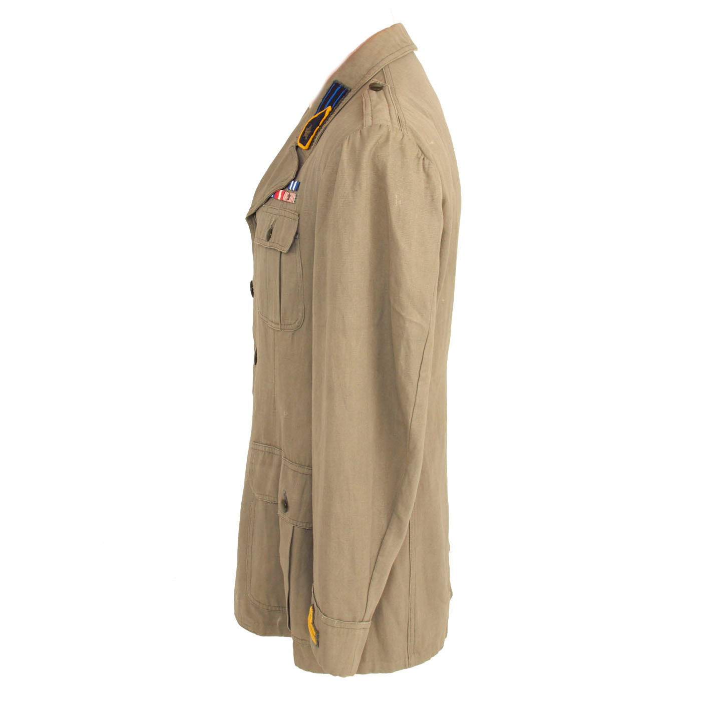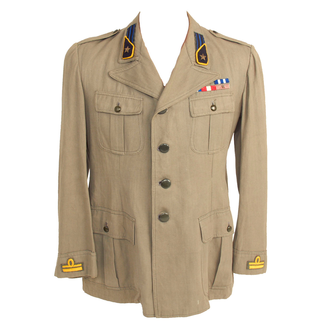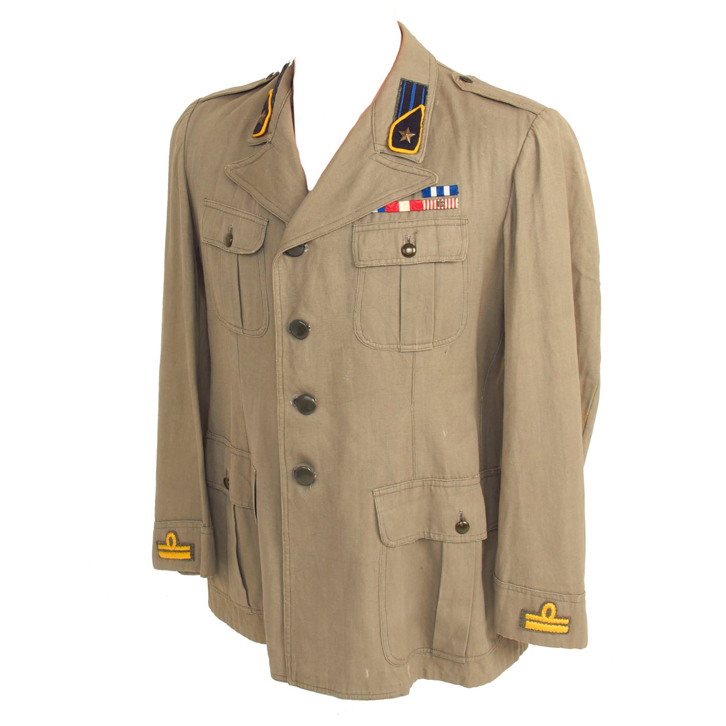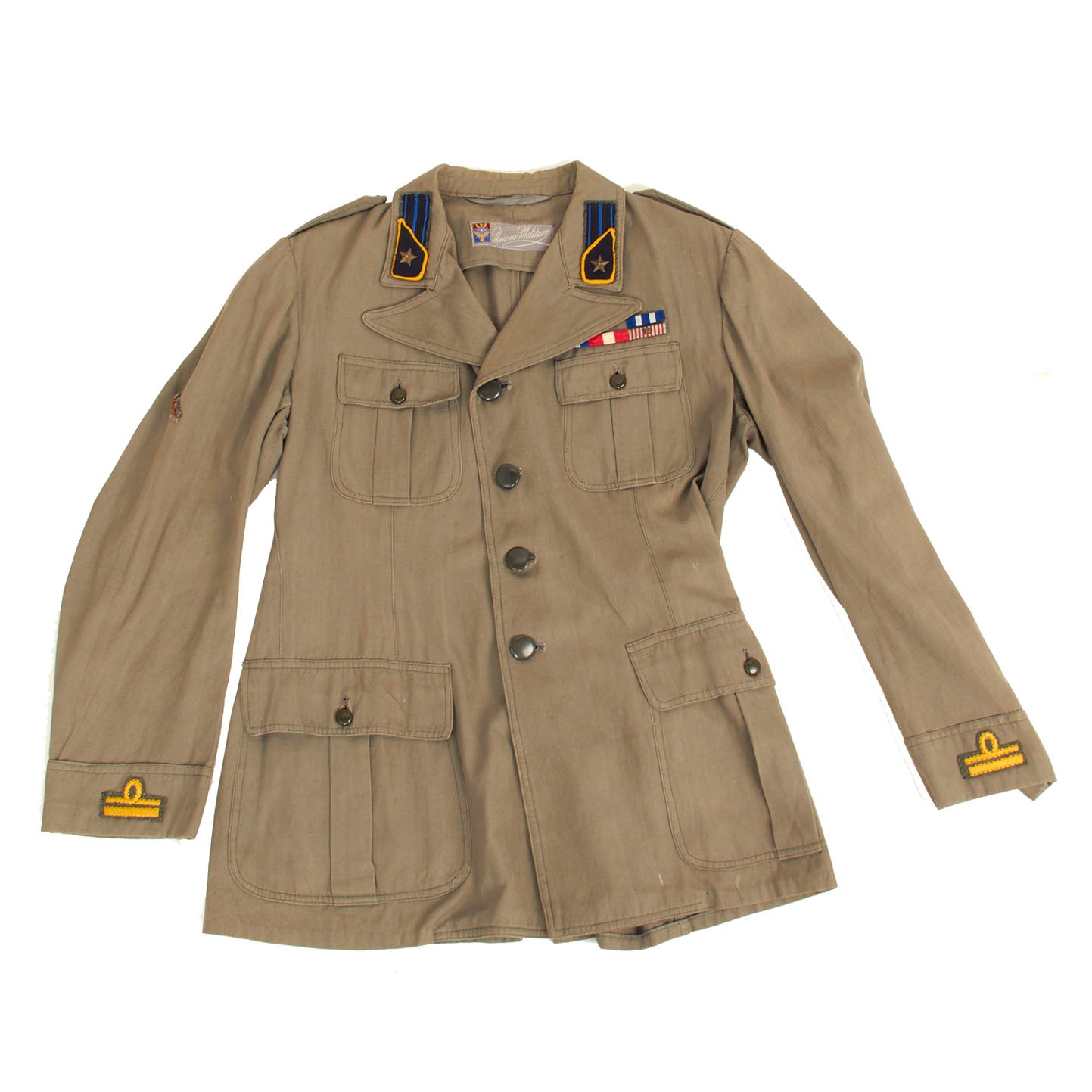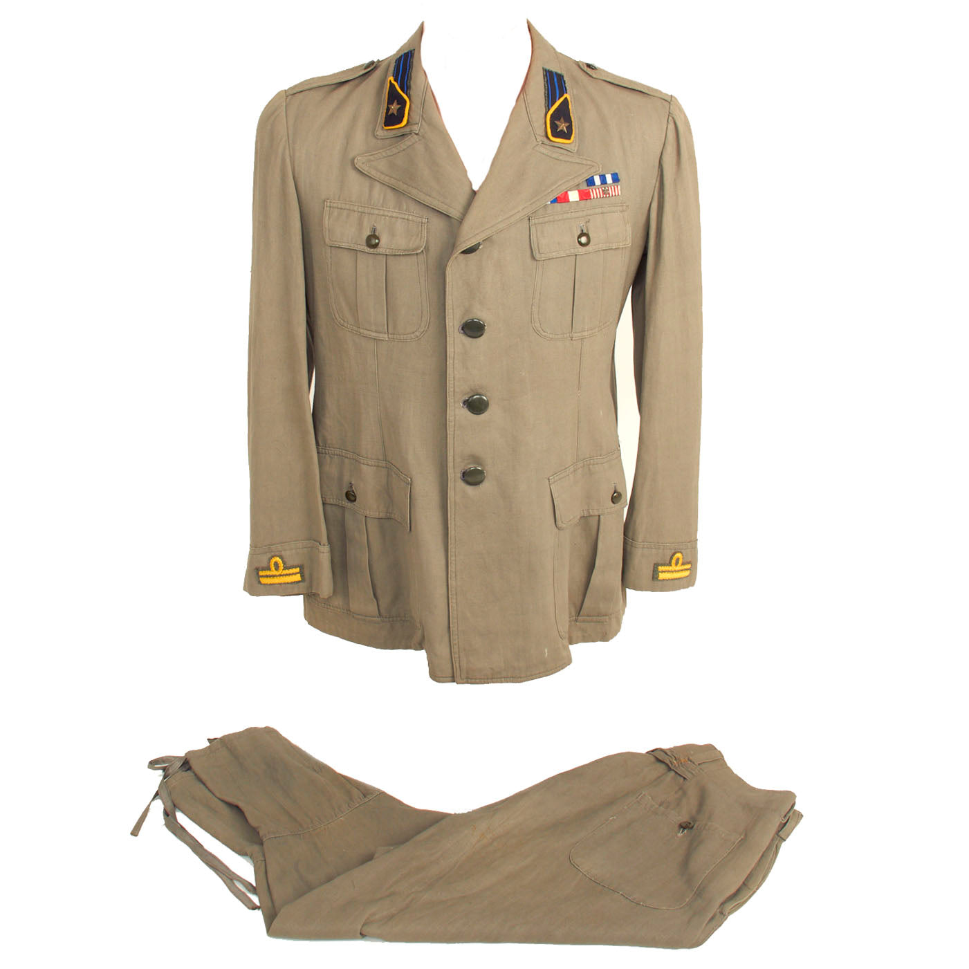 Original Item: Only One Available. World War Two Italian Army Officer Tropical jacket and pants constructed of green cotton. Lapel and sleeve rank insignia for Tenente (First Lieutenant). Single breasted design with four button front and four external pockets. Comes complete with stitched medal ribbons. Overall very good condition.