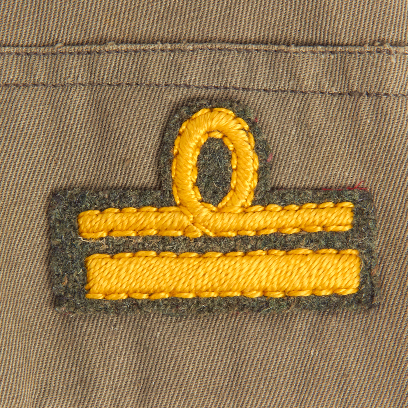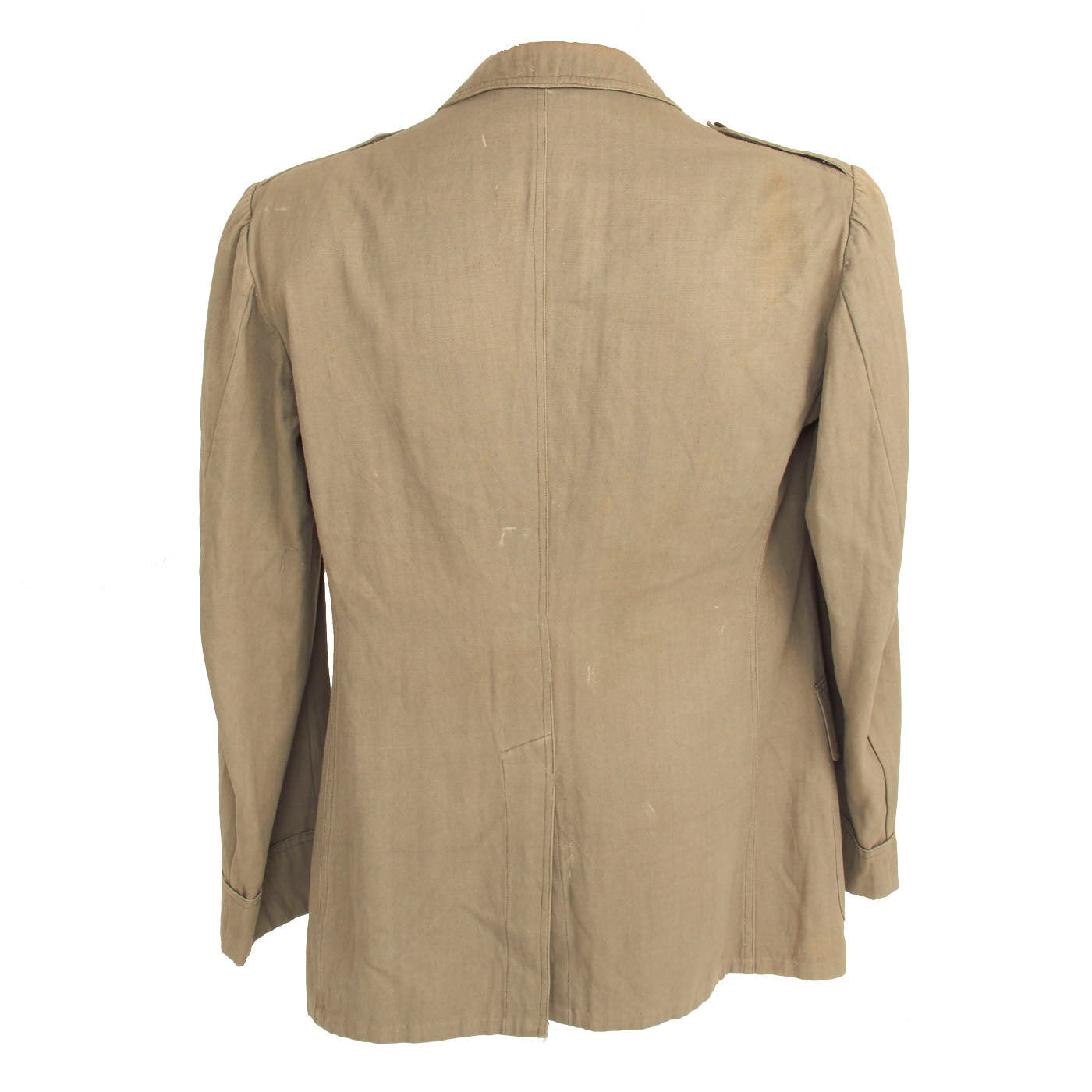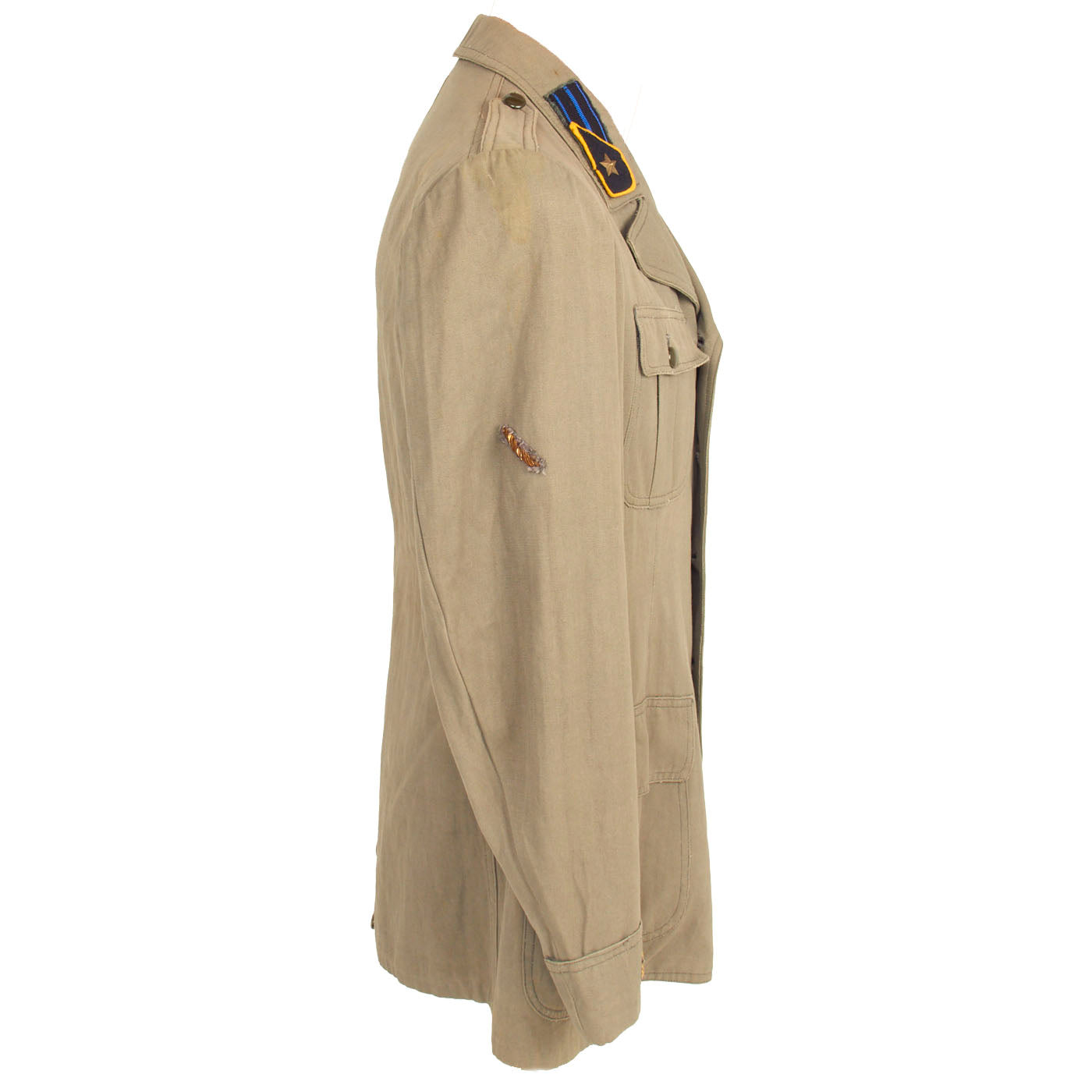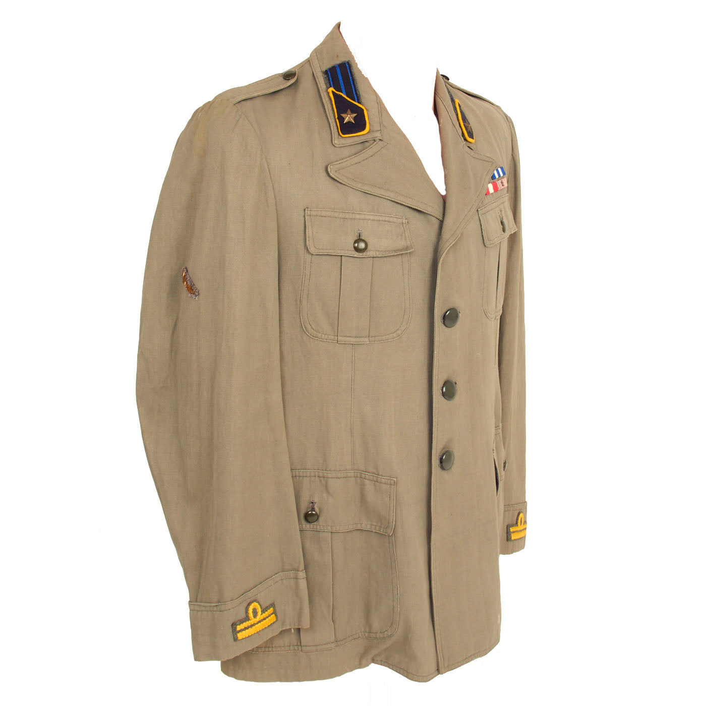 Original Item: Only One Available. World War Two Italian Army Officer Tropical jacket and pants constructed of green cotton. Lapel and sleeve rank insignia for Tenente (First Lieutenant). Single breasted design with four button front and four external pockets. Comes complete with stitched medal ribbons. Overall very good condition.