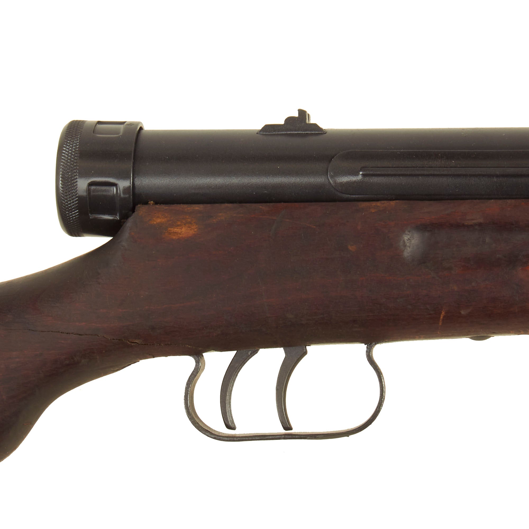 This example is in lovely condition, and has been repainted with our great "gunmetal gray" spray paint, giving it a great look. It has an intact front sling swivel on a rotating base loop, which are often missing. It also has the original cocking handle, complete with the dust cover for the right side of the action. The barrel is plugged at the front with a small piece of plastic, however we have checked the bore, and the barrel is still live, with an intact chamber, and actually has very good rifling still present. Both the front and rear trigger still pull correctly, and the safety is also functional as well.