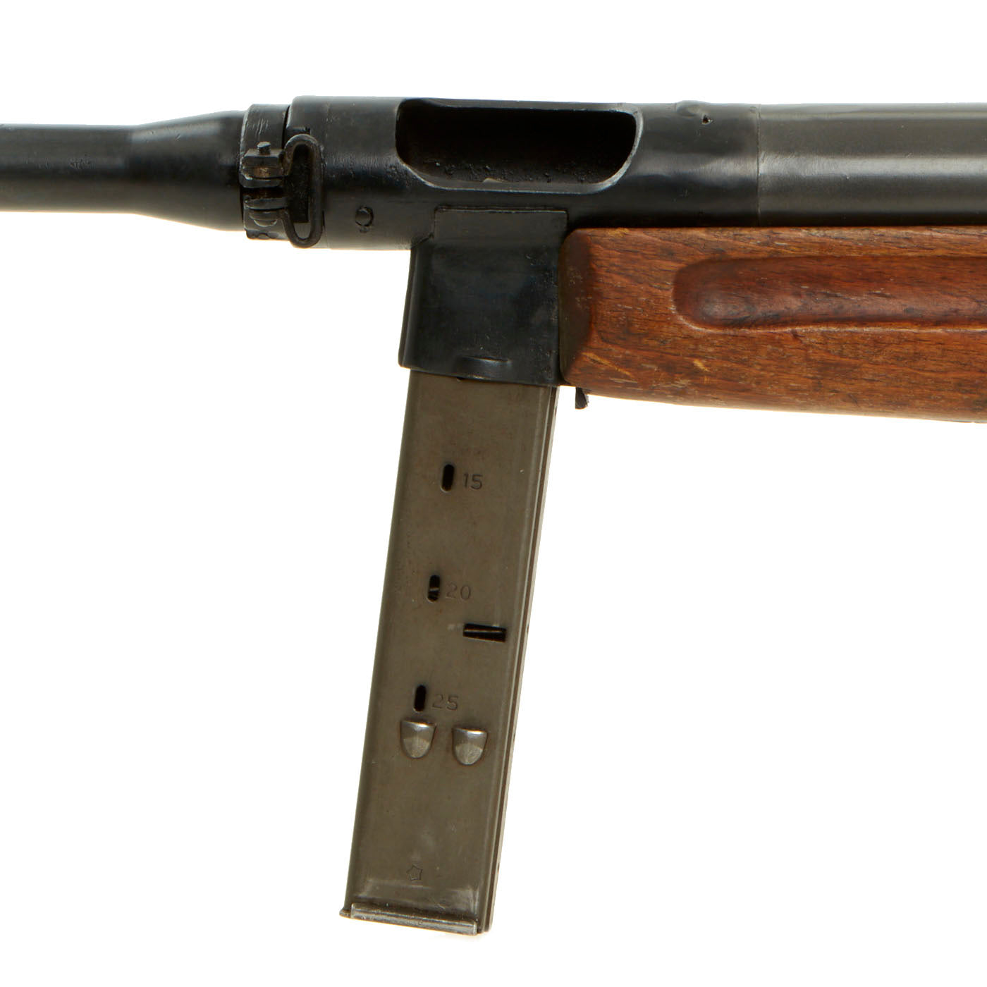 Arrives complete with wood stock assembly and 25 round UZI magazine, (magazine will be non-functional if ordered in a restricted State). As with all IMA display guns, this WW2 SMG has been converted to an inert non-firing display using a solid aluminum receiver as its base and then fully constructed with original WW2 Parts.