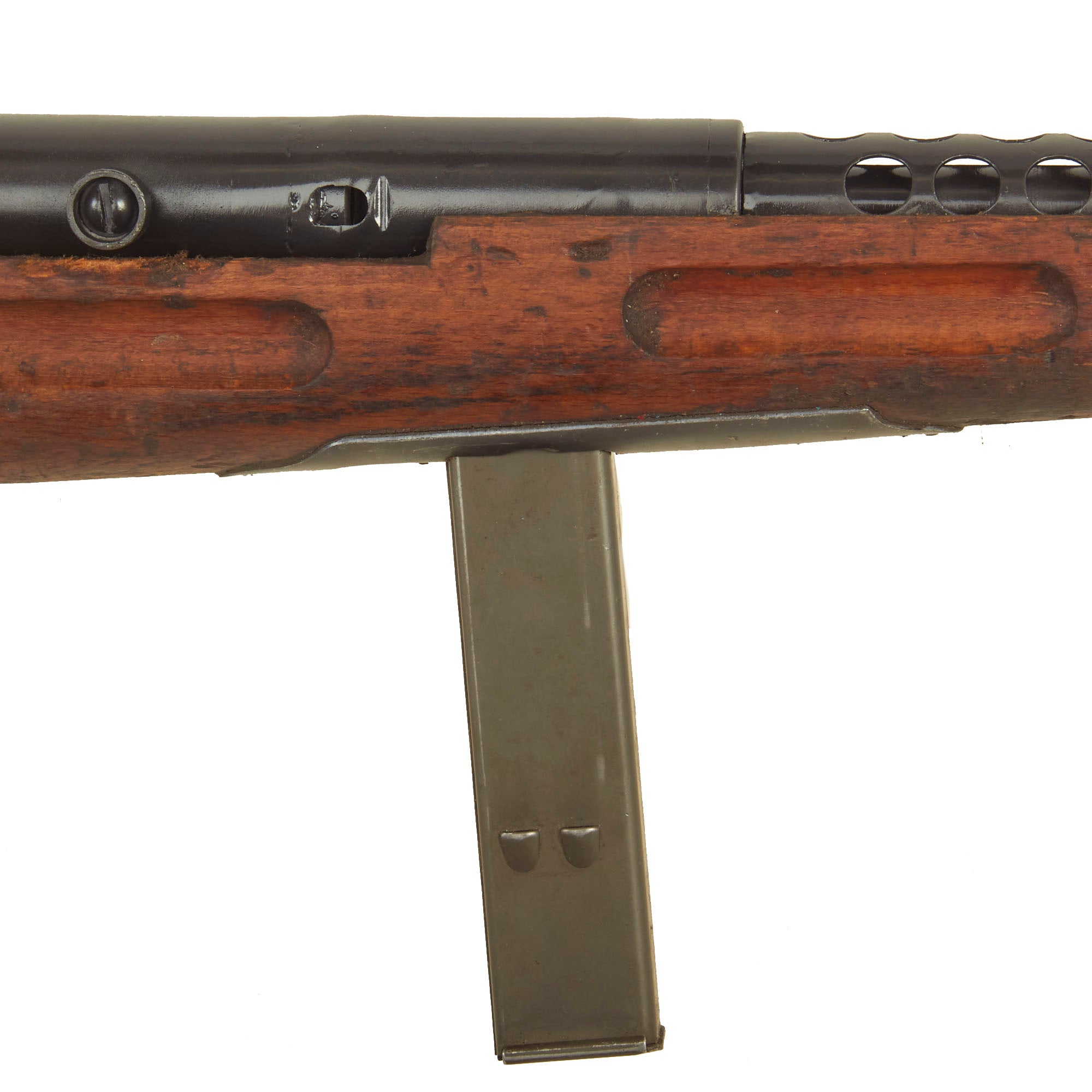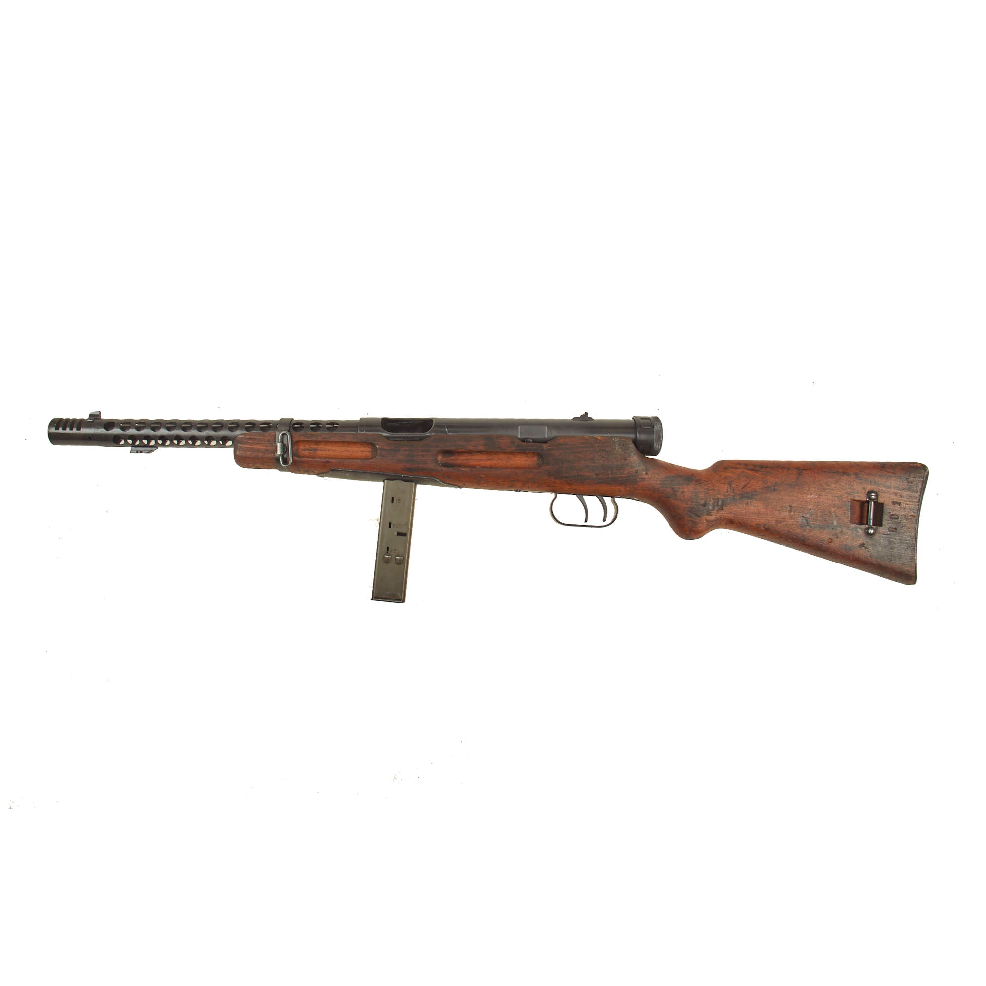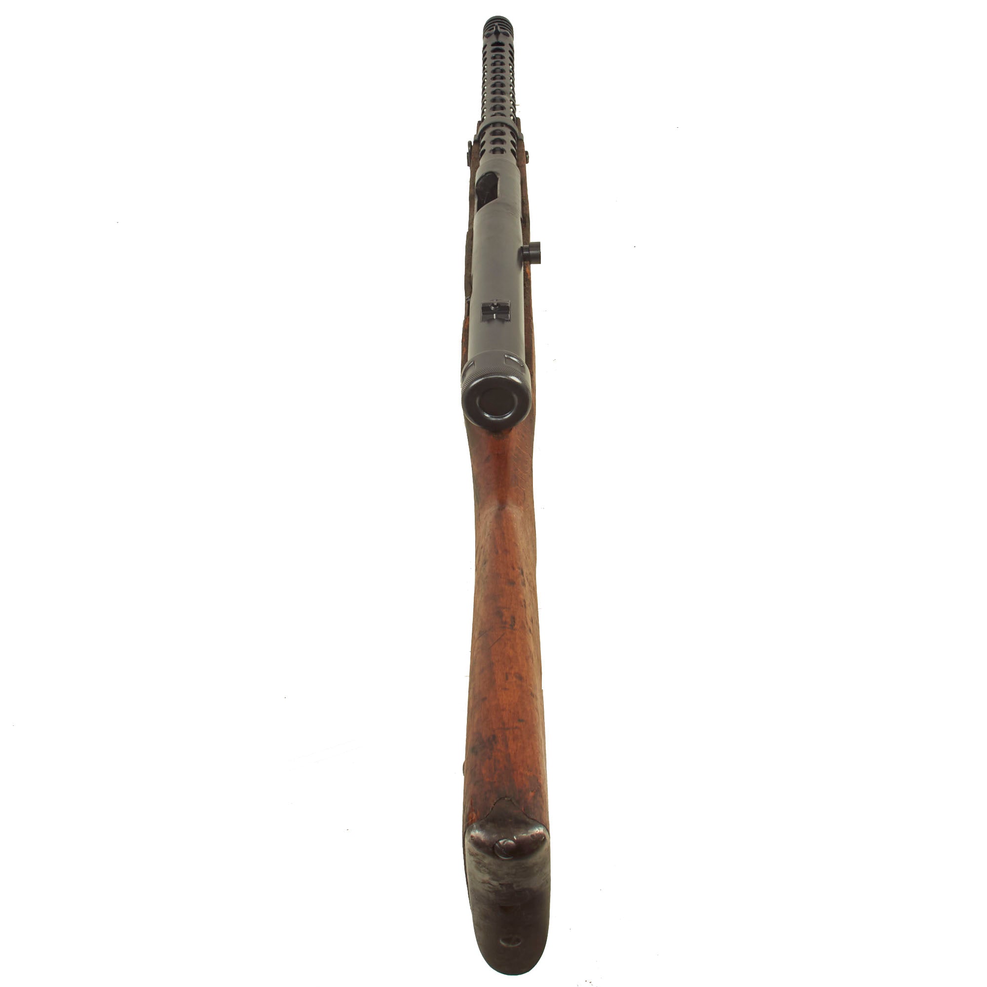 Though Italian manufactured by Beretta, these fantastic SMGs were used in great numbers by the German Wehrmacht throughout WWII. This example Still retains the original bayonet lug and slot for the rare folding bayonet. It also has an intact front barrel band and sling swivel, which are often missing. The barrel is plugged with wood at the front, but looks to not have been deactivated, however we cannot see what condition the bore is in. Both the front and rear trigger still pull correctly.