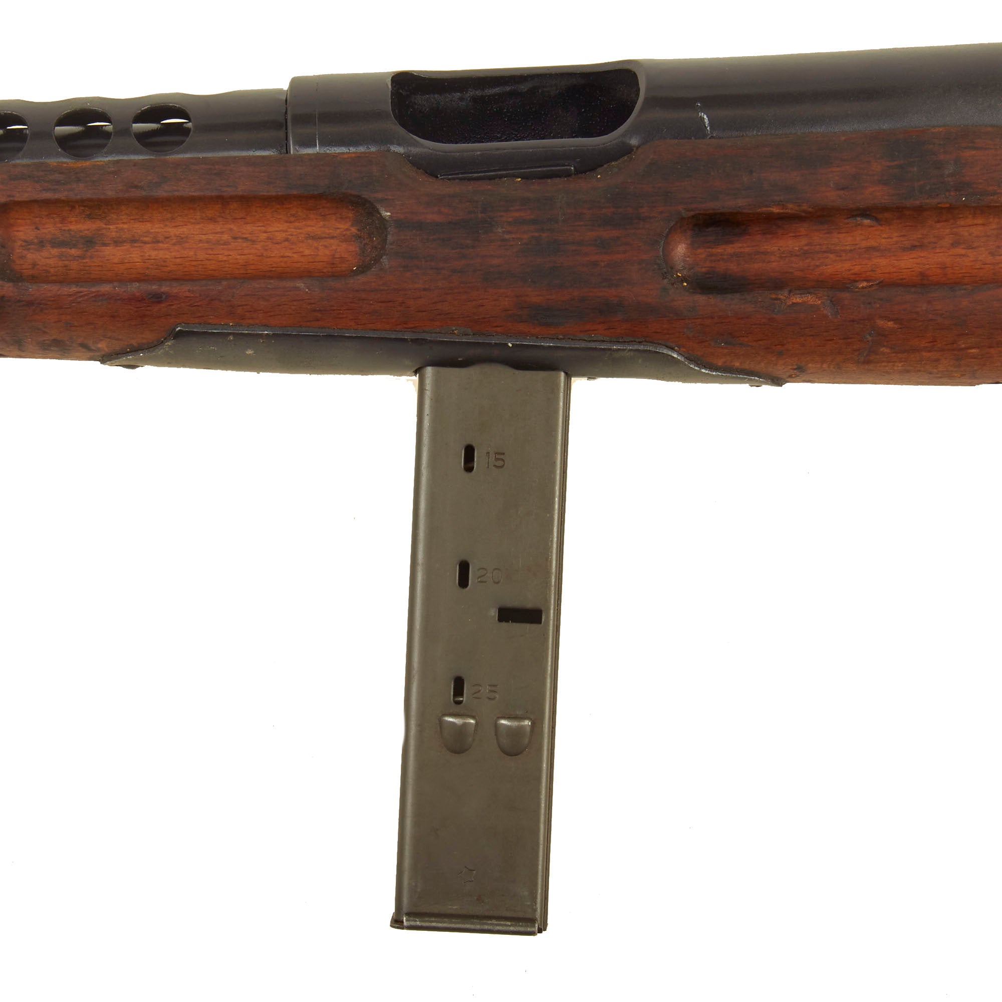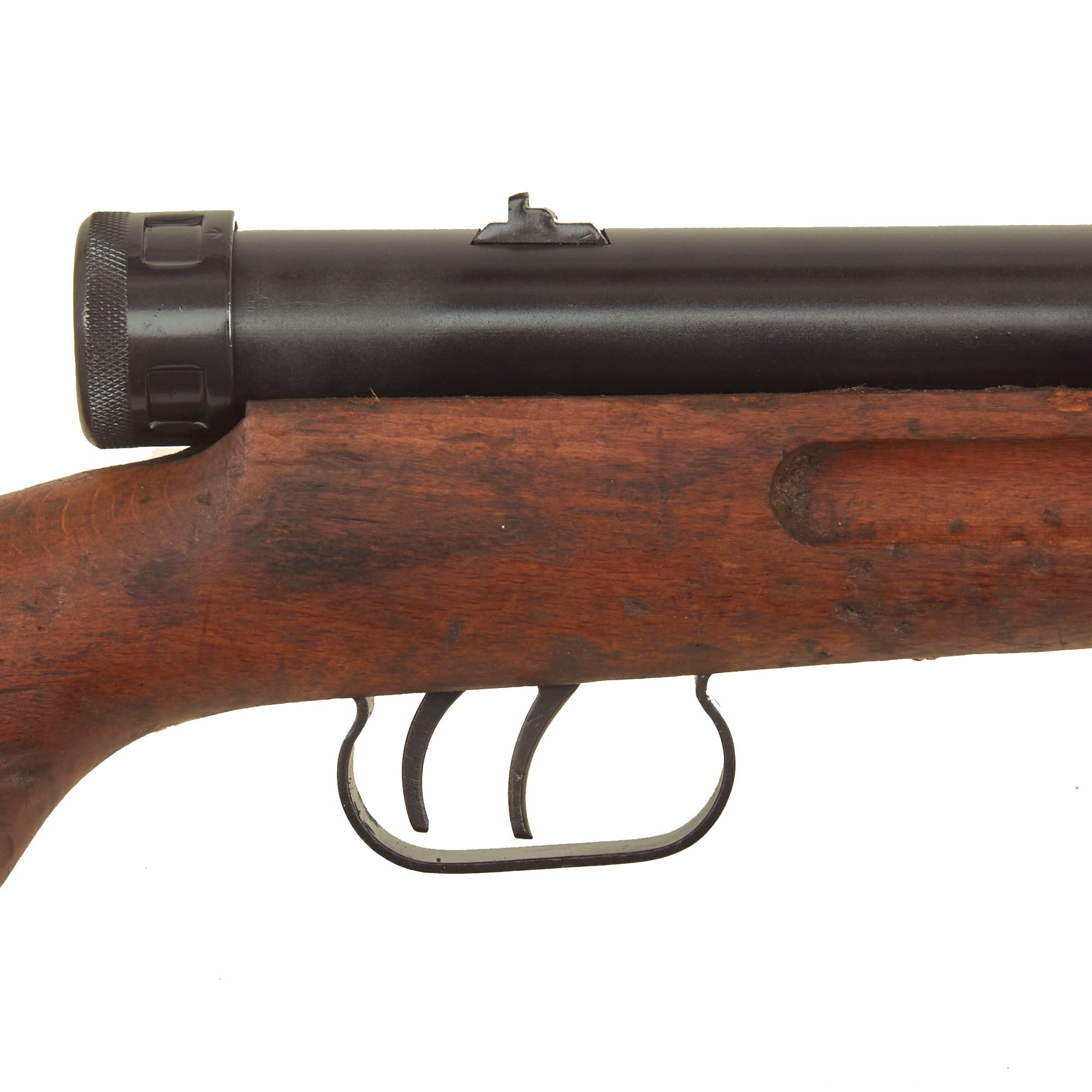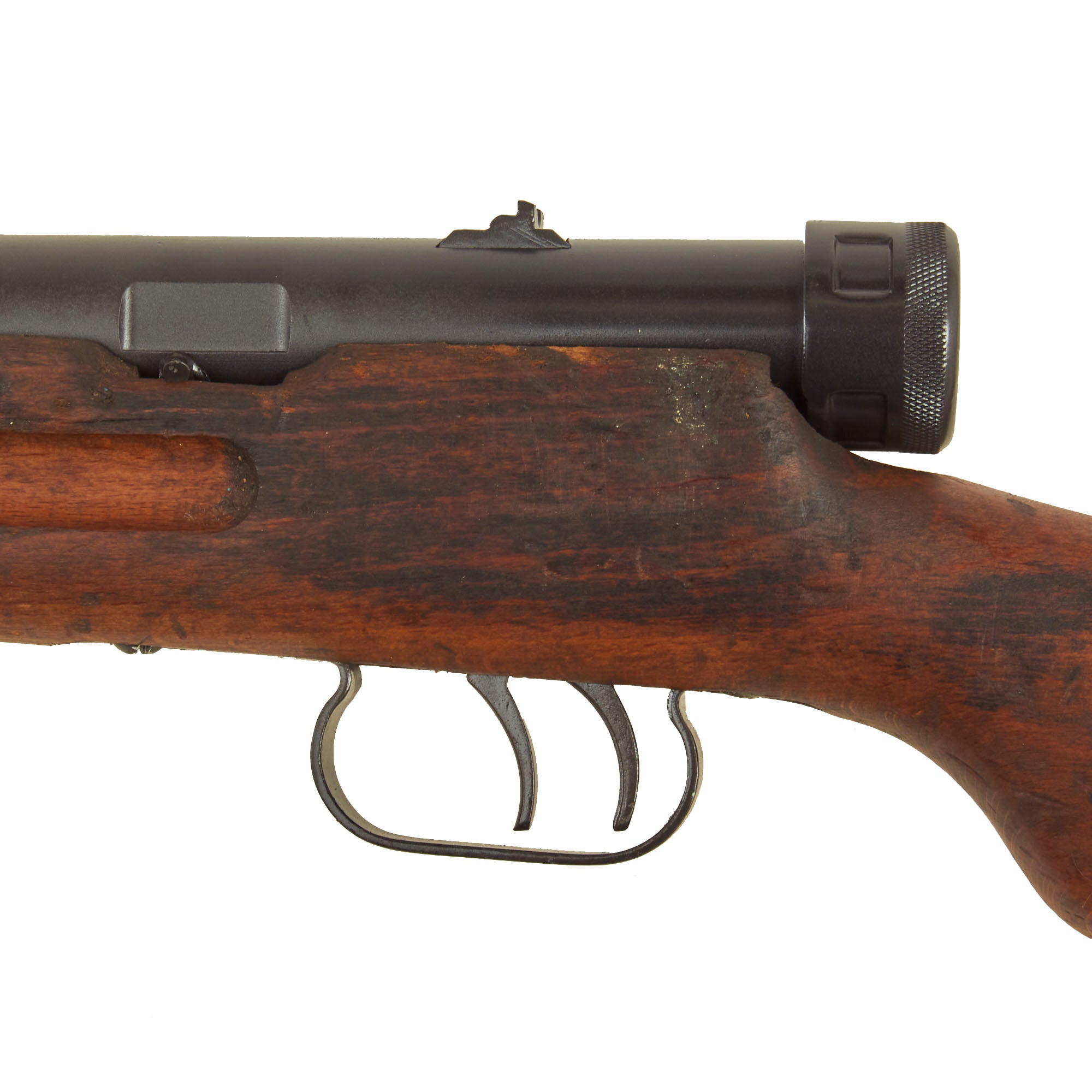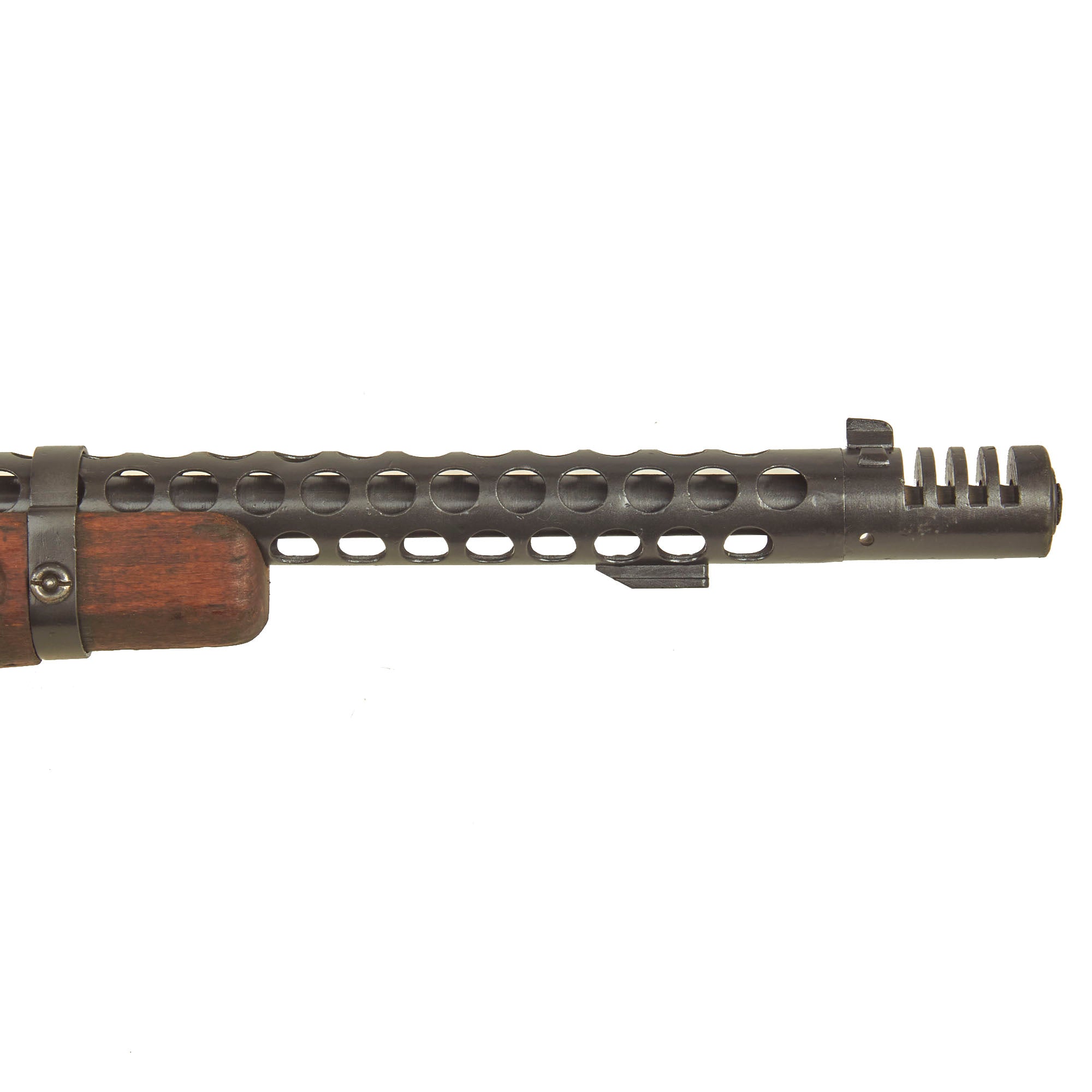 Though Italian manufactured by Beretta, these fantastic SMGs were used in great numbers by the German Wehrmacht throughout WWII. This example Still retains the original bayonet lug and slot for the rare folding bayonet. It also has an intact front barrel band and sling swivel, which are often missing. The barrel is plugged with wood at the front, but looks to not have been deactivated, however we cannot see what condition the bore is in. Both the front and rear trigger still pull correctly.