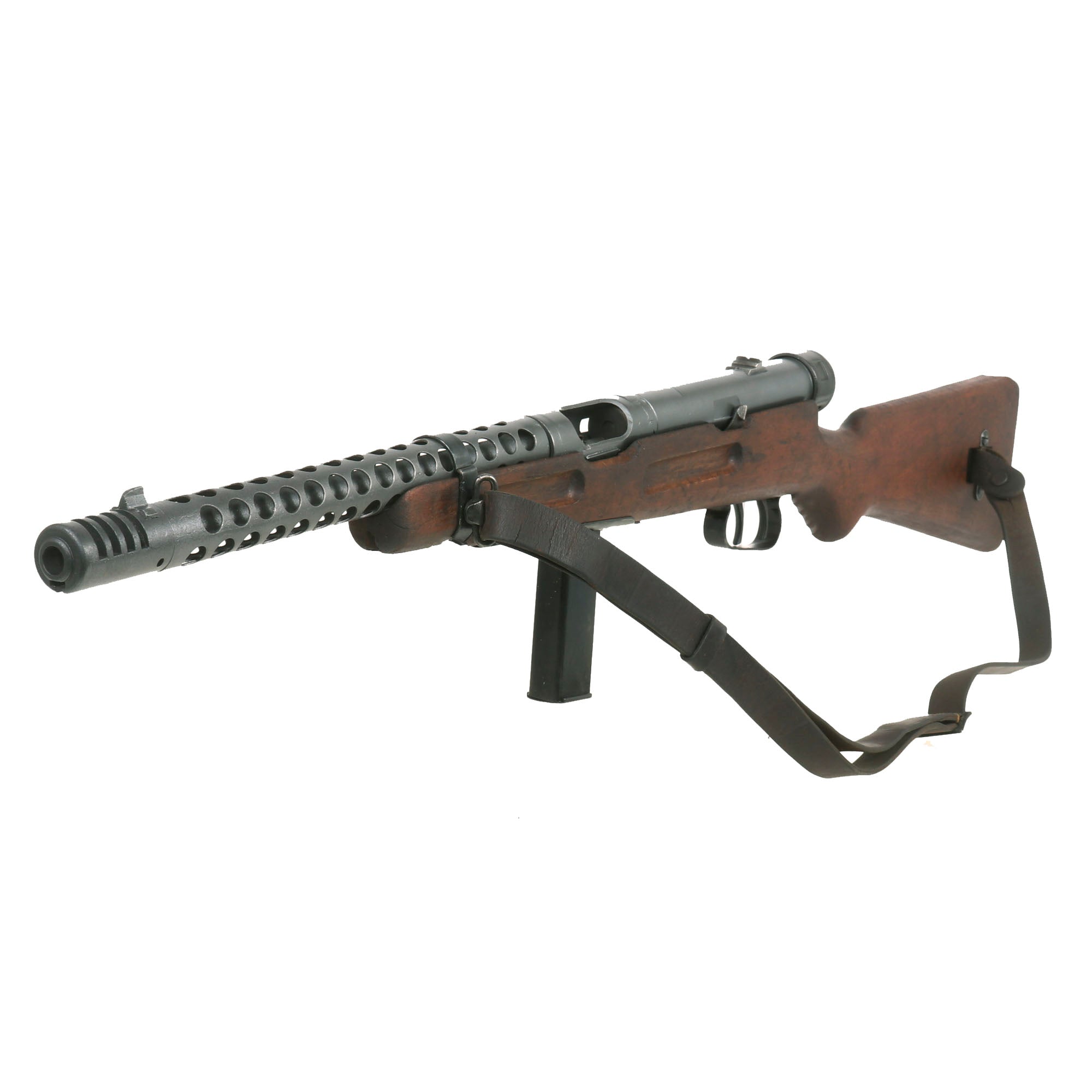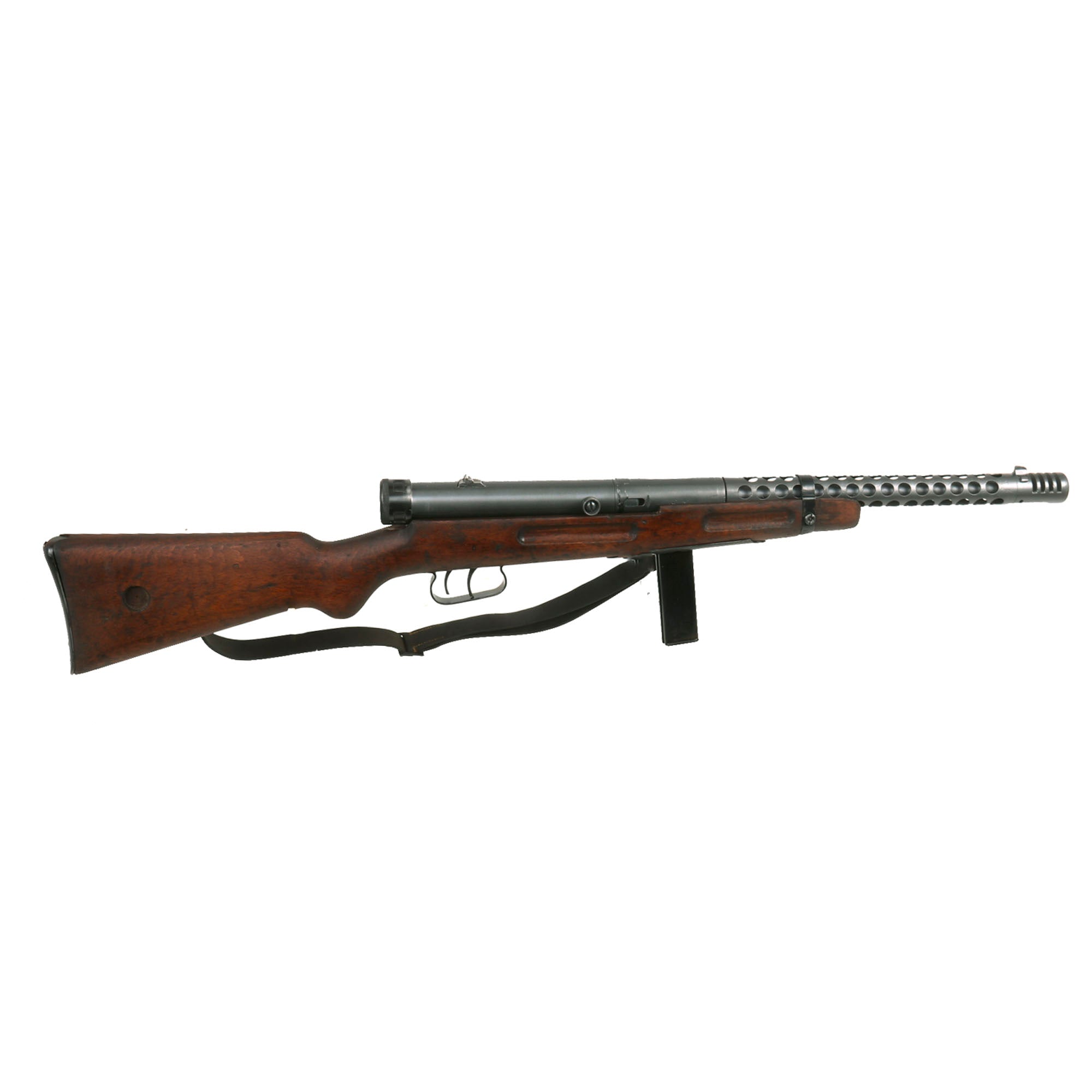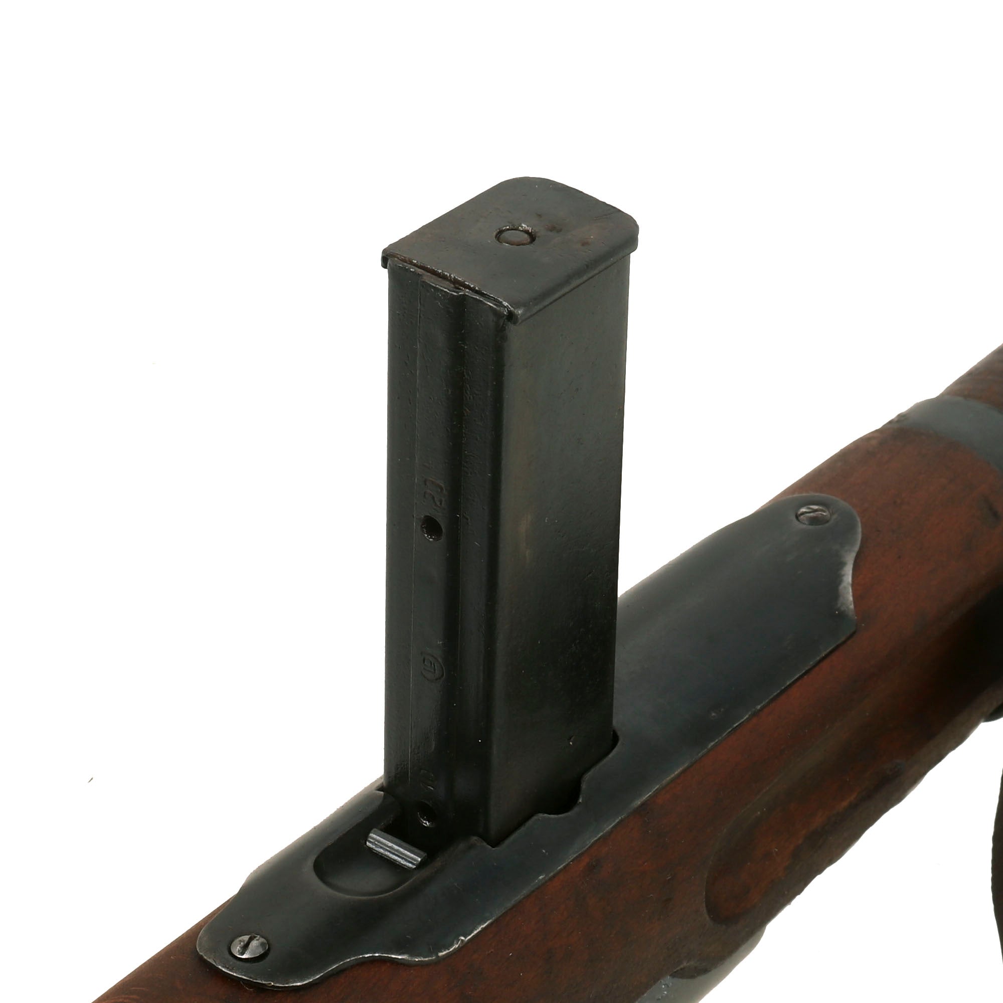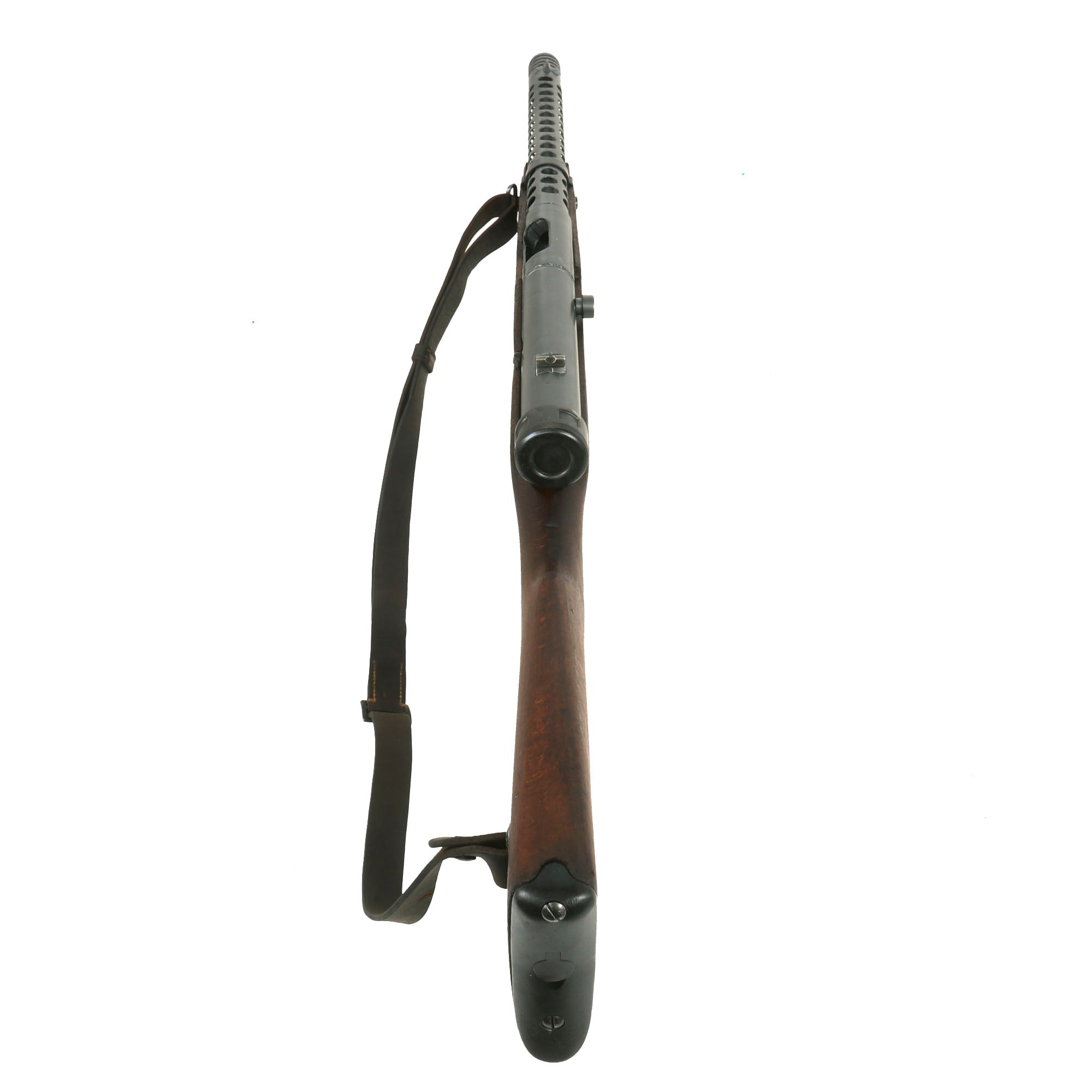 Though Italian manufactured by Beretta, these fantastic SMGs were used in great numbers by the German Wehrmacht throughout WWII. This example no longer has the bayonet lug on the front for the folding bayonet, but it does have the slot in the stock for one. It also has an intact front barrel band and sling swivel, which are often missing. Both the front and rear trigger still move, as does the safety. The barrel on this example is actually still live, with an intact chamber, though the rifling is a bit worn. It also has a great original sling fitted, which is in great shape!