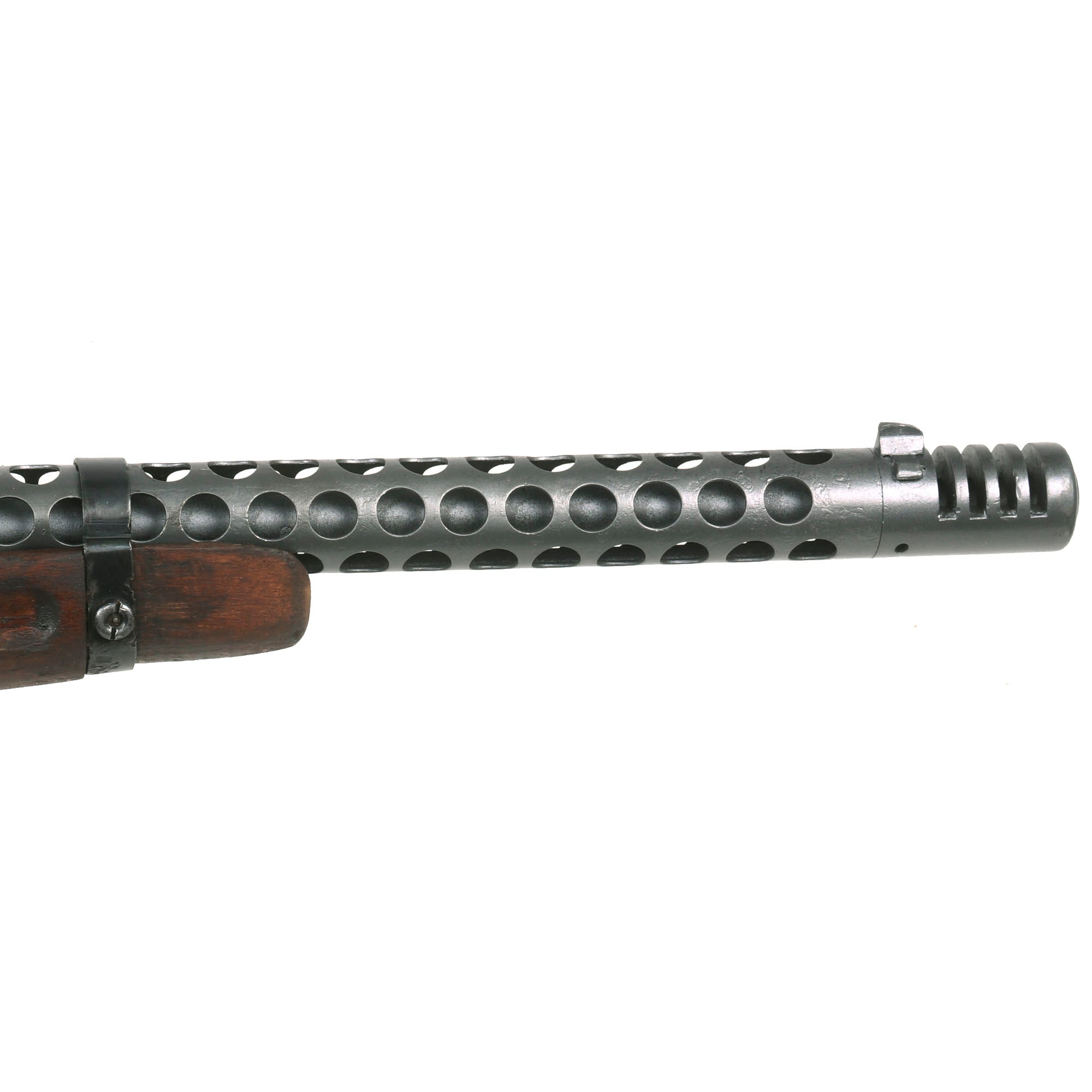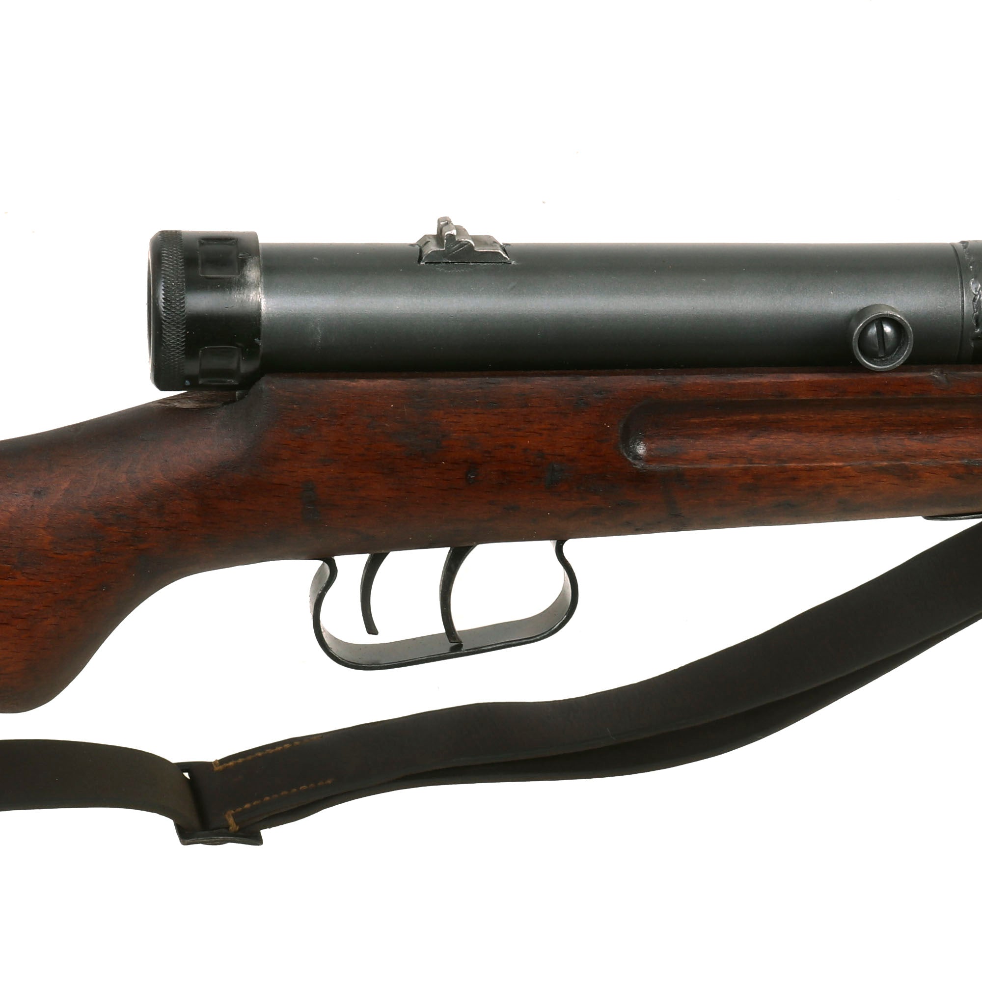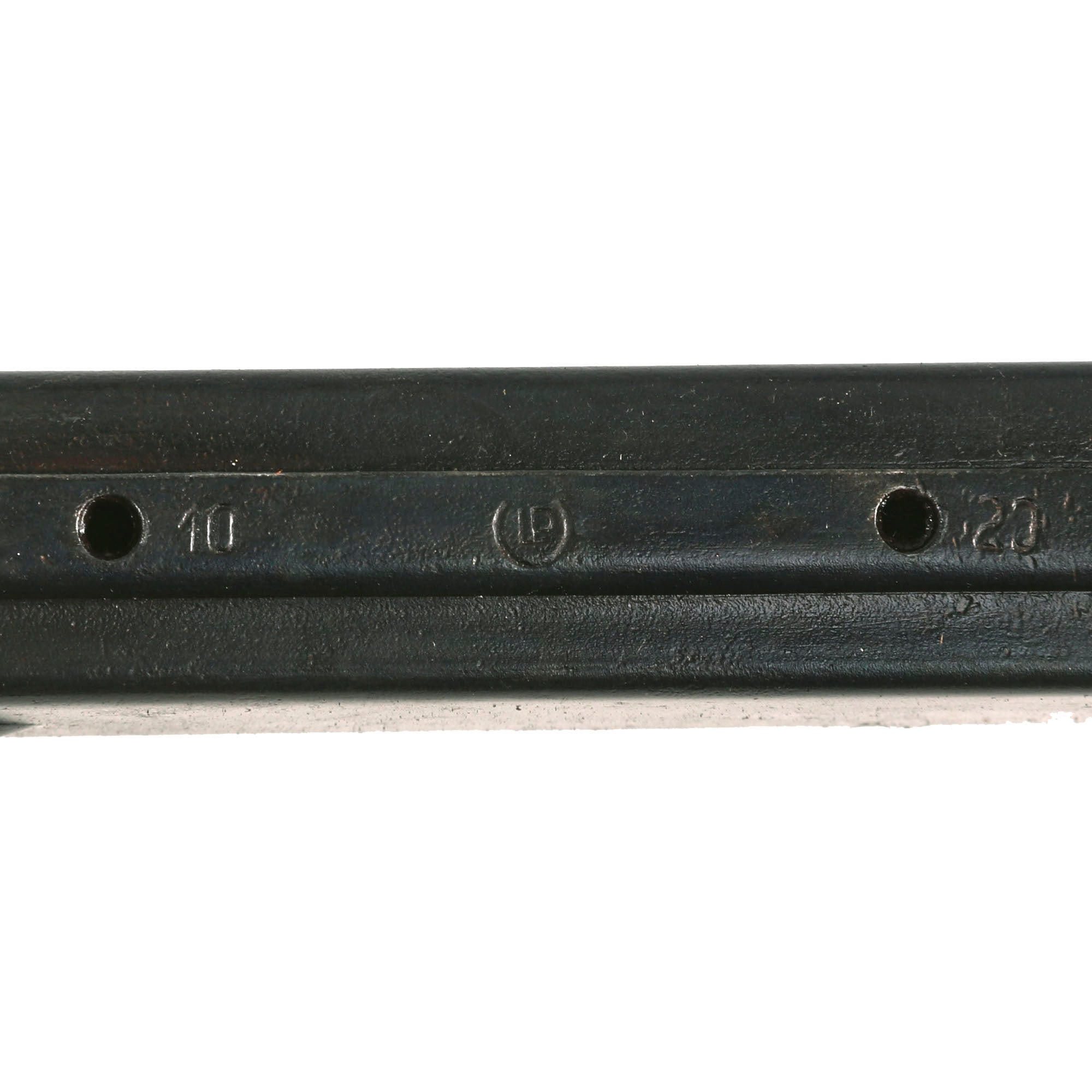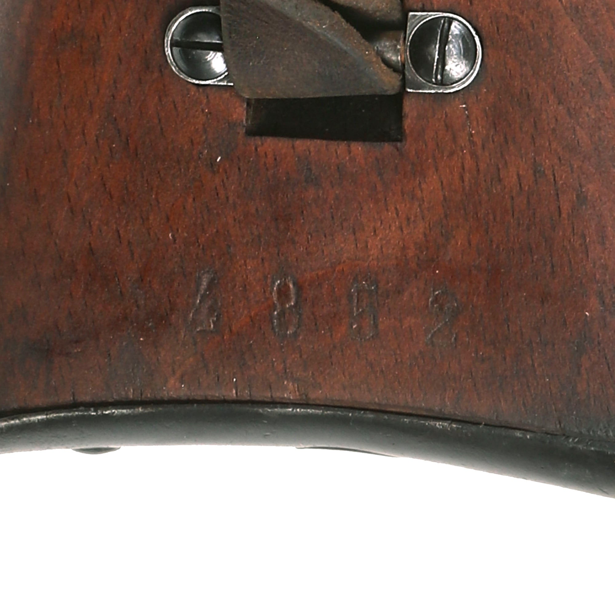 Though Italian manufactured by Beretta, these fantastic SMGs were used in great numbers by the German Wehrmacht throughout WWII. This example no longer has the bayonet lug on the front for the folding bayonet, but it does have the slot in the stock for one. It also has an intact front barrel band and sling swivel, which are often missing. Both the front and rear trigger still move, as does the safety. The barrel on this example is actually still live, with an intact chamber, though the rifling is a bit worn. It also has a great original sling fitted, which is in great shape!