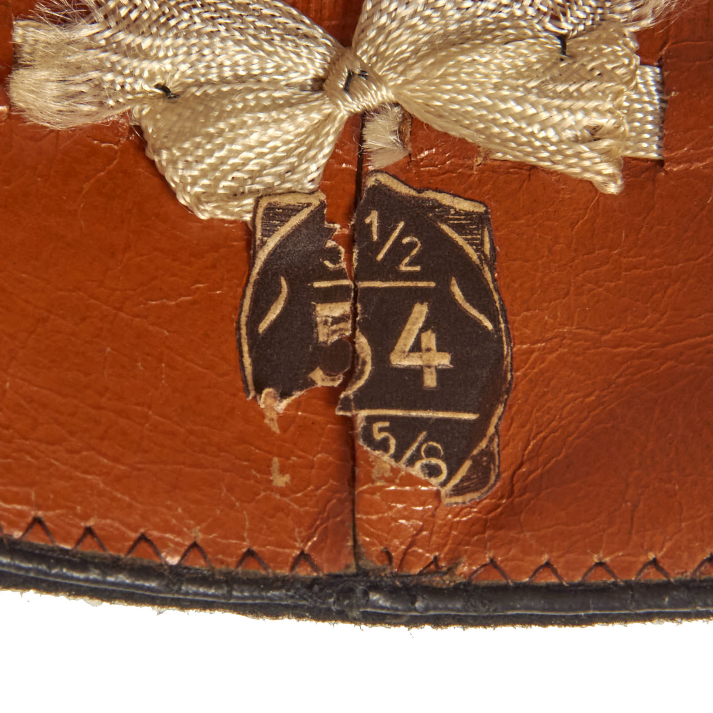 The side of the sweatband also has that same information present on it. The back of the sweatband where the stitching conjoins both pieces is the original size label: 54, which is unfortunately a partial tag.